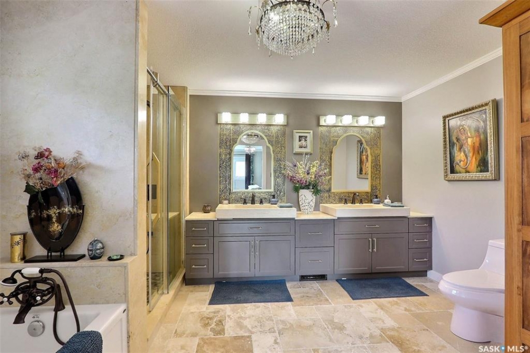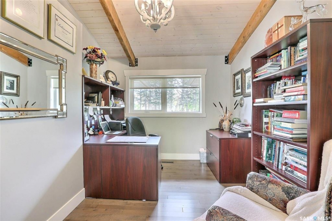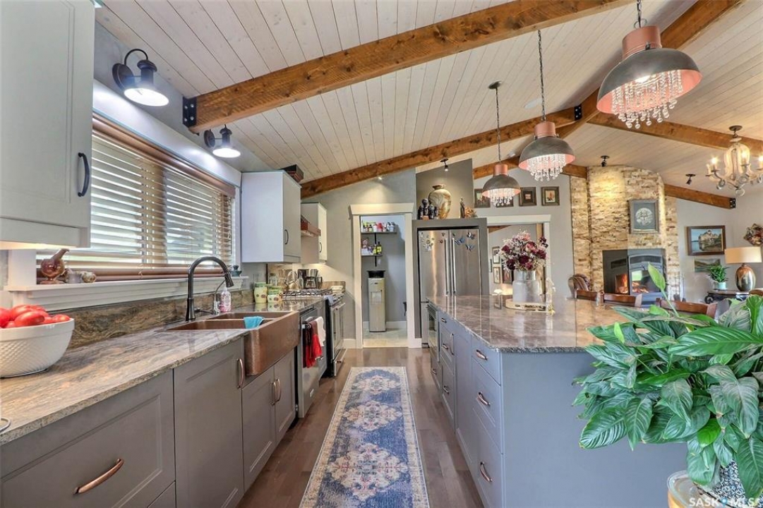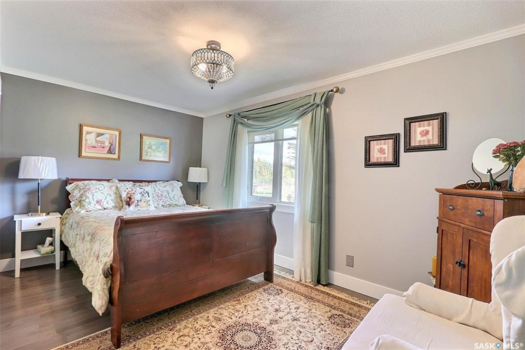 Once in a lifetime 10 acre estate in prestigious Madden Place neighborhood of Green Acres – fully updated & turn key! This extraordinary 3,466 sq/ft ranch-style bungalow offers unmatched luxury, privacy, and convenience just minutes from Prince Albert. Set on 10 beautifully landscaped acres with an additional 75 trees planted, this sprawling estate is truly one of a kind. Impeccably maintained and move-in ready, the home features 4 bedrooms plus a den, 4 bathrooms, and over 3,400 sq/ft of refined living space. The stunning great room showcases vaulted ceilings with exposed wood beams, wood burning fireplace, hardwood floors, and expansive windows that flood the space with natural light. The open-concept kitchen boasts two-tone cabinetry, granite countertops, a massive island, stainless steel appliances, and a butler's pantry. A second family room with cozy N/G fireplace and wet bar leads to an incredible sunroom with vaulted wood-beamed ceilings, wood burning fireplace, and wall-to-wall windows overlooking the grounds. The spacious primary suite offers a N/G fireplace, deck access with a gazebo, and luxurious 5-piece ensuite with full Travertine slabs in the shower and Travertine dual sinks. The home also includes a large laundry room with abundant storage and an inviting foyer with custom barn doors. Outdoor living is unmatched — enjoy an expansive patio done with paving stones, meticulous landscaping, fenced areas, and unmatched curb appeal. The property includes both an attached heated 26' x 28' double garage and a detached garage with two double doors and concrete floors. Additional highlights: city water, two natural gas fireplaces, two air conditioning units, newer vinyl windows, new 200-amp panel, central vac, electric hot water heater, weeping tile, fire-kill granite front step, and four fireplaces in total. A rare opportunity to own a truly perfection level estate — offering luxurious one-level living in one of Prince Albert's most sought-after locations.