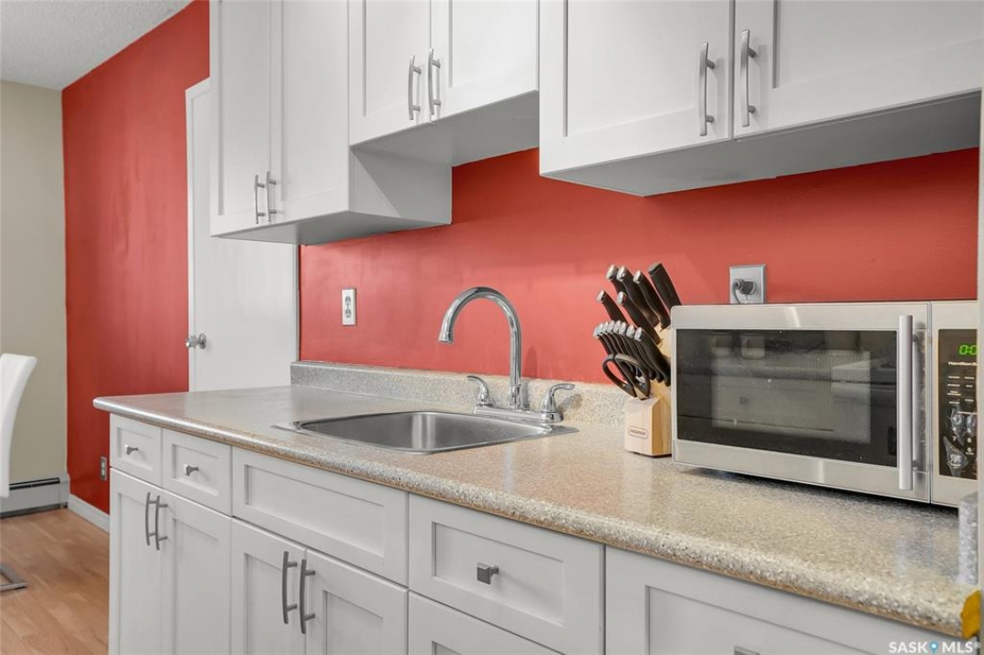 Are you looking for top-floor, corner-unit living, aka no noisy neighbours above you and way better natural light for your houseplants (or your gaming setup)? This bright and well-kept 2-bedroom, 1-bath condo in Tiffany Place offers 760 square feet of easy living with quick possession available, so you can be unpacking before your next rent payment is due. The updated kitchen has refreshed cabinetry and plenty of room for takeout containers and actual cooking. The open living area is filled with sunshine from the west-facing balcony. It's the perfect spot for sunsets, study breaks, or convincing your friends you're thriving at adulthood. Wall-mounted A/C keeps things cool all summer, and the in-suite storage room handles everything from camping gear to your “someday” treadmill. You'll have your own electrified parking stall, so no more winter extension-cord acrobatics or endless street-parking searches. The building is quiet, clean, and ideal for anyone who wants low-maintenance living with zero drama. East College Park is one of Saskatoon's most underrated areas. It's family-friendly, close to the U of S, and just minutes from 8th Street's shopping, groceries, and coffee options. Plus, Circle Drive is right nearby for quick access anywhere in the city. If you've been looking for your first place, your freedom pad, or just an escape from landlord life, this one hits all the right notes. Affordable, comfortable, and completely move-in ready, it's basically the adulting upgrade you've been waiting for. Book your private showing and see what all the fuss is about!