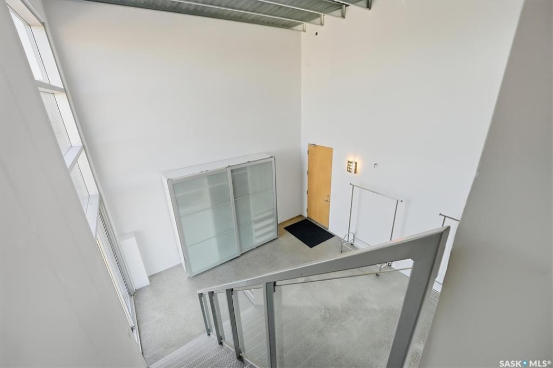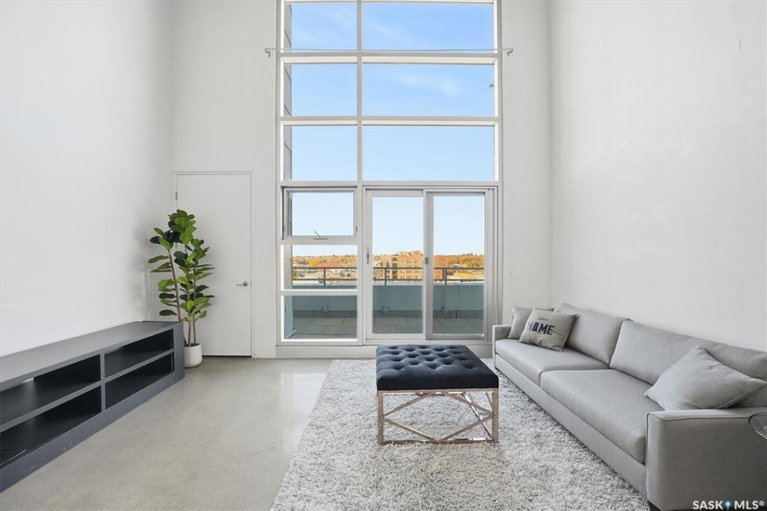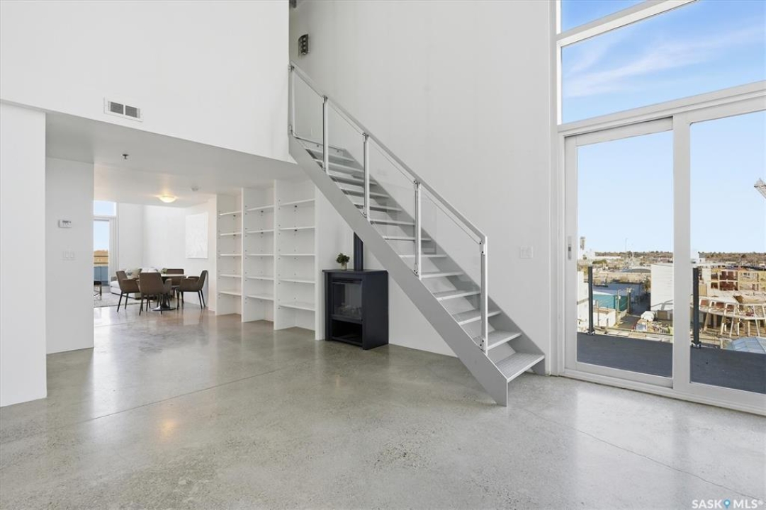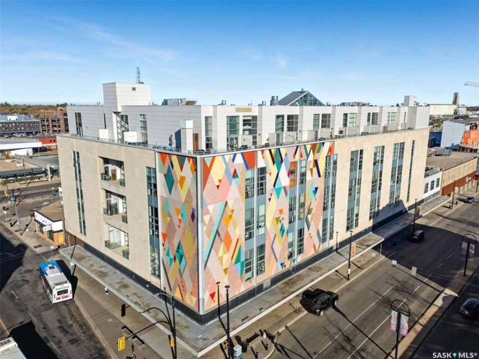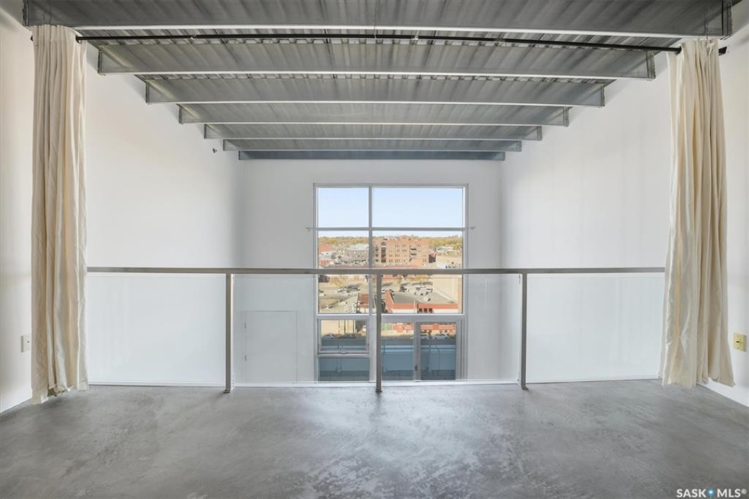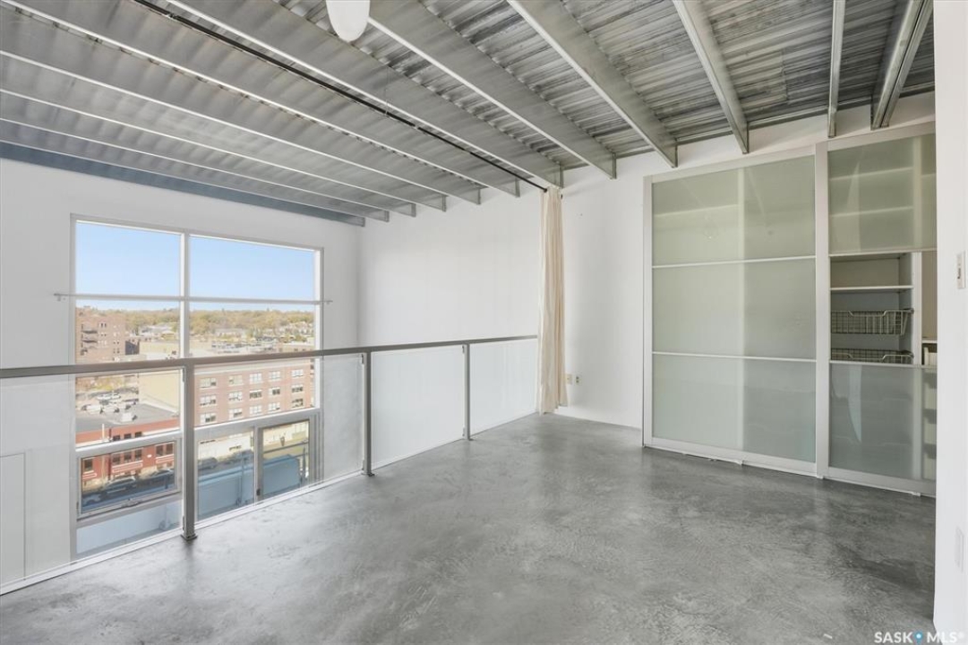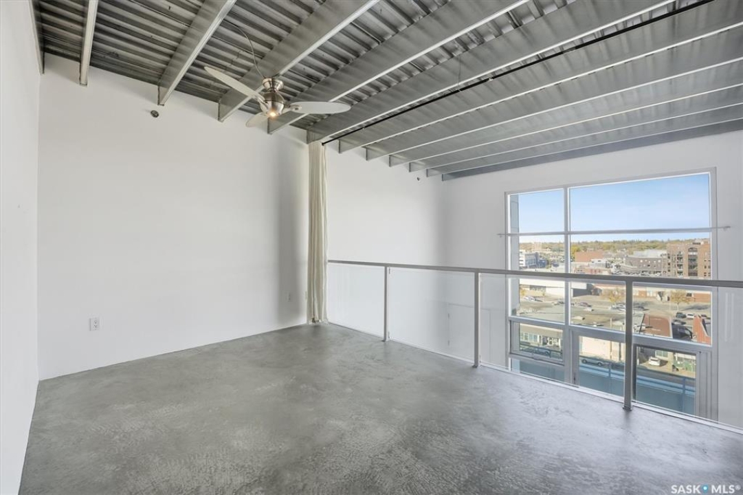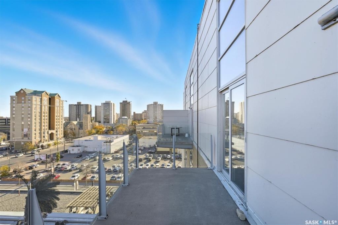 Top floor CORNER unit with massive wrap around balcony overlooking the city sky line! Welcome to the 2nd Avenue LOFTS where modern downtown living meets comfort and architectural character. This spacious 1,075 sq. ft. loft-style condo offers an open-concept layout with soaring ceilings, large windows, and a wraparound balcony that provides sweeping views of downtown Saskatoon. The highlight of this home is the large wraparound balcony overlooking Saskatoon's new central library and the proposed new rink and event venue — the perfect spot to enjoy your morning coffee while taking in the energy and excitement of Saskatoon's downtown revitalization. Located on the exclusive fifth floor—the only level equipped with central air conditioning—this unit ensures year-round comfort. The interior features polished concrete floors, a bright and functional kitchen, and a generous bedroom suite with a four-piece bath. This units updated kitchen includes brand new stainless steel kitchen appliances. A tandem underground parking for two vehicles is included for convenience and security. The installing of a vehicle lift is permitted as well (with board approval). The 2nd Avenue Lofts building offers residents access to excellent amenities, including a fully equipped gym, a recreation area with ping pong tables, a modern meeting room, and one of the best roof top patio areas (located on 3rd level) in the city. Situated in the heart of the Central Business District, you'll be steps away from restaurants, shopping, and the river valley trails. A unique opportunity to own one of the most desirable units in this sought-after building.