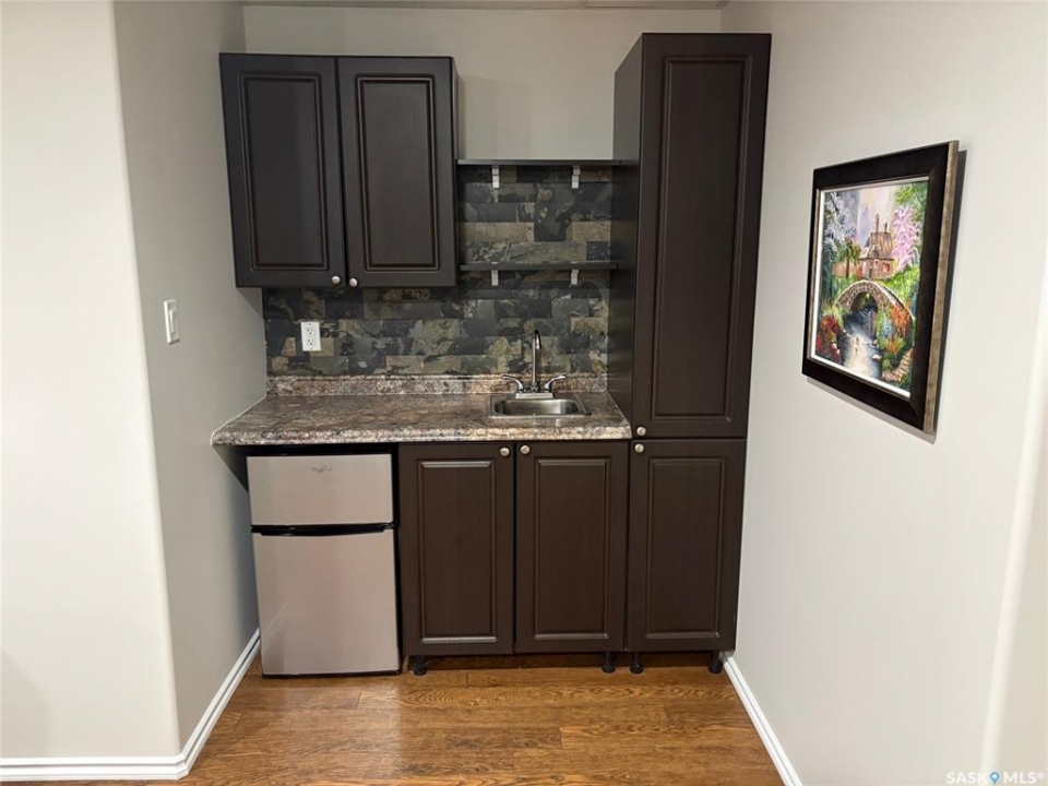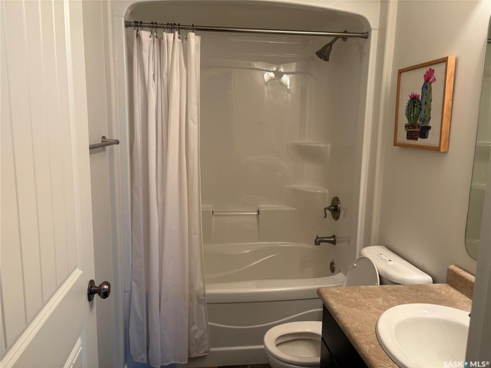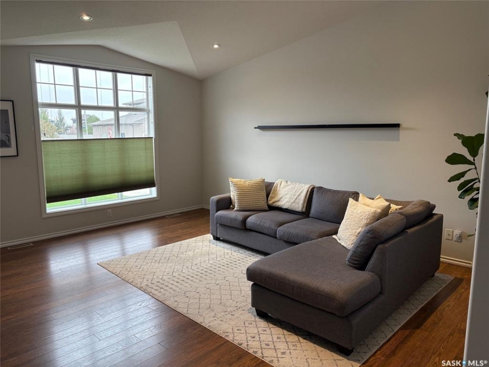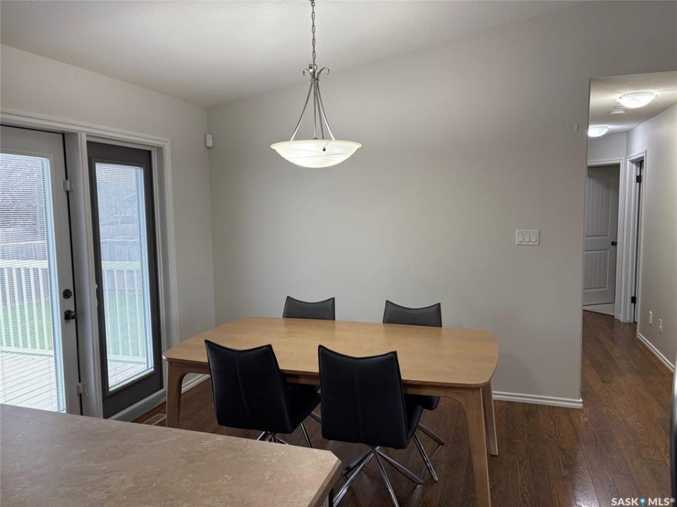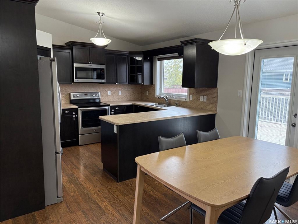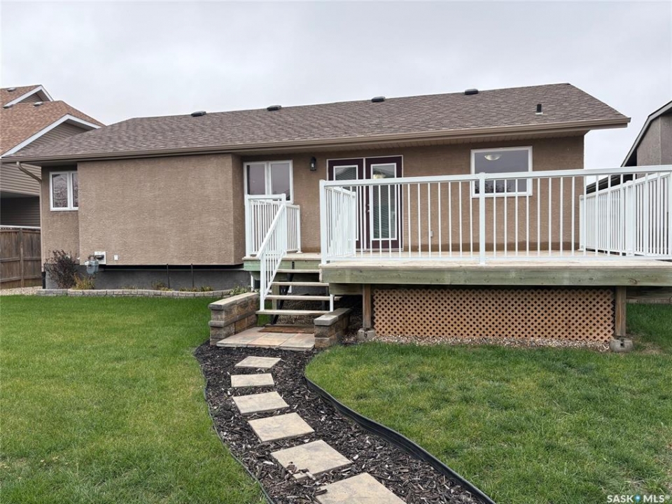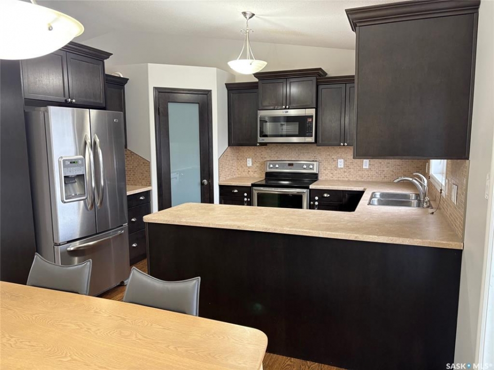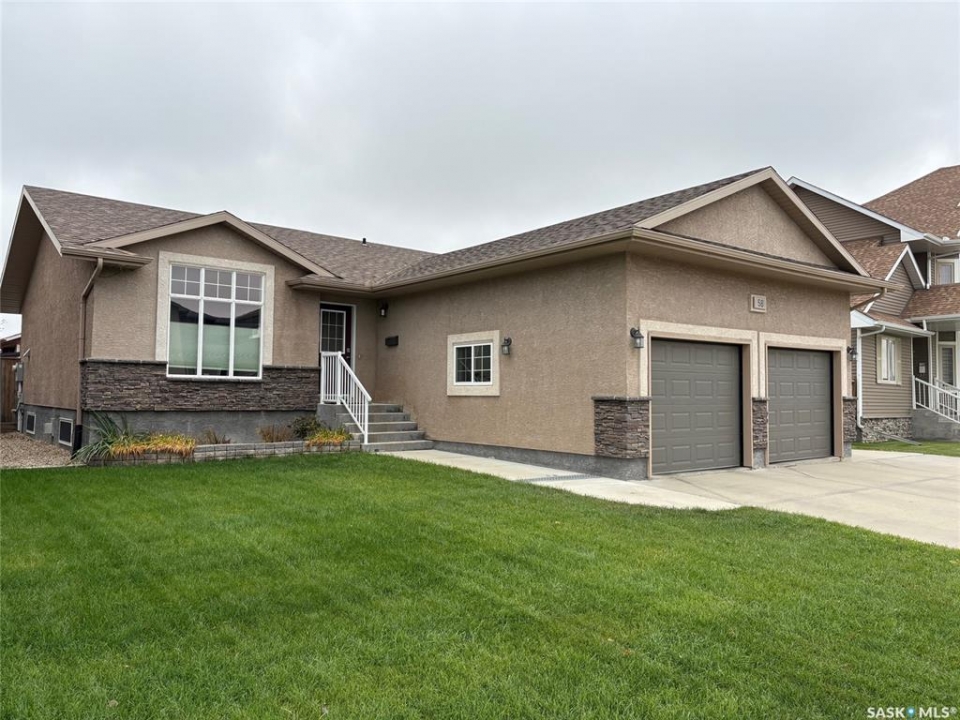 Don't Miss This Stunning Custom Bungalow in Yorkton's Sought-After Riverside Grove Subdivision! This beautifully maintained 5-bedroom, 3-bathroom home offers 1,338 sq. ft. of bright, open-concept living space designed for comfort, style, and functionality. Step into a dream kitchen featuring espresso-stained maple cabinets, a convenient corner pantry, tile backsplash, and included appliances — ideal for everyday living or entertaining guests. The adjacent dining area opens through garden doors to a west-facing deck, perfect for enjoying sunsets and backyard gatherings. You'll love the thoughtful details throughout: modern light fixtures, rich flooring, and tasteful paint choices that make this home feel like new. The primary bedroom boasts a spacious walk-in closet and a private 3-piece ensuite for your comfort. The fully finished lower level offers even more space with a large family room complete with a cozy gas fireplace, a wet bar, and a designated games area. You'll also find two large bedrooms, a full bathroom, a den/office space, and ample storage. The utility room is neatly tucked away for convenience. Outside, enjoy the mature, landscaped yard from your large deck with aluminum railings, or take advantage of the oversized driveway and double attached garage. Additional features include central air, central vac, and a fantastic location near parks, walking trails, and all local amenities. This is the perfect move-in-ready home for a growing family in one of Yorkton's most desirable neighborhoods.