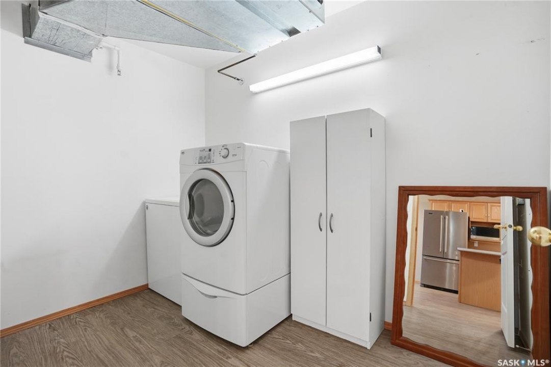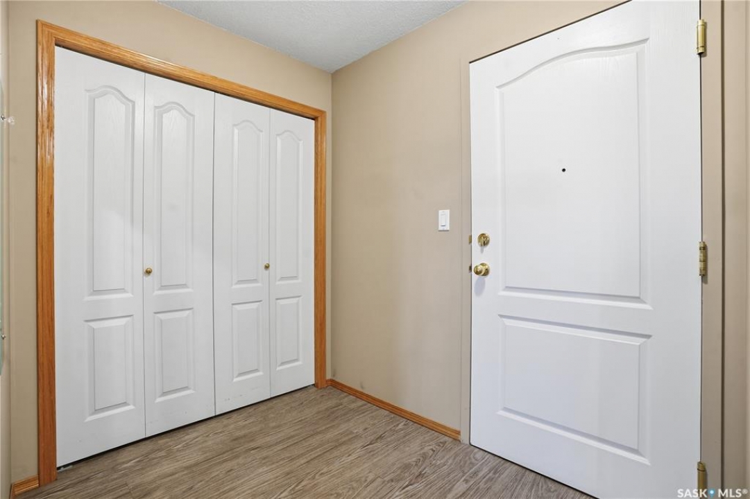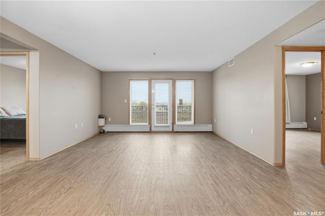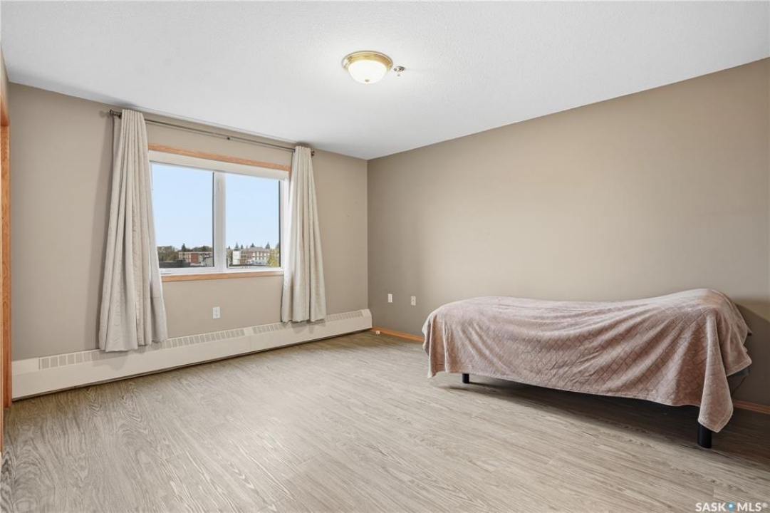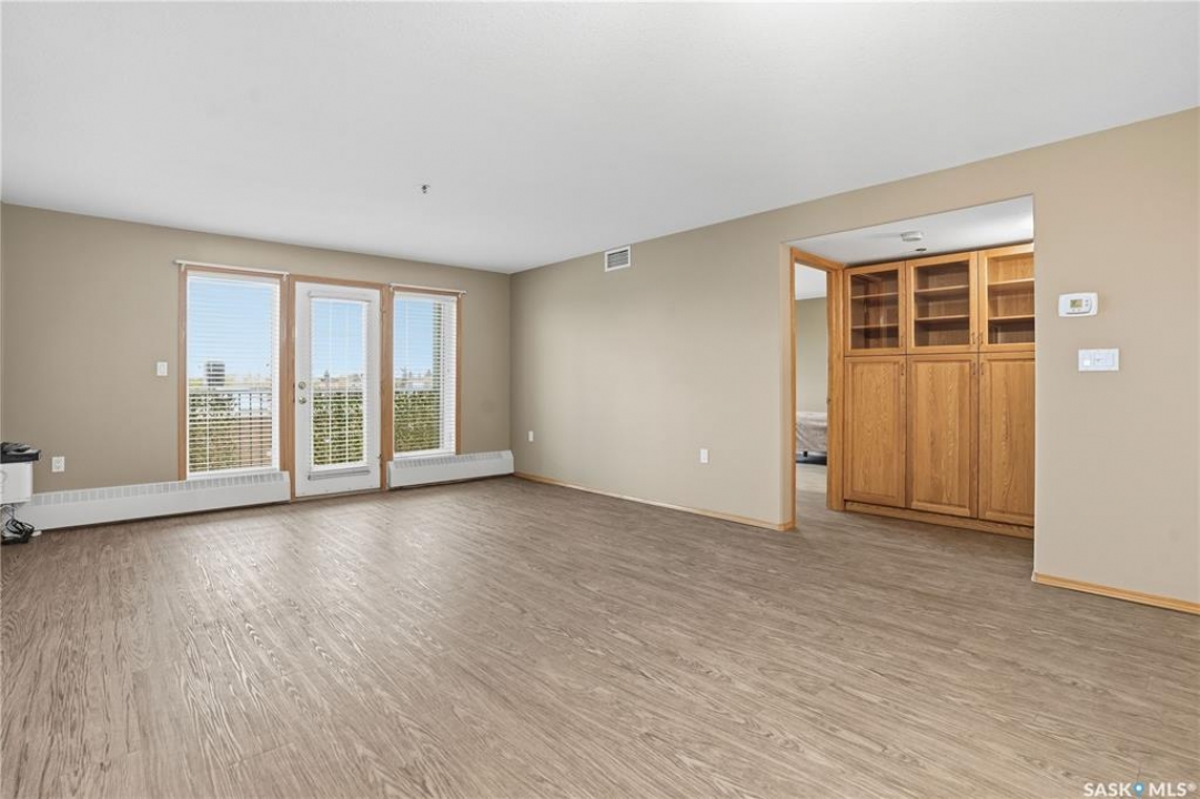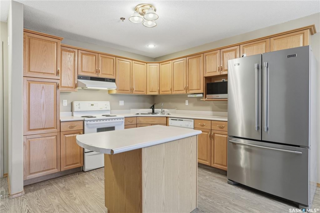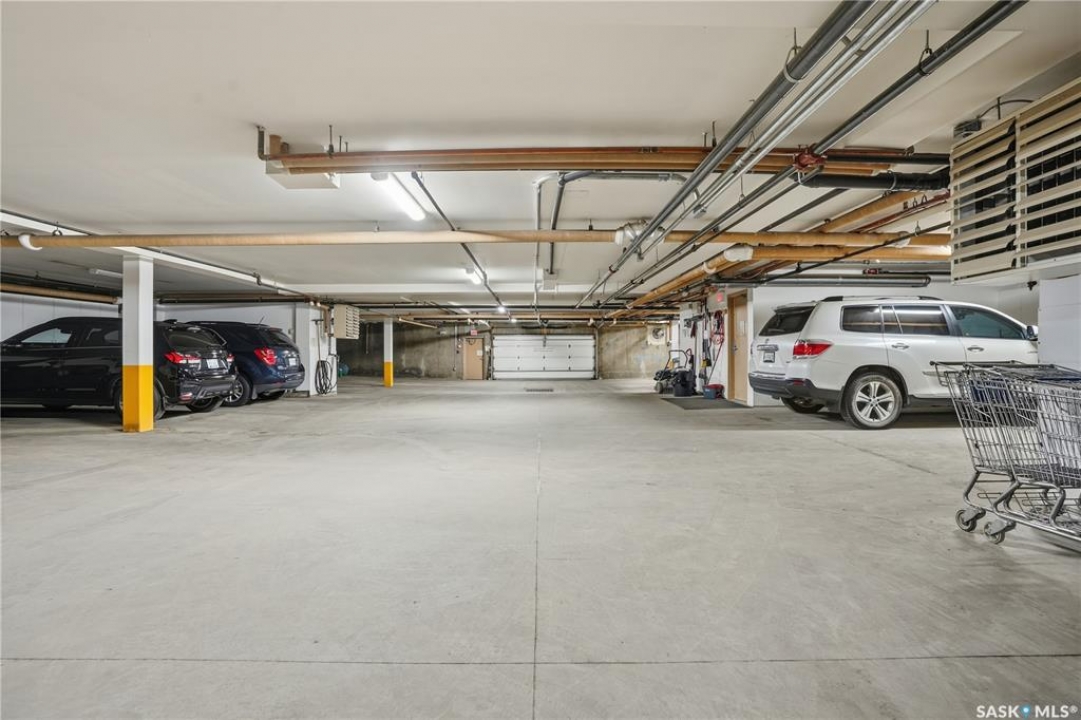 Welcome to this spacious and beautifully maintained 2-bedroom, 2-bathroom condo, ideally situated just steps from amenities and public transit. Step inside to a bright, open-concept living, dining, and kitchen area that's perfect for both relaxing and entertaining. The functional kitchen offers plenty of counter and cabinet space, making meal prep a breeze. Enjoy the comfort of upgraded vinyl plank flooring that flows throughout the main living areas, adding a modern and stylish touch. The primary bedroom features plenty of closet space and an ensuite complete with a sleek new walk-in shower. A second bedroom and full bathroom provide excellent space for guests or a home office. Additional highlights include in-suite laundry, central air conditioning, and a large private balcony—perfect for morning coffee or evening sunsets. You'll also appreciate the convenience of heated underground parking, especially during Saskatchewan winters. Condo fees include heat and water, offering excellent value and peace of mind. Located within a block of shopping, restaurants, and a bus stop, this home combines comfort, convenience, and low-maintenance living.