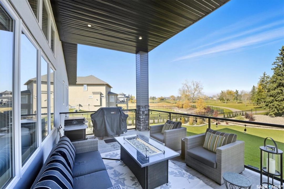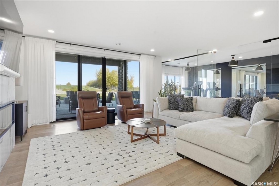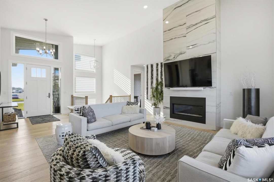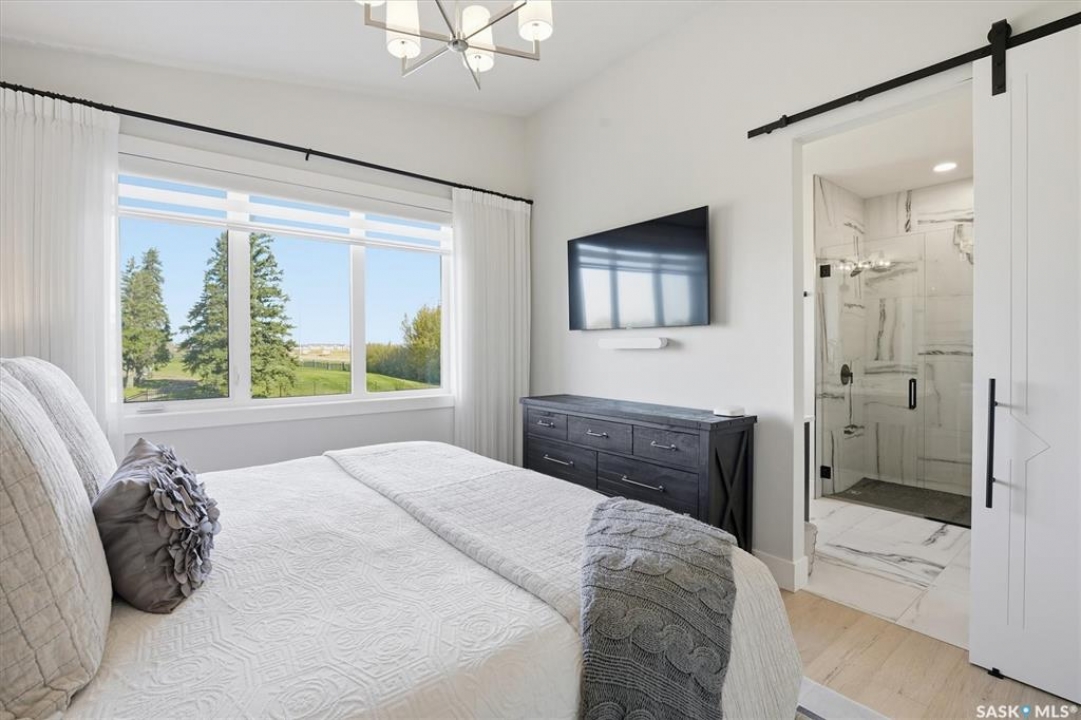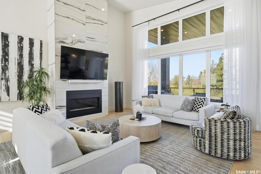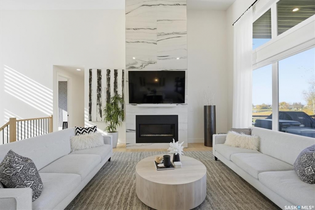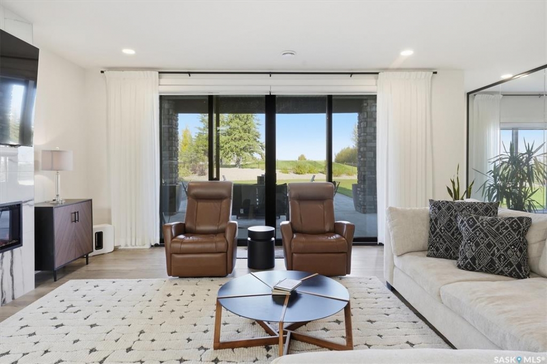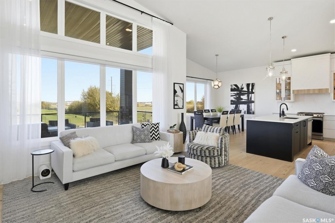 Absolute Stunner! Designer custom D&S Homes walkout bungalow, crafted with precision and showcasing an award-winning floor plan. Offering 1,694 sq' on main plus a fully dev walkout basement, this 4-bed, 3 bath home is set on an expansive 17,000 sq ft lot backing the Greenbryre Golf Course — with no neighbouring homes in sight, only serene views of the course, a landscaped side buffer and open prairie fields. The entry opens into a breathtaking, light-filled great room with ultra-high soaring ceilings and a dramatic feature fireplace. The open-concept living, kitchen, and dining area is an entertainer's dream, wrapped in oversized windows overlooking the course. The chef's kitchen features soft-toned lacquer cabinetry with double-height uppers, quartz counters, full-height quartz backsplash, 5-burner gas range, walk thru pantry, a coffee bar, and a massive central island. The connected dining area is spacious enough for large gatherings and opens to a private covered deck for seamless indoor-outdoor entertaining.The main floor also includes a large boot room, a bright office, outfitted laundry room, and a luxurious primary suite complete with a fully tiled spa-style ensuite, walk-in shower, dual vanity, and walk-in. A striking custom staircase leads to the fully dev walkout level, which mirrors the quality of the main floor. This level offers a sprawling family room with a 2nd fireplace, floor to ceiling windows overlooking the show-stopping backyard, a wet bar with wine storage and seating area, and a dramatic full height glass-walled gym. 2 large bedrooms and a full bathroom complete this level. Additional highlights: • Professionally landscaped grounds • Heated double garage • Zoned in-floor boiler plus forced-air furnace • Instant hot water • Central air • Wired for a hot tub • Underground sprinklers, oversized concrete drive A tasteful masterpiece in design and function — this Greenbryre walkout is spectacular in every detail.