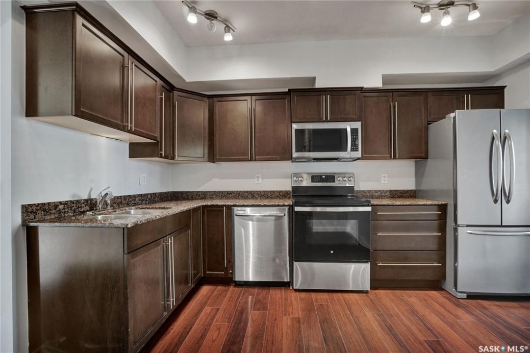 Bright & Spacious Corner Condo with Oversized Patio! Enjoy low-maintenance living in this beautifully maintained 1,216 sq ft, 2-bedroom, 2-bathroom corner unit with 1 underground heated parking stall! This bright condo offers style, comfort, and convenience. Designed with a south-facing layout, this condo is flooded with natural light and features a large private patio complete with a natural gas BBQ hookup—perfect for entertaining or relaxing outdoors. Step inside to find an open-concept living space with granite countertops, stainless steel appliances, and lots of counter top space. The primary bedroom includes a walk-through closet leading to a private 3-piece ensuite with a large walk-in shower. You'll also appreciate the in-suite laundry with additional storage, & separate storage area in the heated underground parkade. Parking is a breeze with an oversized underground stall, and comfort is guaranteed year-round thanks to your own forced-air natural gas furnace and central air conditioning—an uncommon but welcome feature in condo living. Located in a clean, well-kept building, this unit is just minutes from all the essentials: shopping, restaurants, coffee shops, and schools. You'll love the easy access to scenic paved walking trails and green space throughout the neighborhood. Quick possession available call your favorite Realtor to book a private viewing today!