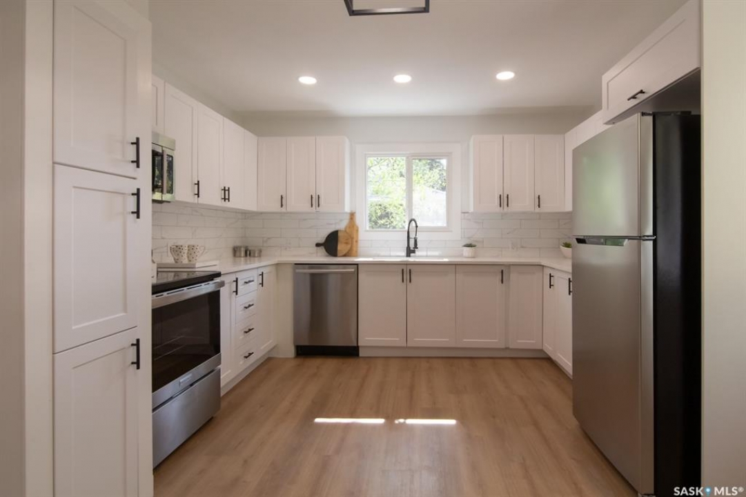Beautifully renovated 1,040 sqft bungalow with 5 bedrooms & 2 bathrooms in the heart of Avalon! Built in 1954, this home is set on a large 60' wide lot surrounded by mature trees. A great combination of classic charm with modern updates, this property has been completely renovated in 2025. Updates include new PVC windows and exterior doors, refinished Hardwood in living room & main floor bedrooms, new laminate flooring on main floor and basement with vinyl plank flooring in bathrooms, new plumbing fixtures throughout, lighting fixtures & pot lights throughout, kitchen cabinets with quartz countertops and subway tile backsplash, interior doors & hardware, fresh paint throughout, electric fireplace, HE furnace, new HWT, and new baseboards/ casings, The oversized single garage is 14 x 23 and there is back alley access with RV parking available. An ideal location, steps from John Lake School & Park, Avalon local shopping Centre, Broadway shopping & restaurant district, 8th Street, with quick access to the Downtown, University, and South Saskatchewan River. Nothing to do but move in & enjoy! Call & book your viewing today!