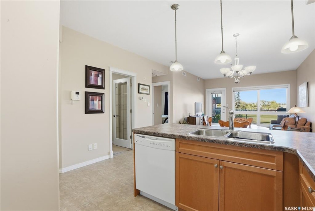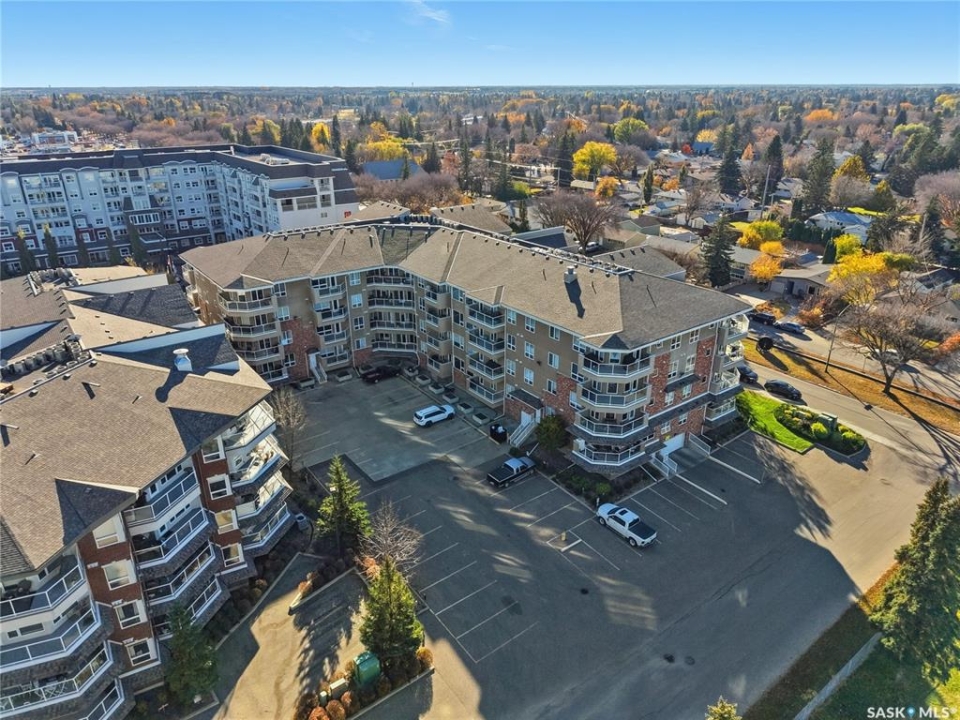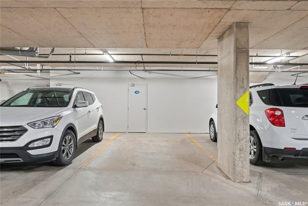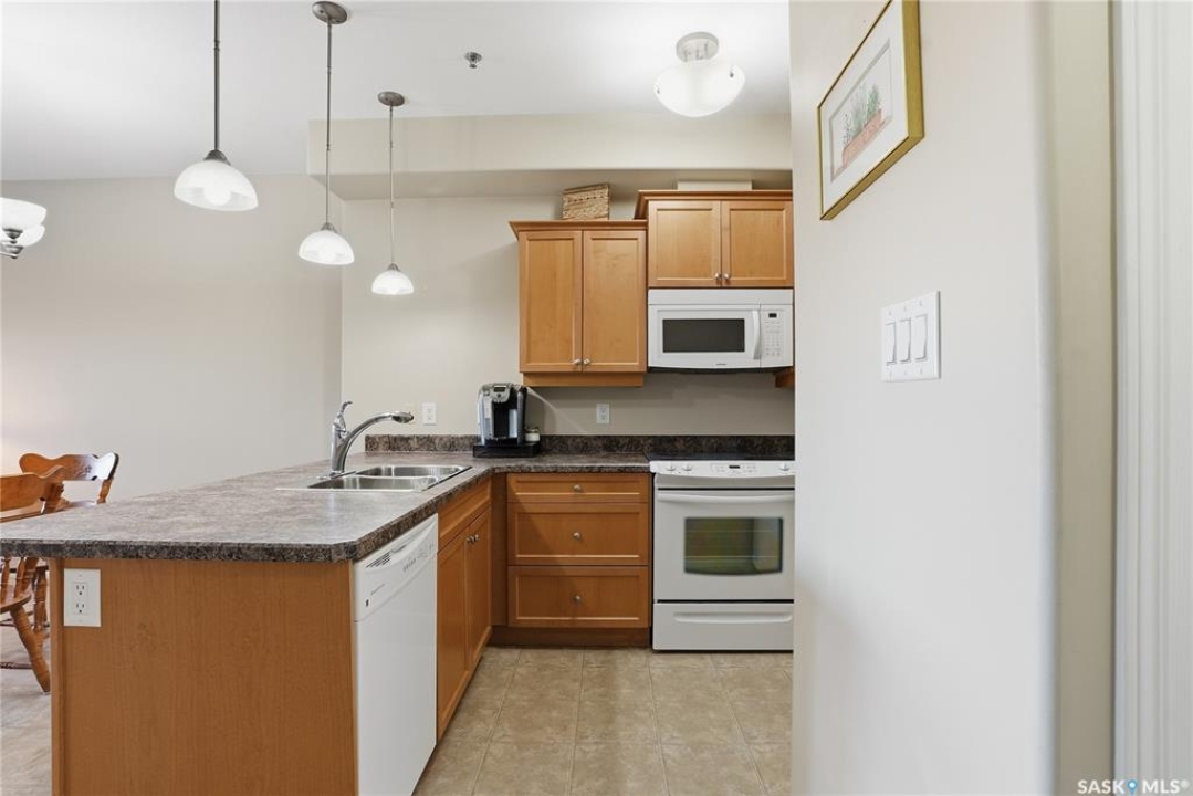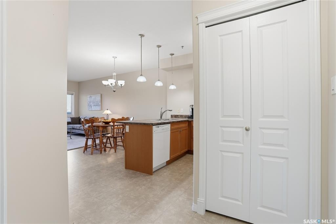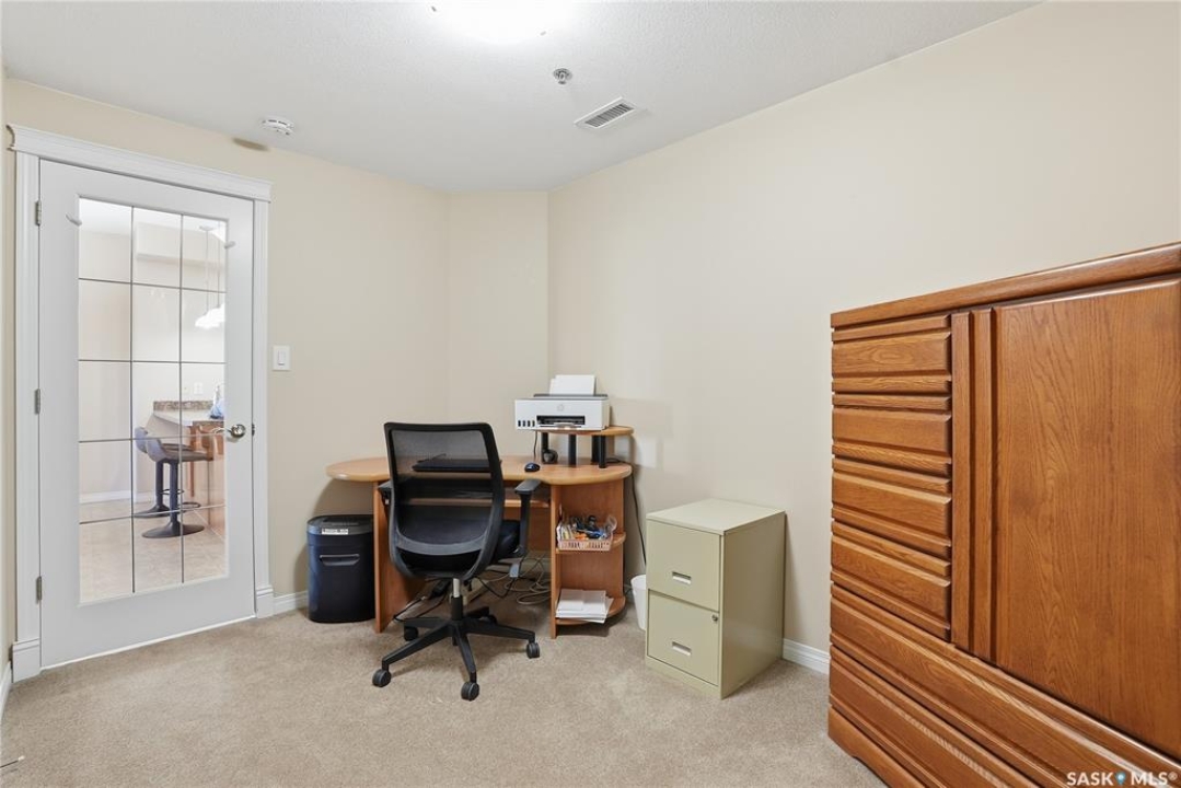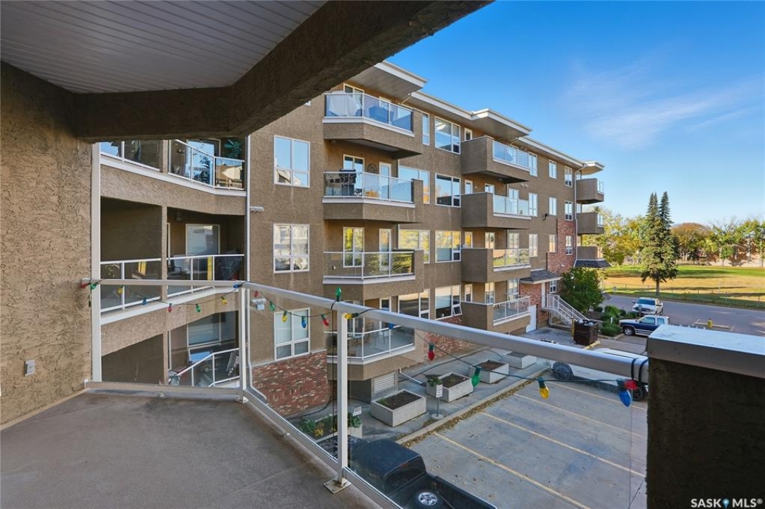 Excellent layout, location & pride of ownership with this 1 bed + den condo at Dover Heights with central A/C, in-suite laundry & storage, underground parking & close proximity to Market Mall & many amenities. This well-designed suite offers a bright & open feel with 9' ceilings, open-concept living room, dining space & kitchen with peninsula breakfast bar, natural wood-tone cabinetry with under-cabinet lighting. Efficient use of space with lots of room for entertaining guests & family. Generously-sized balcony facing trees & open park space, featuring a natural gas hookup for your BBQ. Spacious main bedroom along with a den that's amply sized for use as a home office or guest room. The underground parking stall features a generously-sized self-contained storage room for your convenience. Features of the condo commons include an amenities room, elevator service to all levels of the building, exercise area, visitor parking, & wheelchair-accessible entrances. Well-managed condo association & reserve fund with pride in the building amongst its residents. Heat, water, snow removal & exterior building maintenance included in the condo fees of approximately $394/month. An excellent & affordable condo perfect for those looking to downsize!