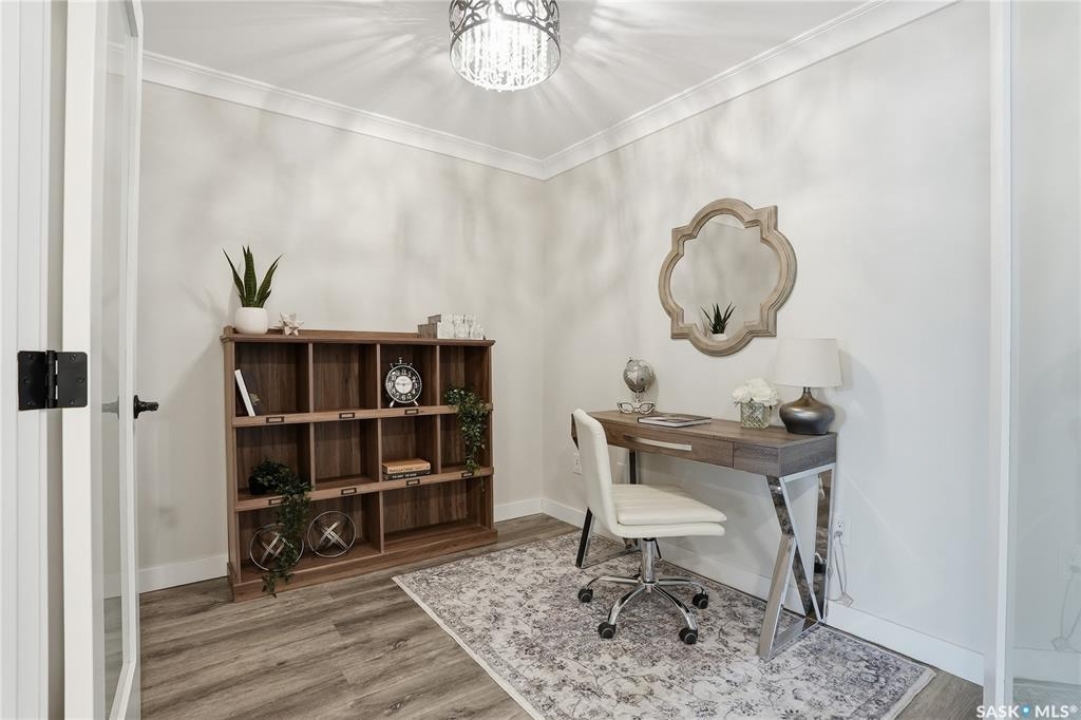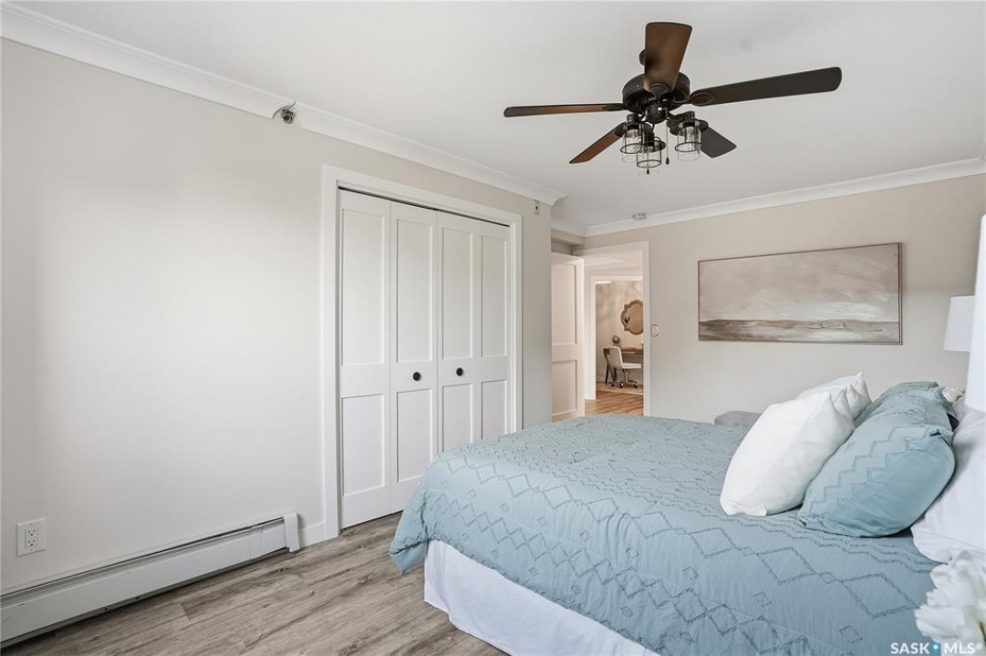 Welcome to The Wycliffe – A Rare City Park Gem! Experience modern elegance and timeless charm in this immaculate, 2-bedroom, 2-bathroom+den executive condo located in the heart of downtown Saskatoon. With over 1,475 sq.ft. of beautifully renovated living space, this third-floor suite offers the perfect blend of sophistication, comfort, and convenience at an unbeatable price! Step inside to discover a custom-designed kitchen featuring quartz countertops, a sleek tile backsplash, stainless steel appliances, and a massive island with seating — ideal for entertaining or everyday living. The kitchen opens seamlessly into a spacious living area, where a cozy fireplace with a classic live-edge mantle sets the tone for relaxed evenings at home. The primary suite is a true retreat, complete with a large walk-in closet and a stunning ensuite boasting a tiled glass shower. A second generous bedroom and a fully renovated 4-piece bath provide the perfect guest wing. Working from home? The private den with French doors offers the perfect quiet workspace. Highlights include: Covered breezeway deck – a unique feature of this unit, ideal for morning coffee or evening relaxation, crown molding throughout with newer paint, flooring, and trim, newer fridge and washer and dryer, newer windows and doors, wide hallways, and two elevators for convenience, covered parking stall included, beautifully maintained building with rooftop patio and welcoming common area. Perfectly positioned in Saskatoon's highly sought-after City Park neighborhood, you're just steps from the river, downtown core, Earls restaurant, shopping, and City Hospital. All buyers/buyer's agents to verify measurements. This condo must be seen to be appreciated – opportunities like this are rare! Book your private showing today.