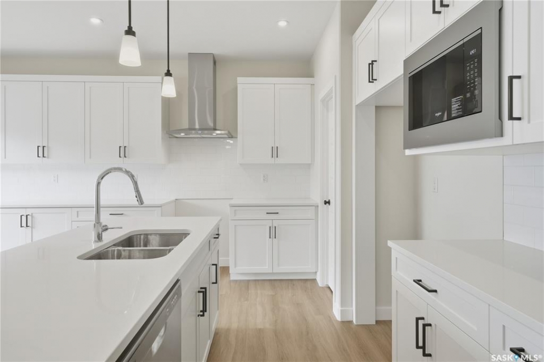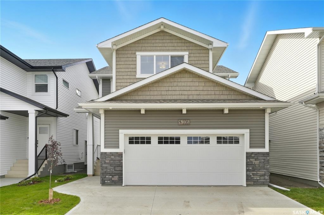 Welcome to 106 Katz Ave – a 2,020 sq. ft. two-storey by Builder of the Year, Ehrenburg Homes. The Zennenberg model offers a bright, open layout with quartz countertops, a large island, custom cabinetry, and a walk-through pantry with mudroom leading to the garage. The dining area opens to your deck through patio doors. Upstairs features a spacious bonus room, three bedrooms, laundry, and two baths. The spacious primary suite includes a walk-in closet and a 4-piece ensuite with dual sinks and tiled shower. Additional highlights include a double attached garage, concrete driveway, front landscaping, and Saskatchewan New Home Warranty. The home features a separate entry to the basement, for the possibility of a future legal suite. Back deck included in purchase price! Immediate possession available.