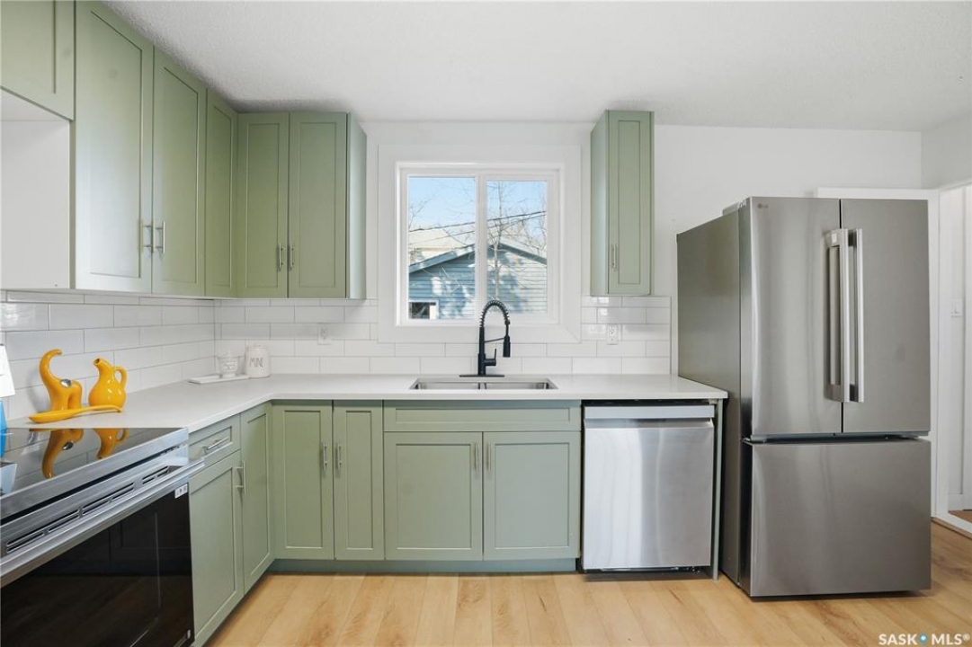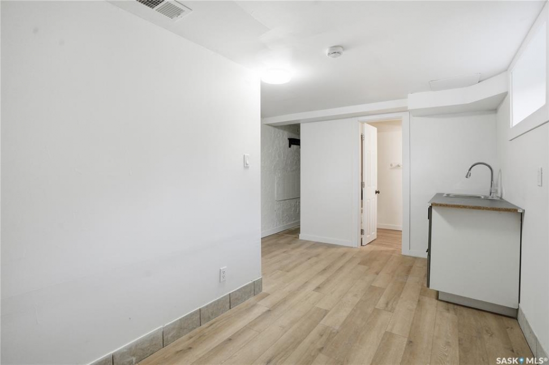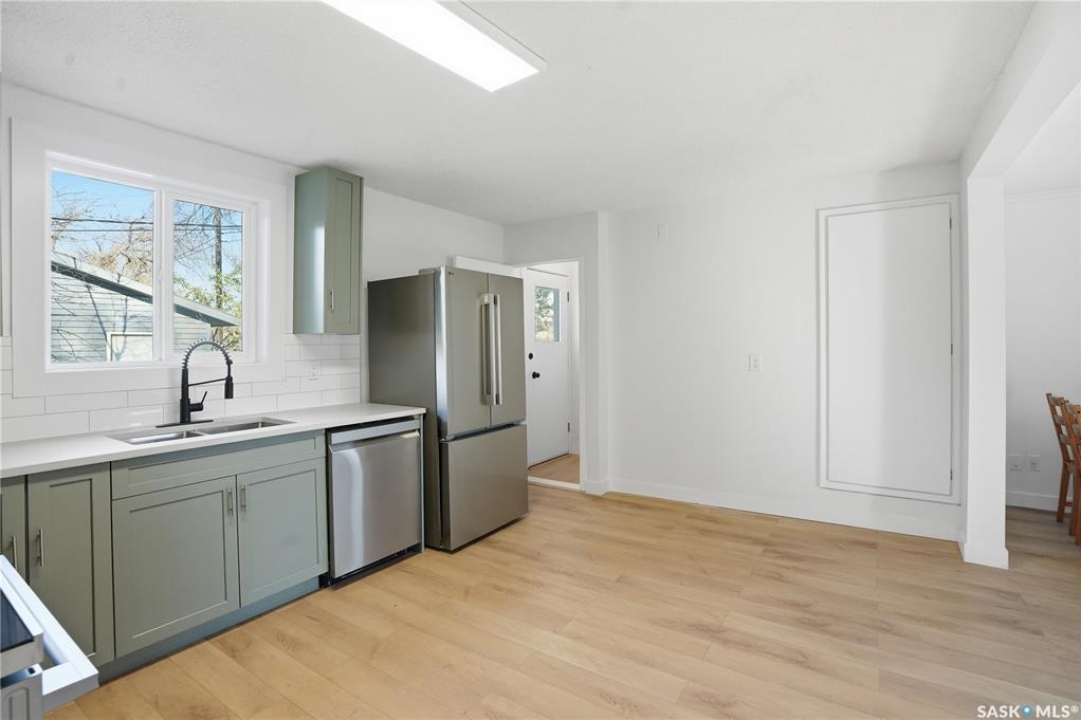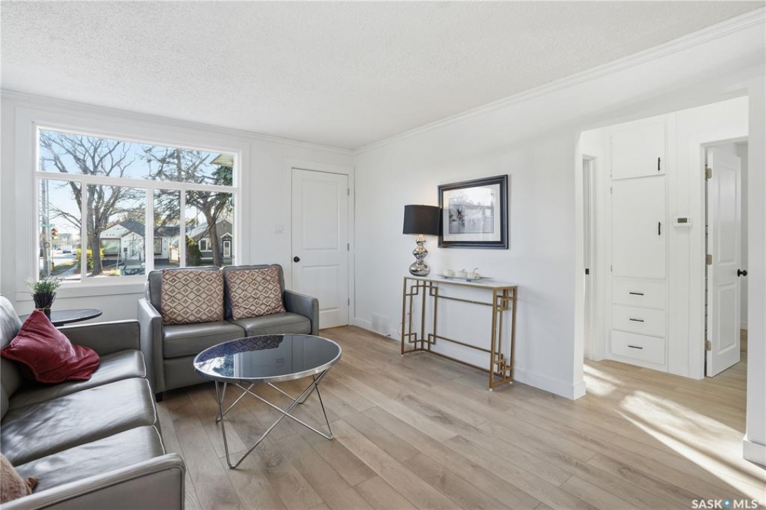 Newly renovated 914 sq ft bungalow in Caswell Hill! Featuring brand-new kitchen cabinets, appliances, flooring, windows, furnace, and hot water tank. The main floor offers two bedrooms, a full modern bathroom, and a spacious living and dining area. The basement has a separate entrance and includes two self-contained units: Unit A with one bedroom, a living room, a kitchen, and a 3-piece bathroom; and Unit B with a living space, a full bathroom, and a counter with sink — perfect as a studio or guest suite. Located directly across the street from Saskatchewan Polytechnic, this property is ideal for families with students or for generating rental income to help with your mortgage! Double detached garage is insulated and boarded ,its ready for the coming winter. Seprate electrical panel in the garage.