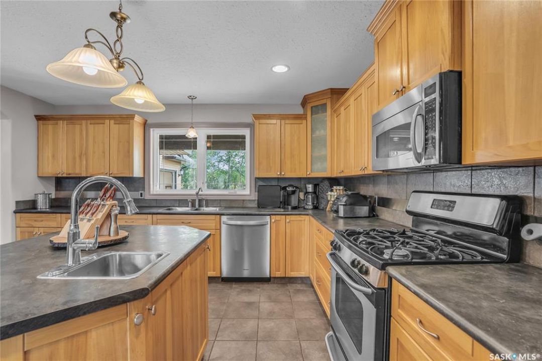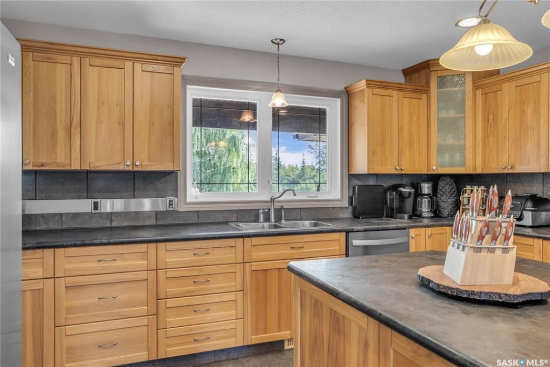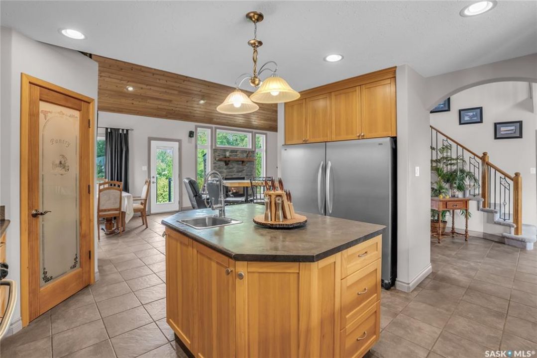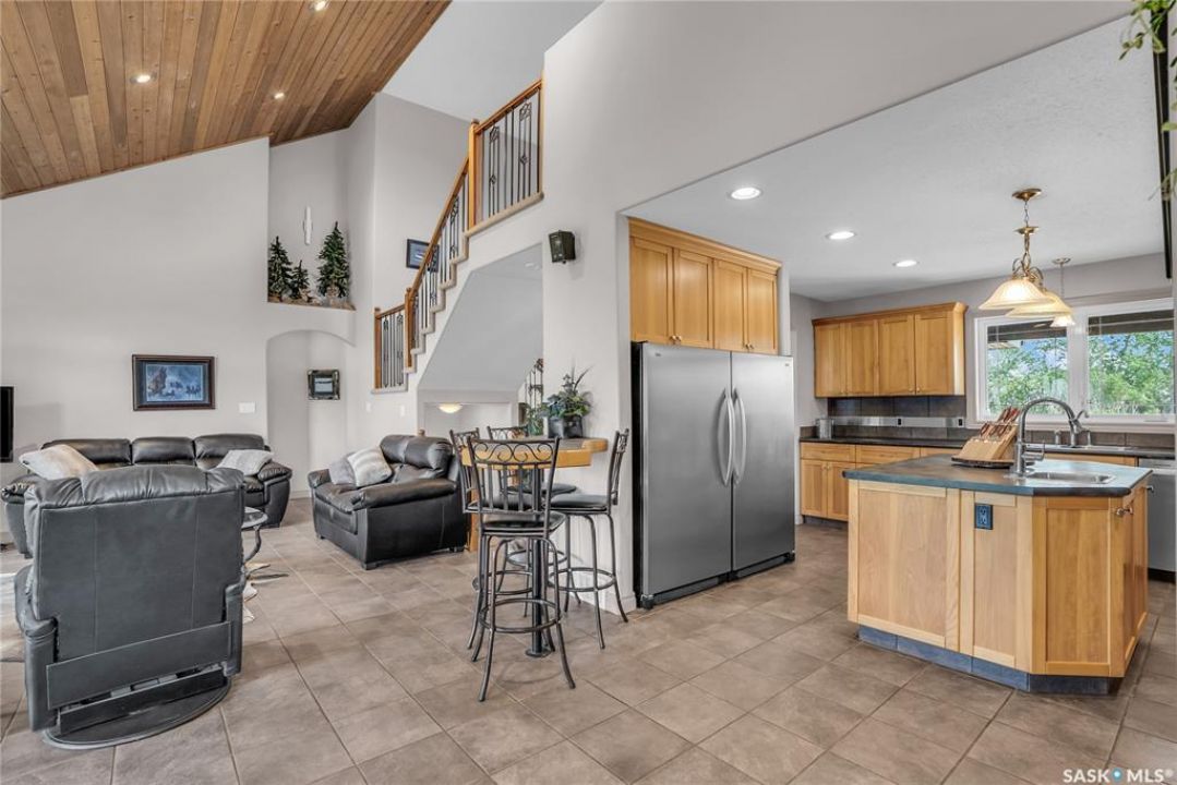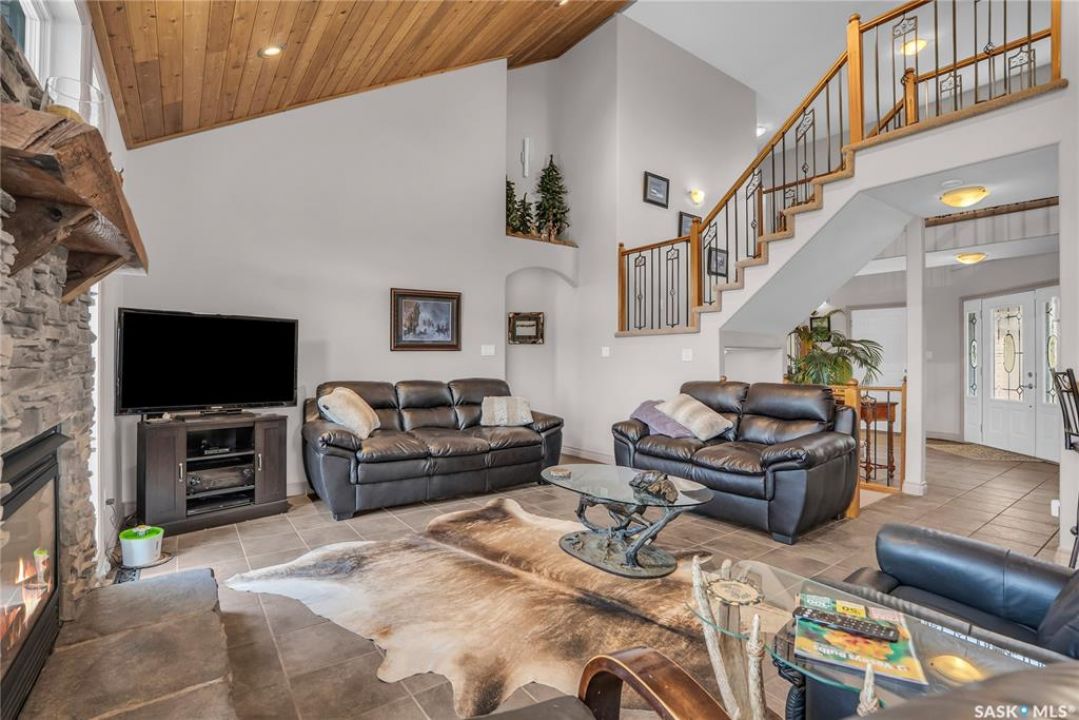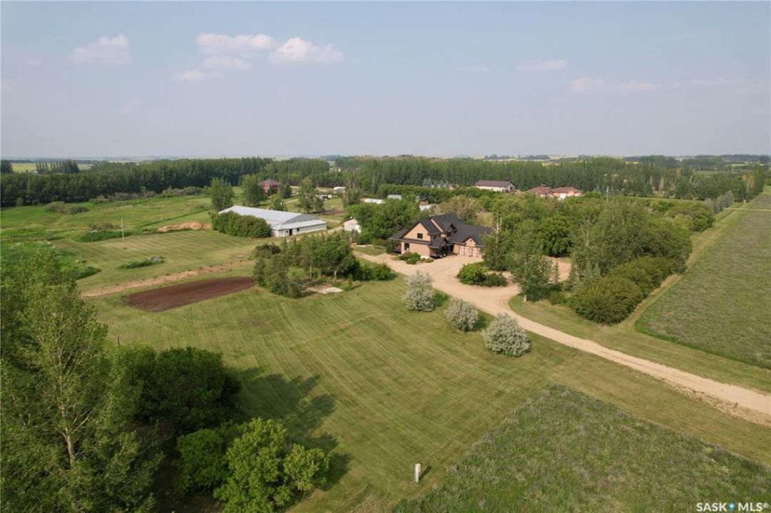 110 Wind River Estates is a thoughtfully designed property located on the edge of Clavet in the RM of Blucher.. Private access to the 3.01-acre estate is from the old #16 highway, an ideal location—with convenient access to four major potash mines, Cargill, walking distance of Clavet School and a variety of local businesses and is only 12 minutes from Saskatoon. Inside, the heart of the home is a chef-inspired kitchen, featuring extensive counter space, a large island with prep sink, a large pantry, gas range, and a built-in refrigerator and freezer. The breakfast bar is a casual space for morning meals or after-school snacks. The dining area opens onto a covered deck, ideal for outdoor dining and entertaining. The spacious living room boasts soaring vaulted ceilings and a cozy gas fireplace. The main-floor primary suite is complete with a luxurious ensuite featuring a jetted tub, tiled shower, and a generous walk-in closet. The second floor has a versatile bonus room overlooking the main living and connects to an additional large bedroom and full bathroom via a unique bridge-style hallway. The bonus room can easily be converted to another bedroom. The fully finished basement includes a large entertainment area, two additional bedrooms, a full bathroom, a cold room, and ample storage space. A main-floor laundry room is conveniently located next to a 2 piece bathroom and just off the garage entrance. The attached heated garage measures 26' x 32' with 12' ceilings, a built-in workbench, hot and cold water, extensive storage and large south facing windows. Landscaped with hundreds of trees, shrubs and perennials. Concrete stepping stones to a secluded firepit & garden area. Designed with energy efficiency in mind, this home stays cool in the summer and warm in the winter. Additional features include paved access right to the gate and brand-new asphalt shingles installed in June 2025. This exceptional property must be seen to be truly appreciated. Call today!