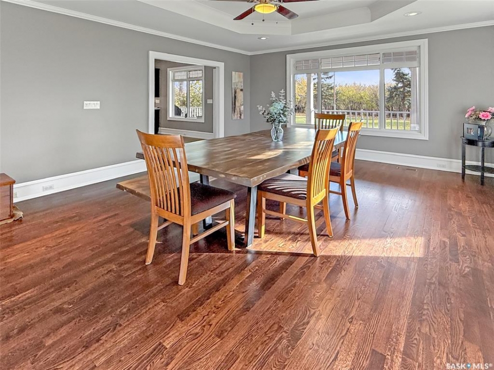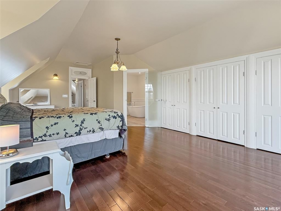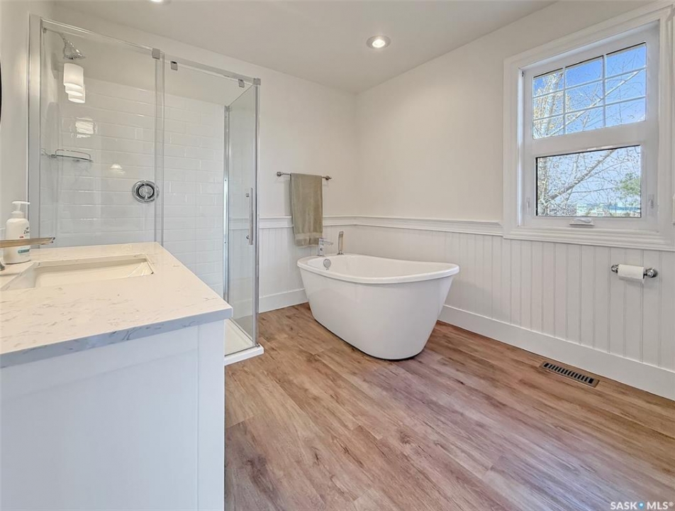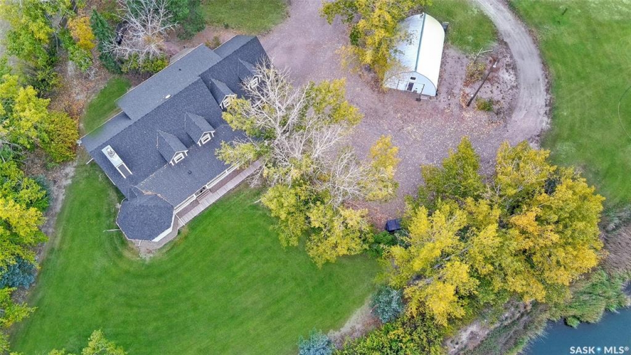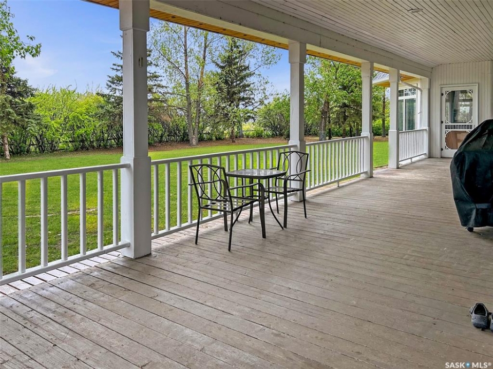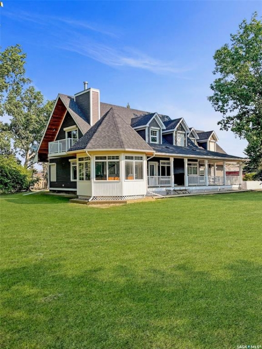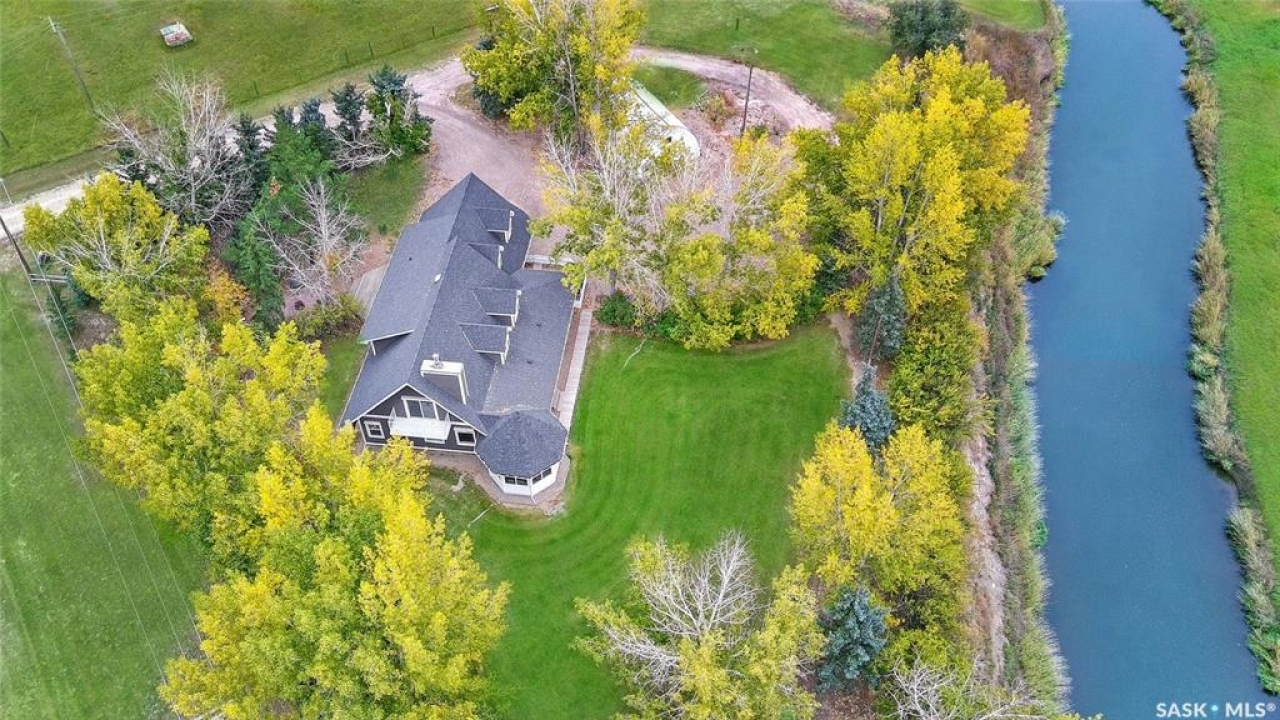 Discover an exquisite blend of privacy and convenience with this luxurious "in city" acreage. Nestled on the eastern edge of the city, this picturesque 1.5-acre property is enveloped by a lush shelter belt and bordered by a serene creek, offering stunning views. The craftsman-style home exudes charm with its elegant wraparound veranda, second-story dormers, and expansive windows that flood the interior with natural light.Upon entering, you'll be greeted by a graceful staircase leading to the second floor. To one side is a sitting room, the other side hosts a fully renovated eat-in kitchen and dining area. The kitchen features rich cabinetry, Stone countertops, a large island with seating, and SS appliances, all overlooking the beautiful yard. The main floor also includes a bedroom/office, a newly renovated bathroom, and a large laundry room that connects to the breezeway and a heated double car garage.The second floor boasts a charming bonus room with open-beam construction and a balcony overlooking the yard. Two additional bedrooms and a guest bath are located in the opposite wing. The master suite is a true highlight, featuring window seats, a closet spanning the entire wall, a private balcony, and a newly renovated five-piece en suite with a standalone tub and walk-in shower.The lower level offers a large family room, a fifth bedroom, a renovated three-piece bathroom, and an oversized utility/storage room. The home equipped with a zoned furnace(2024), two water heaters (one dedicated to floor heating in the garage and kitchen), central air and shingles installed(8 years ago). Additional updates include vinyl siding, triple-pane PVC windows, fresh paint throughout, and updated trim. The property is connected to city power and water, with a newly replaced septic tank and pump.Outside, the veranda leads to a fully enclosed hot tub room with panoramic windows. The property also includes an additional shop, a cozy fire pit area, and an additional back deck.