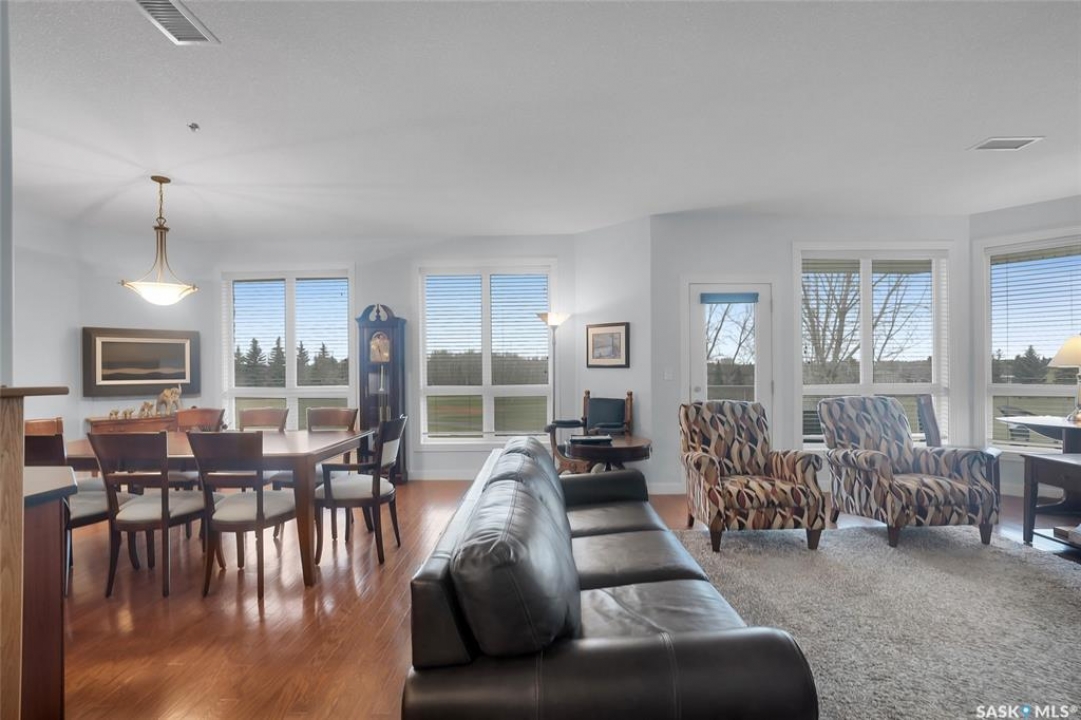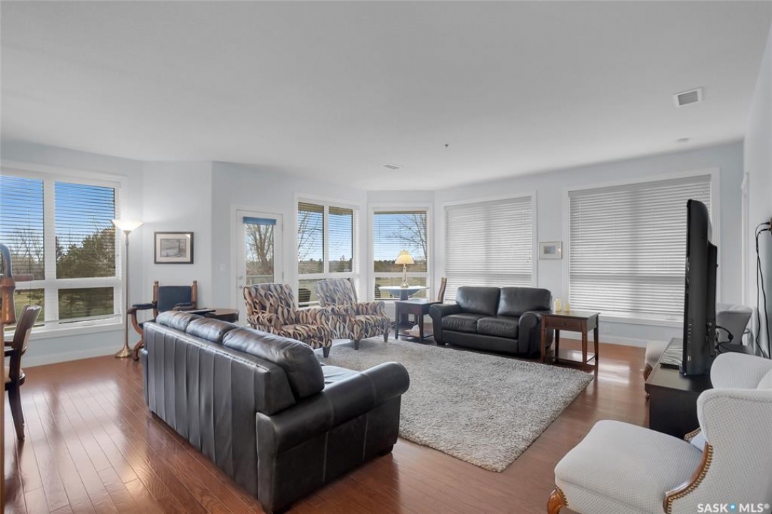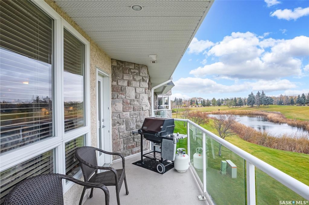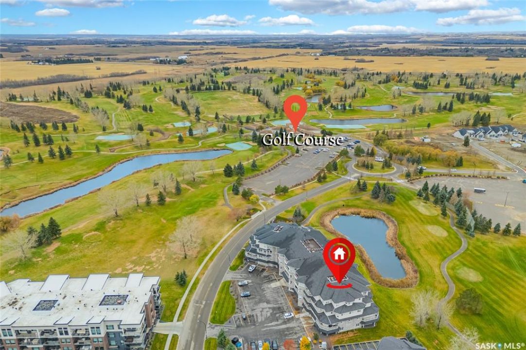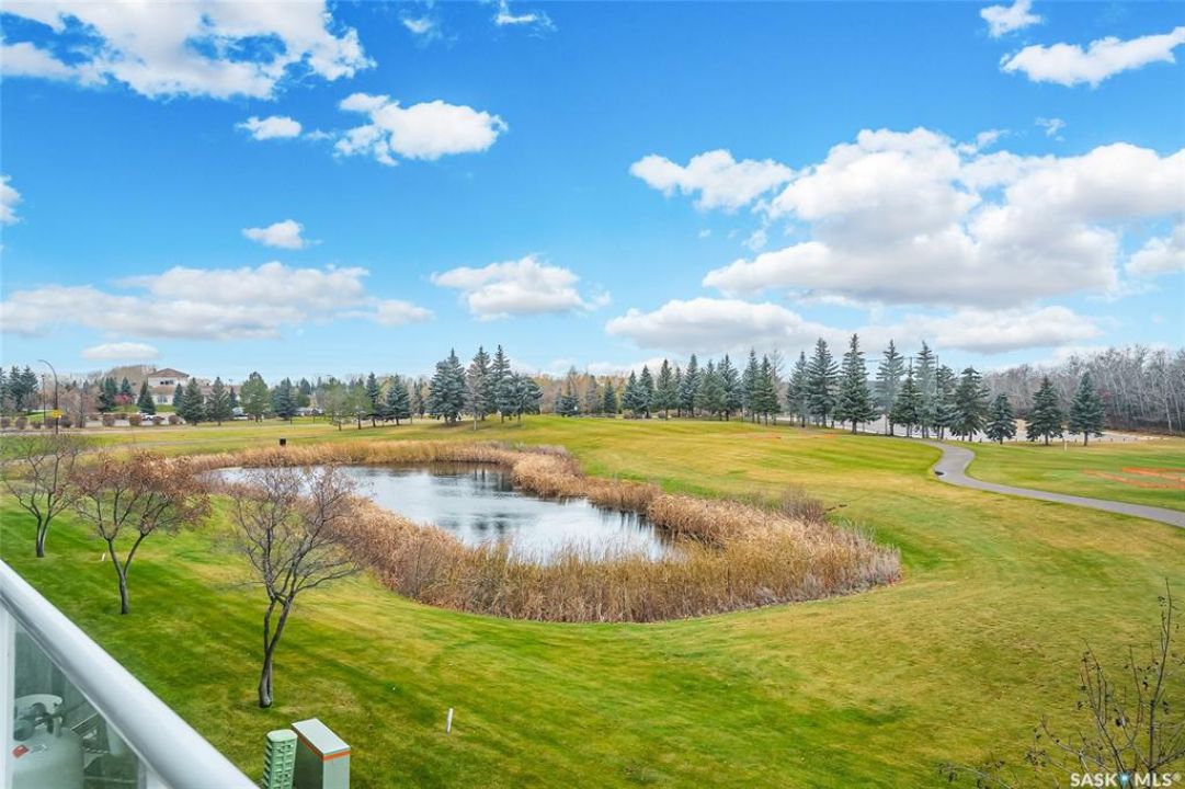Stunning golf course views await you in this exceptional one owner condo unit. The open floor plan boasts an abundance of natural light pouring in through the numerous windows, showcasing the breathtaking scenery outside. Soaring nine foot ceilings add to the sense of spaciousness, creating an ideal atmosphere for entertaining and relaxation. The gourmet kitchen is equipped with high-quality cabinets, sleek granite countertops, and stainless steel appliances, including a newer refrigerator. The adjacent dining room features custom-designed cabinets, complete with a built-in wine fridge, bar fridge, and sink, perfect for hosting friends and family. Five piece ensuite bath offers his and hers sinks, and a walk-in closet. Step out onto the expansive wrap-around balcony, where you can soak in the panoramic golf course views and enjoy the fresh air. This condo unit also comes with a range of desirable amenities, including an exercise room, amenity room, and a spacious storage locker. Parking is convenient, with one heated underground stall, and one surface stall, as well as a wash bay for washing your vehicle. Visitors will appreciate the abundance of parking options available. Don't miss this incredible opportunity to own a piece of golf course paradise!