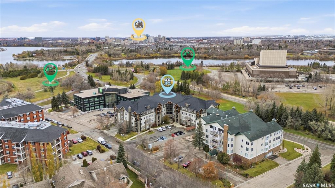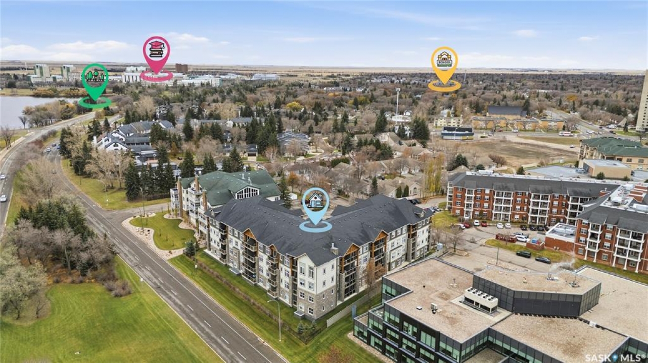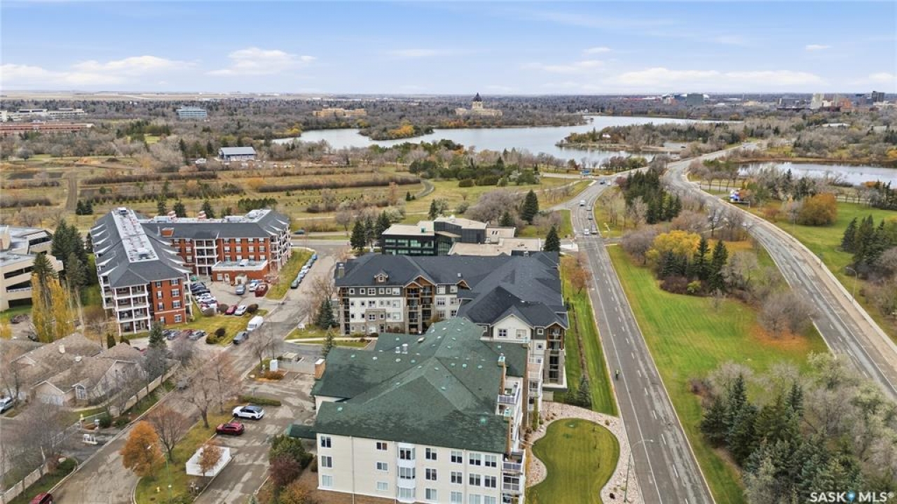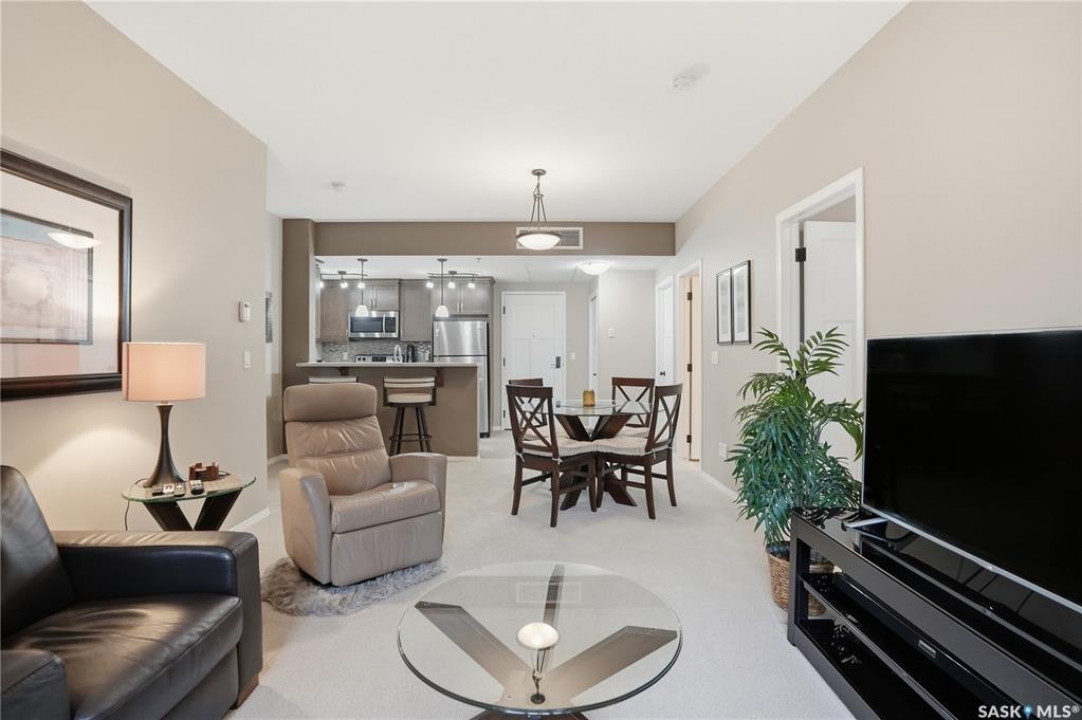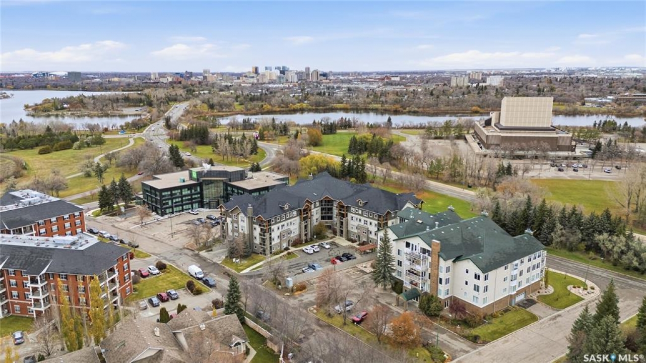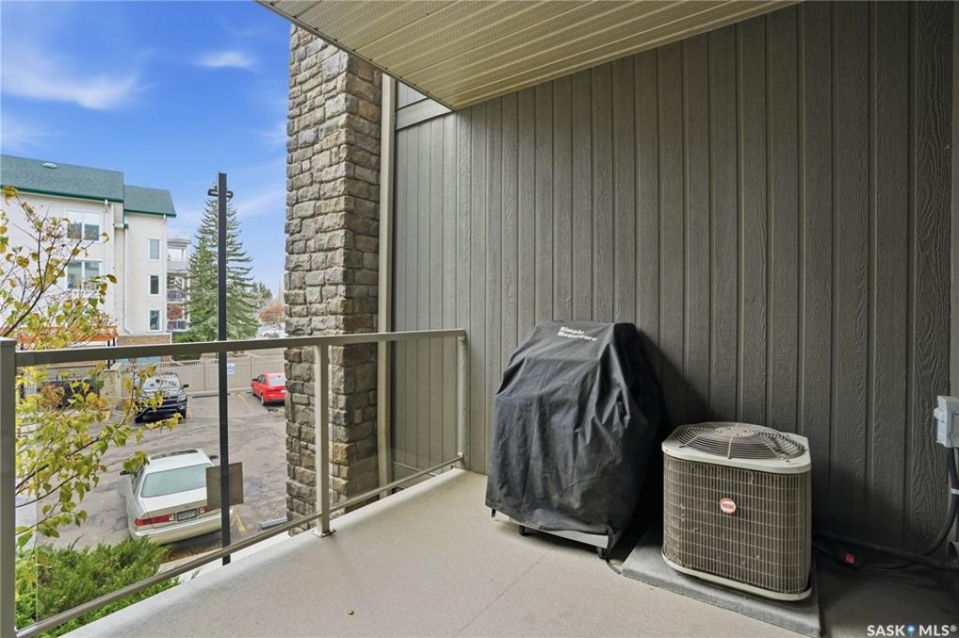 Welcome to Bellagio Terrace, one of Regina's upscale condo communities, perfectly located in the heart of Hillsdale—steps from Wascana Park, University of Regina, Wascana Rehab, Conexus Arts Centre and countless south-end amenities. Beautifully maintained 2nd floor unit offering 885 sq ft of comfortable MOVE IN READY living space with 2 bedrooms + 2 bathrooms. This home is ideal for 1st time buyers, busy professionals or anyone looking to simplify their lifestyle without compromising on quality, style & convenience. Step inside to an inviting open-concept layout with warm neutral tones and large windows creating a bright atmosphere. Modern kitchen features rich maple cabinetry, tiled backsplash, stainless steel appliances and a sit-up island—perfect for entertaining or casual dining. The dining and living area opens to a private balcony, where you can enjoy your morning coffee, unwind after work or grill a steak on your BBQ. The large primary suite features a walk-in closet and 3-piece ensuite, while the second bedroom and full 4-piece bathroom provide flexibility for guests or a home office. Additional highlights include new carpet, top down bottom up custom blinds, central A/C, in-suite laundry & storage room plus 1 underground heated parking stall which is a luxury during SASK winters. This parking stall is a preferred spot and fits a full sized pick up and is easy to navigate. Condo fees include: heat, water, common area maintenance, snow removal, lawn care and building insurance which make ownership simple and stress-free. Residents enjoy access to a well-equipped fitness room, owner's lounge (currently under reno to refresh the look) and secure elevator access—all in a quiet, pet-friendly building managed by W Management. Whether you're a first-time buyer ready to build equity, a professional seeking convenience or a down-sizer looking for lock-and-leave comfort, the Bellagio Terrace condo delivers the perfect blend of style, security and location.