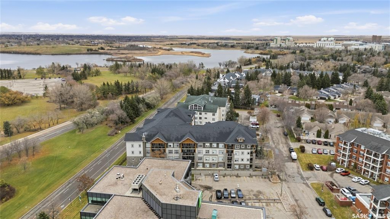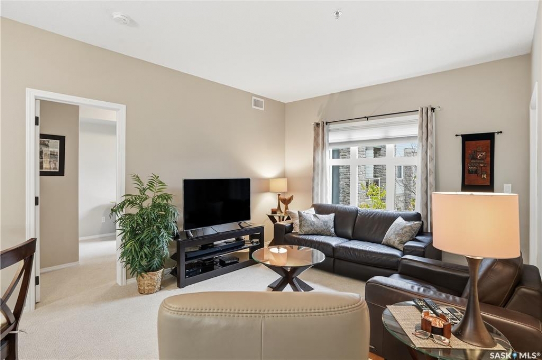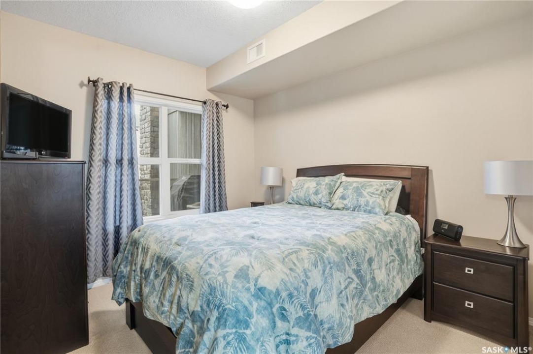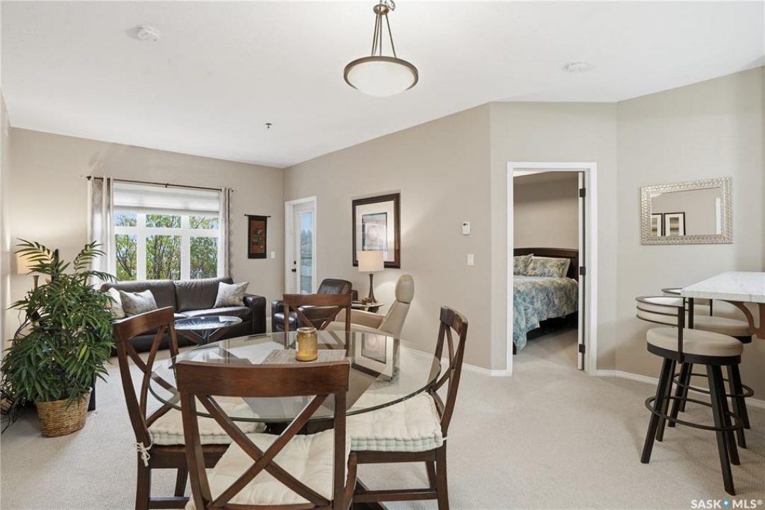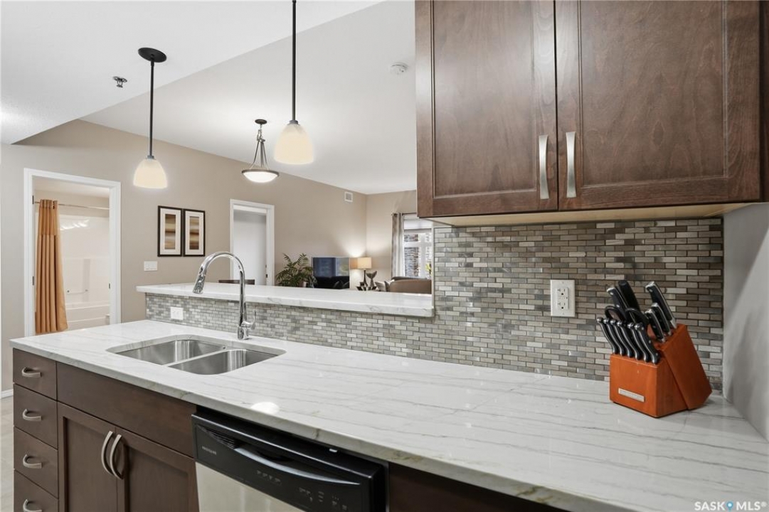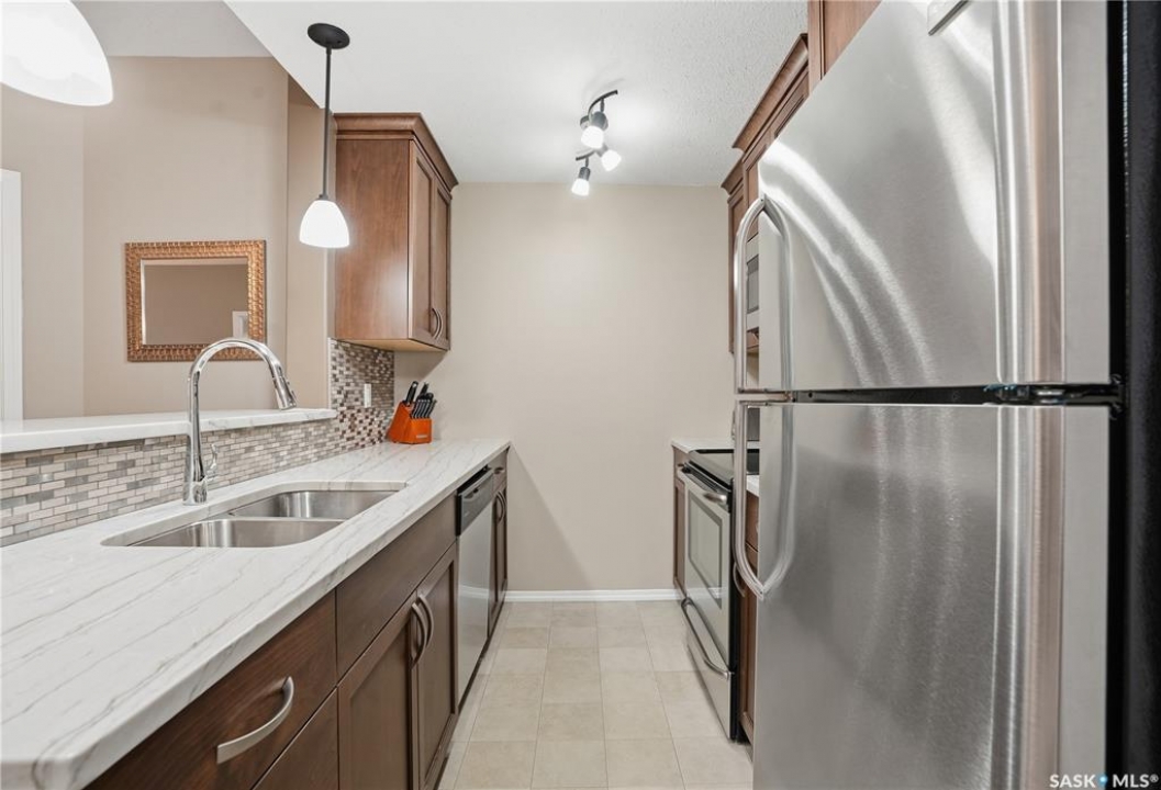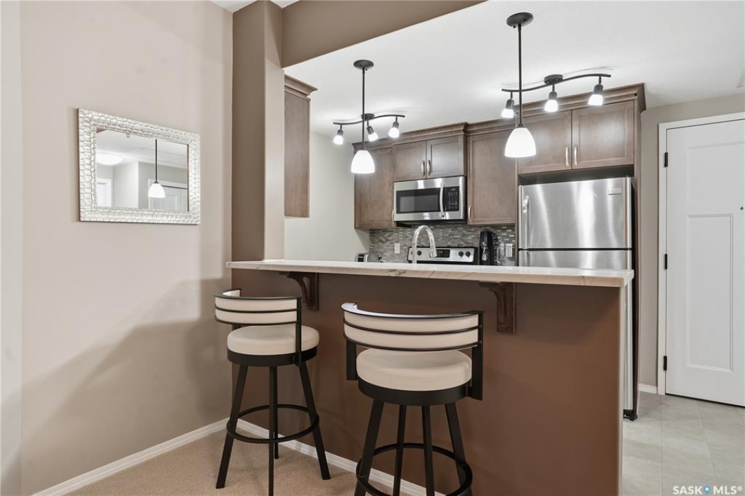 Welcome to Bellagio Terrace, one of Regina's upscale condo communities, perfectly located in the heart of Hillsdale—steps from Wascana Park, University of Regina, Wascana Rehab, Conexus Arts Centre and countless south-end amenities. Beautifully maintained 2nd floor unit offering 885 sq ft of comfortable MOVE IN READY living space with 2 bedrooms + 2 bathrooms. This home is ideal for 1st time buyers, busy professionals or anyone looking to simplify their lifestyle without compromising on quality, style & convenience. Step inside to an inviting open-concept layout with warm neutral tones and large windows creating a bright atmosphere. Modern kitchen features rich maple cabinetry, tiled backsplash, stainless steel appliances and a sit-up island—perfect for entertaining or casual dining. The dining and living area opens to a private balcony, where you can enjoy your morning coffee, unwind after work or grill a steak on your BBQ. The large primary suite features a walk-in closet and 3-piece ensuite, while the second bedroom and full 4-piece bathroom provide flexibility for guests or a home office. Additional highlights include new carpet, top down bottom up custom blinds, central A/C, in-suite laundry & storage room plus 1 underground heated parking stall which is a luxury during SASK winters. This parking stall is a preferred spot and fits a full sized pick up and is easy to navigate. Condo fees include: heat, water, common area maintenance, snow removal, lawn care and building insurance which make ownership simple and stress-free. Residents enjoy access to a well-equipped fitness room, owner's lounge (currently under reno to refresh the look) and secure elevator access—all in a quiet, pet-friendly building managed by W Management. Whether you're a first-time buyer ready to build equity, a professional seeking convenience or a down-sizer looking for lock-and-leave comfort, the Bellagio Terrace condo delivers the perfect blend of style, security and location.