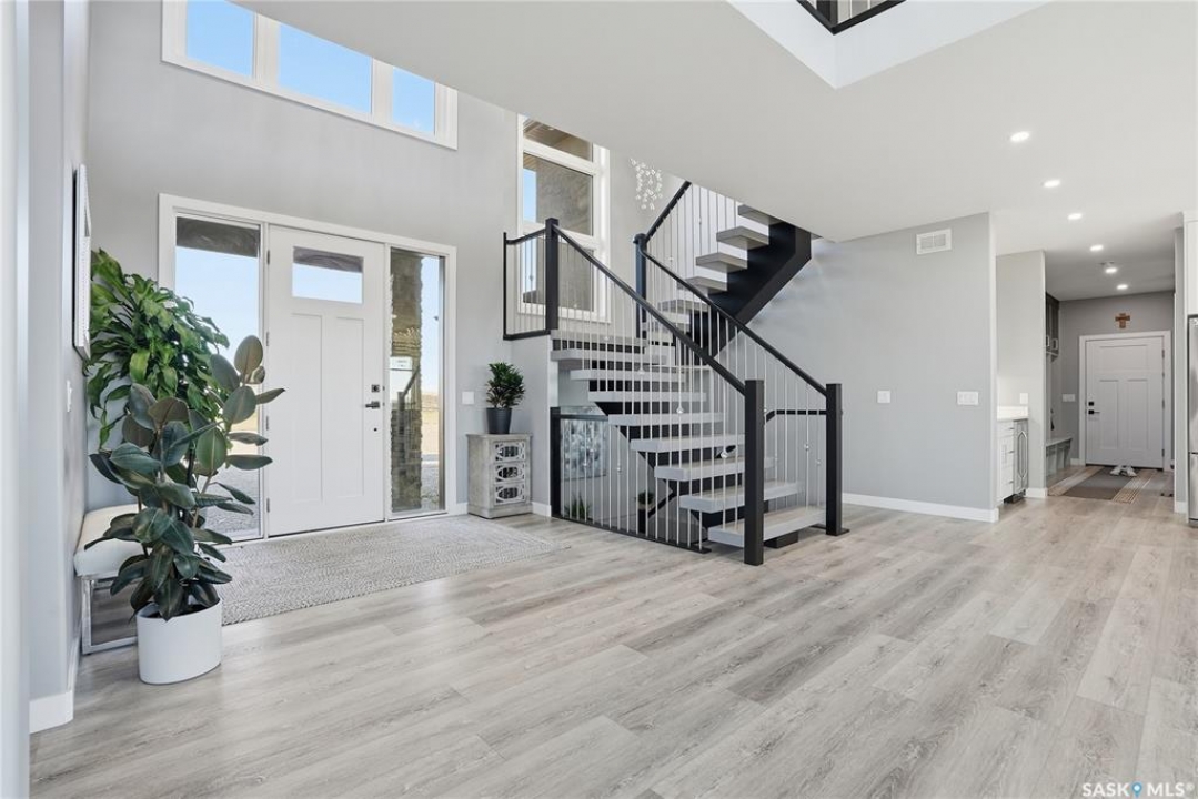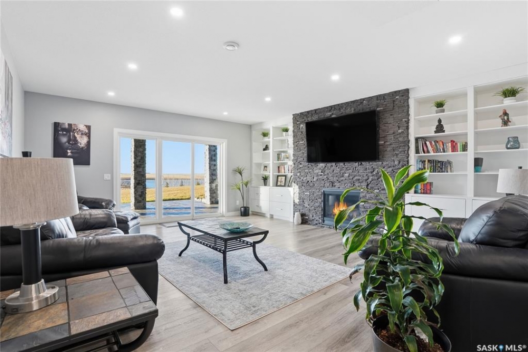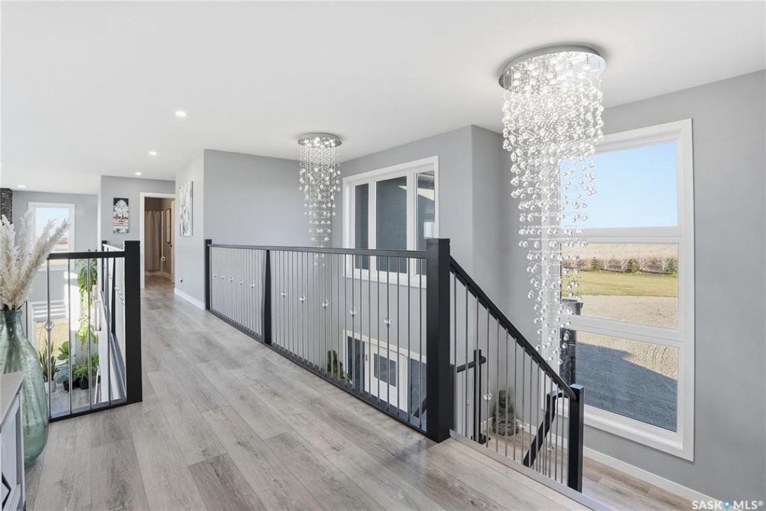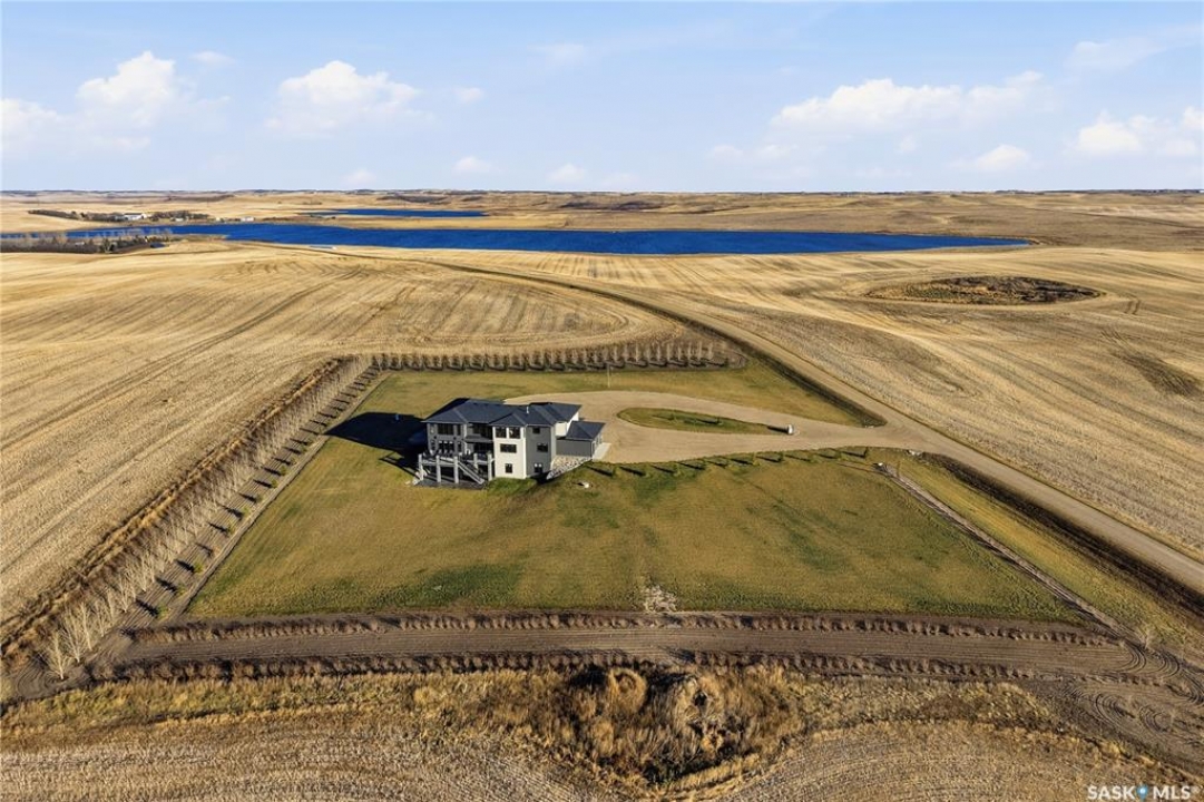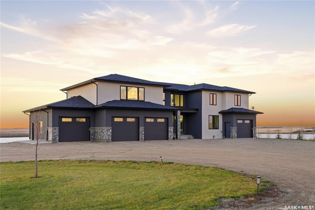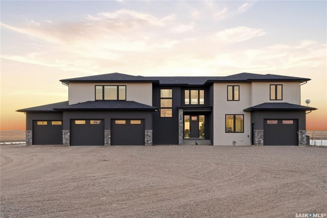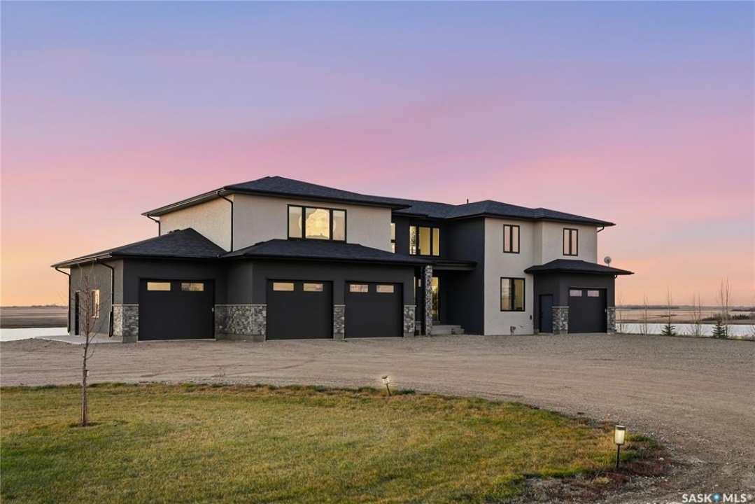 Located 30 minutes east of Saskatoon, this exceptional 2021 custom-built two-storey home spans over 3,700 sq. ft. above grade with a fully finished walkout basement, perfectly positioned to capture sweeping views of rolling hills and endless sunsets. The main floor's open-concept design showcases a chef-inspired kitchen, elegant dining area, and a grand great room with a striking gas fireplace framed by expansive windows. A spacious mudroom seamlessly connects to the heated 3-car garage, complemented by an additional single garage. The main level also features a private office, laundry, and powder room. Upstairs, discover an impressive bonus room and a luxurious primary bedroom complete with a spa-style 5-piece ensuite and a walk-in closet designed to impress, plus two additional bedrooms and a 4-piece bath. The walkout level extends the living space with two more bedrooms, a full bath, a family room with a gas fireplace and wet bar, and a fitness room. With city water, dual furnaces and A/C units, in-floor heat in the garage and basement, a mature shelterbelt, and absolute peace and privacy, this remarkable property redefines country luxury. You'll want to see this incredible property for yourself!