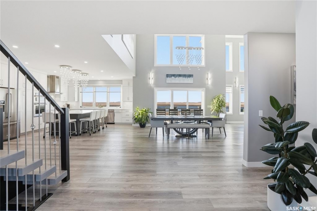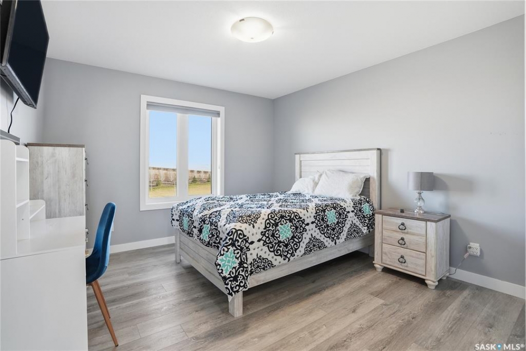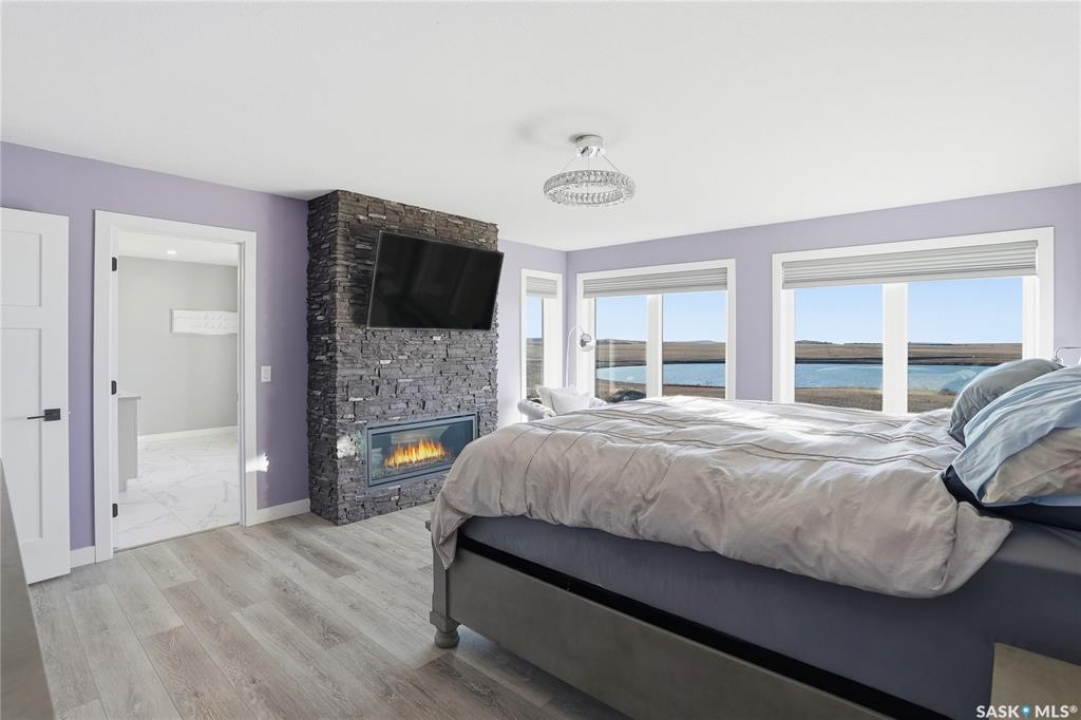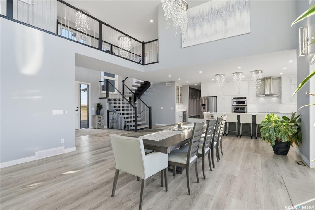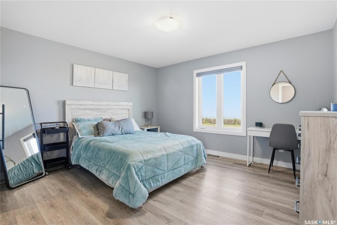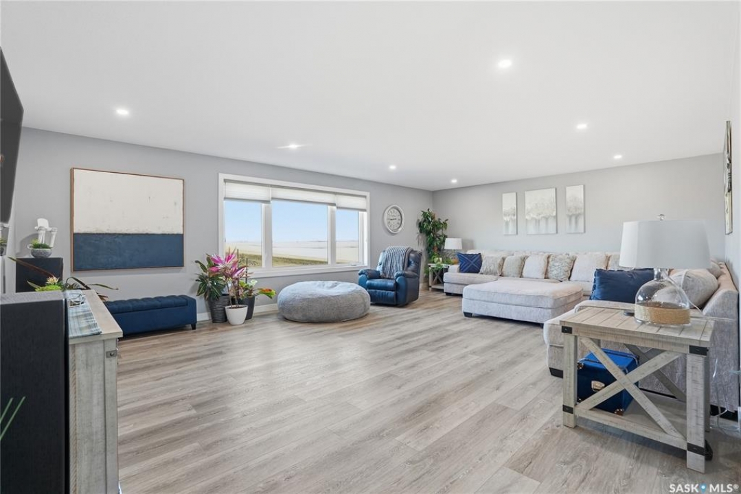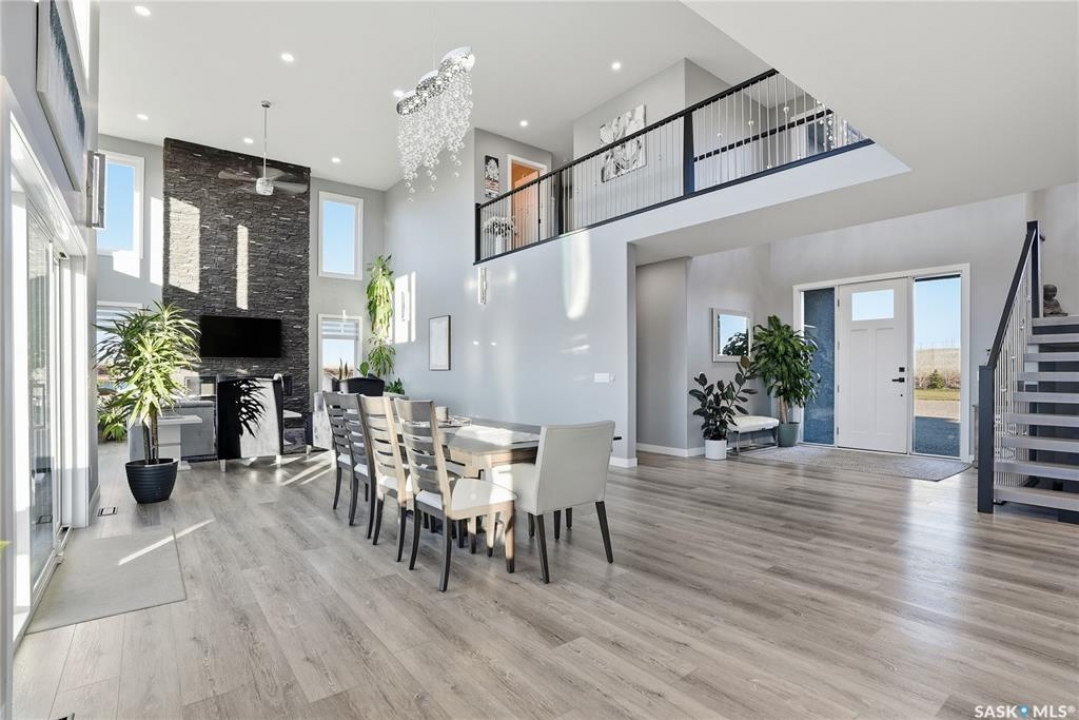 Located 30 minutes east of Saskatoon, this exceptional 2021 custom-built two-storey home spans over 3,700 sq. ft. above grade with a fully finished walkout basement, perfectly positioned to capture sweeping views of rolling hills and endless sunsets. The main floor's open-concept design showcases a chef-inspired kitchen, elegant dining area, and a grand great room with a striking gas fireplace framed by expansive windows. A spacious mudroom seamlessly connects to the heated 3-car garage, complemented by an additional single garage. The main level also features a private office, laundry, and powder room. Upstairs, discover an impressive bonus room and a luxurious primary bedroom complete with a spa-style 5-piece ensuite and a walk-in closet designed to impress, plus two additional bedrooms and a 4-piece bath. The walkout level extends the living space with two more bedrooms, a full bath, a family room with a gas fireplace and wet bar, and a fitness room. With city water, dual furnaces and A/C units, in-floor heat in the garage and basement, a mature shelterbelt, and absolute peace and privacy, this remarkable property redefines country luxury. You'll want to see this incredible property for yourself!