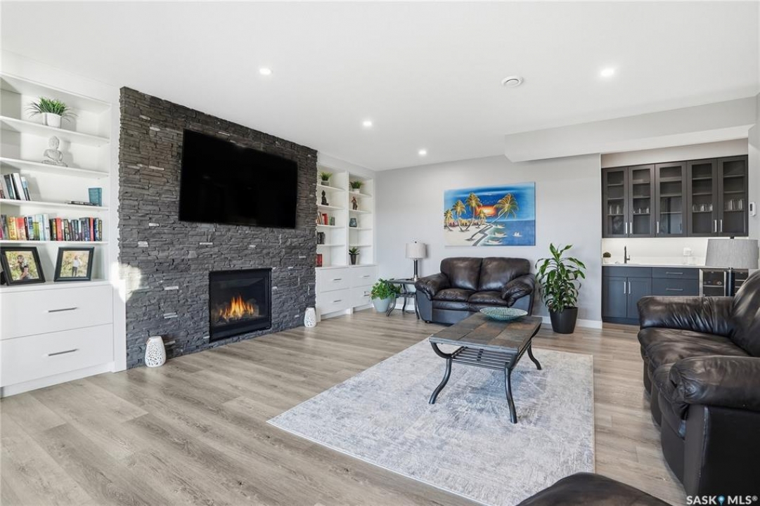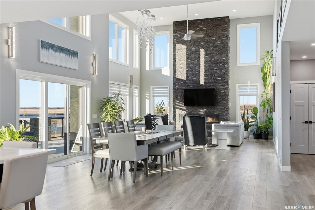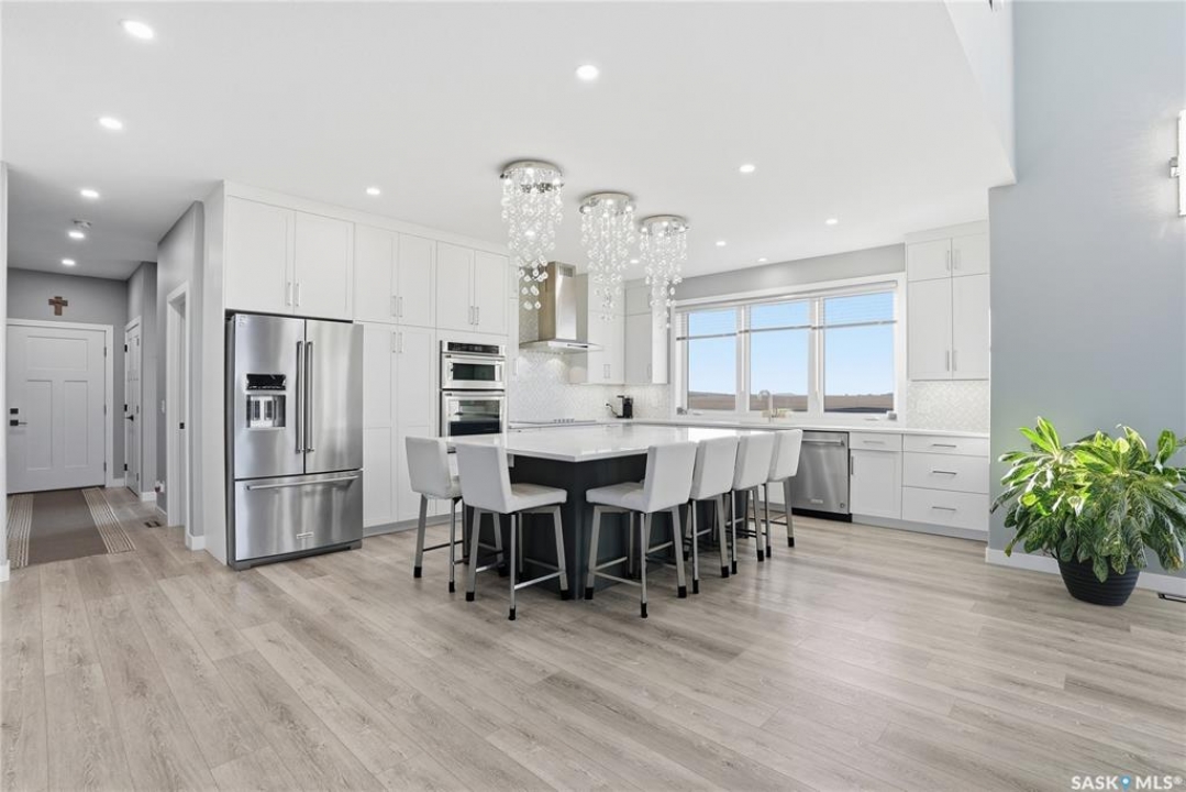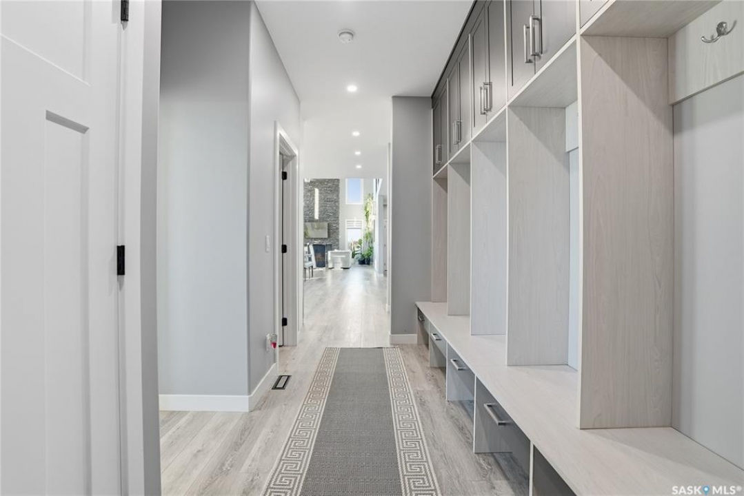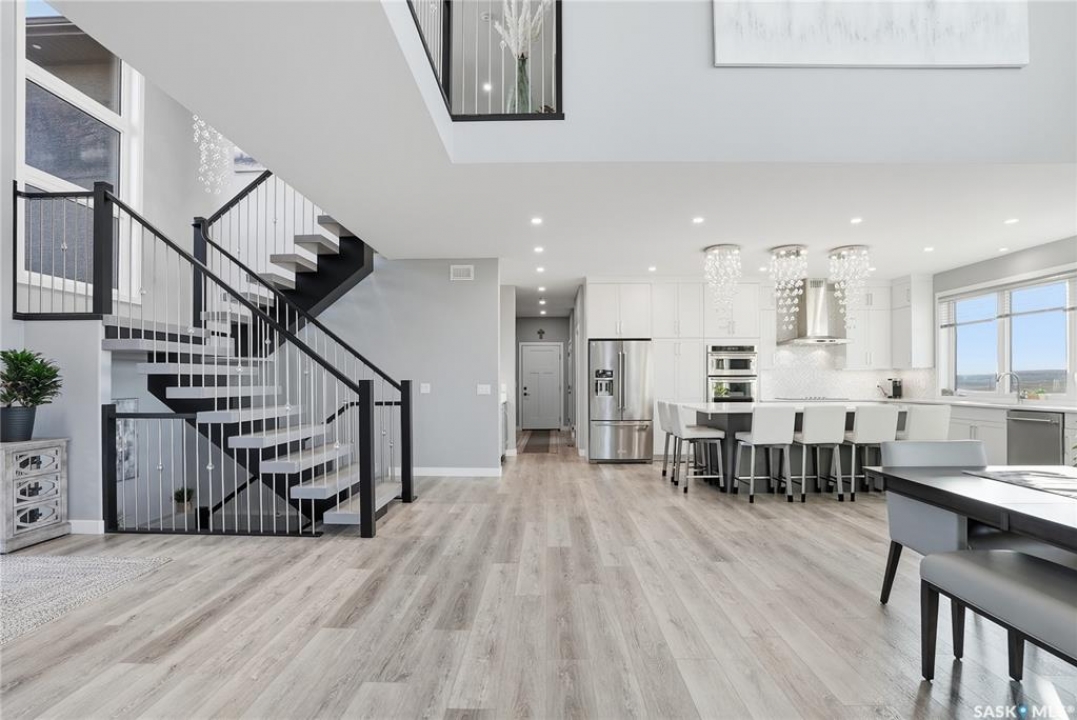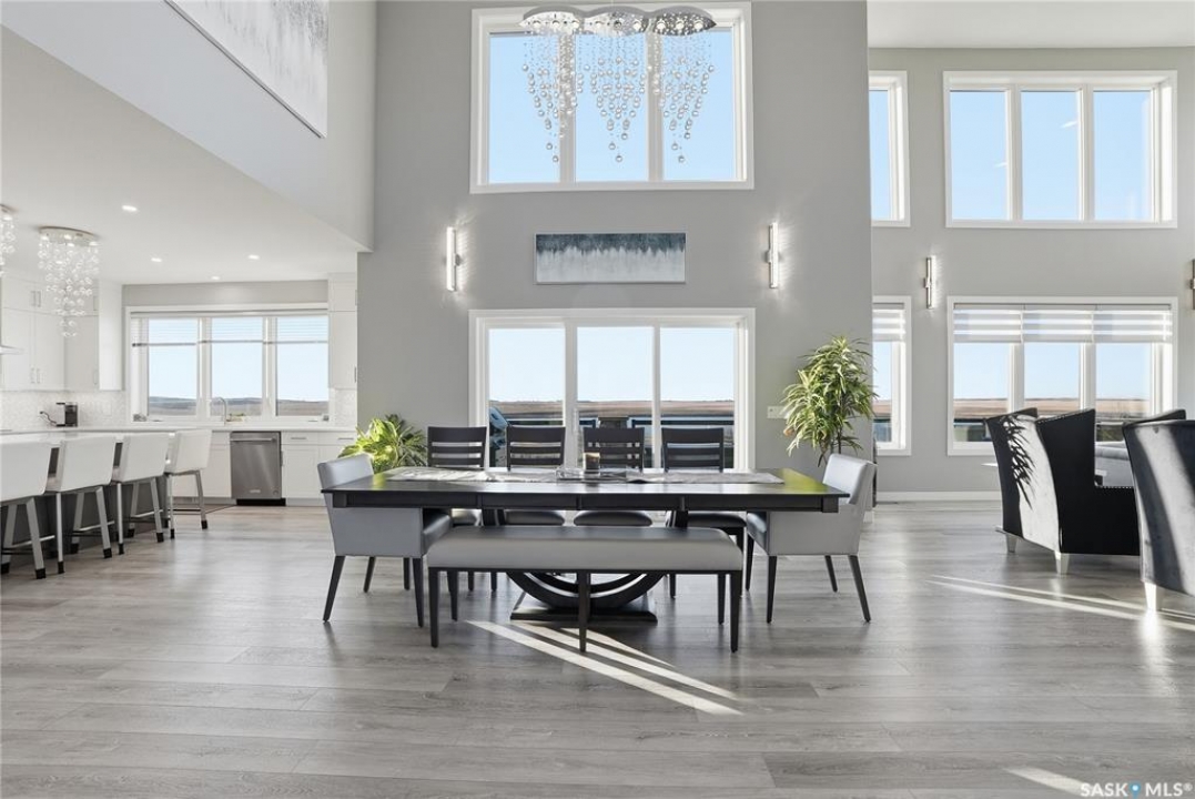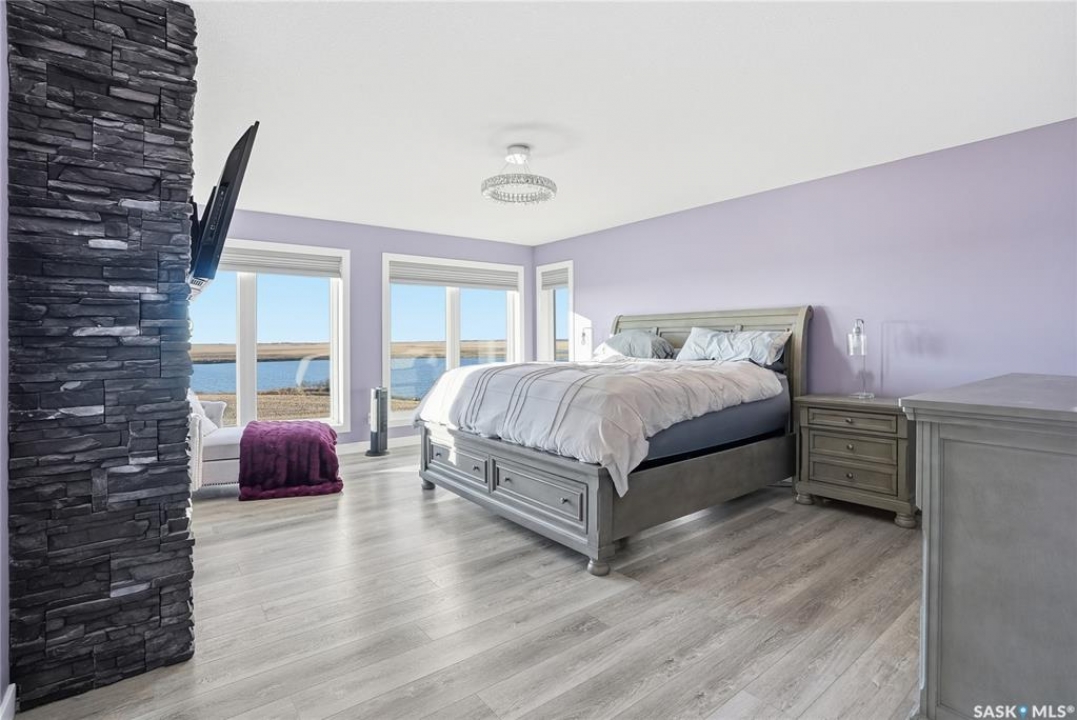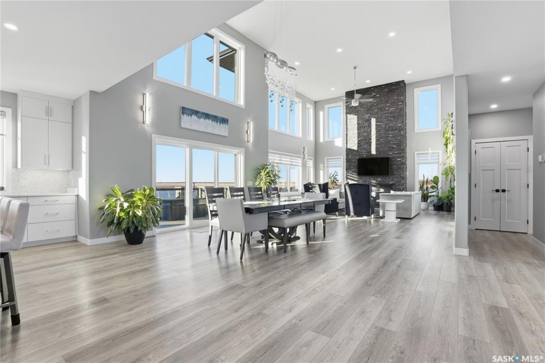 Located 30 minutes east of Saskatoon, this exceptional 2021 custom-built two-storey home spans over 3,700 sq. ft. above grade with a fully finished walkout basement, perfectly positioned to capture sweeping views of rolling hills and endless sunsets. The main floor's open-concept design showcases a chef-inspired kitchen, elegant dining area, and a grand great room with a striking gas fireplace framed by expansive windows. A spacious mudroom seamlessly connects to the heated 3-car garage, complemented by an additional single garage. The main level also features a private office, laundry, and powder room. Upstairs, discover an impressive bonus room and a luxurious primary bedroom complete with a spa-style 5-piece ensuite and a walk-in closet designed to impress, plus two additional bedrooms and a 4-piece bath. The walkout level extends the living space with two more bedrooms, a full bath, a family room with a gas fireplace and wet bar, and a fitness room. With city water, dual furnaces and A/C units, in-floor heat in the garage and basement, a mature shelterbelt, and absolute peace and privacy, this remarkable property redefines country luxury. You'll want to see this incredible property for yourself!