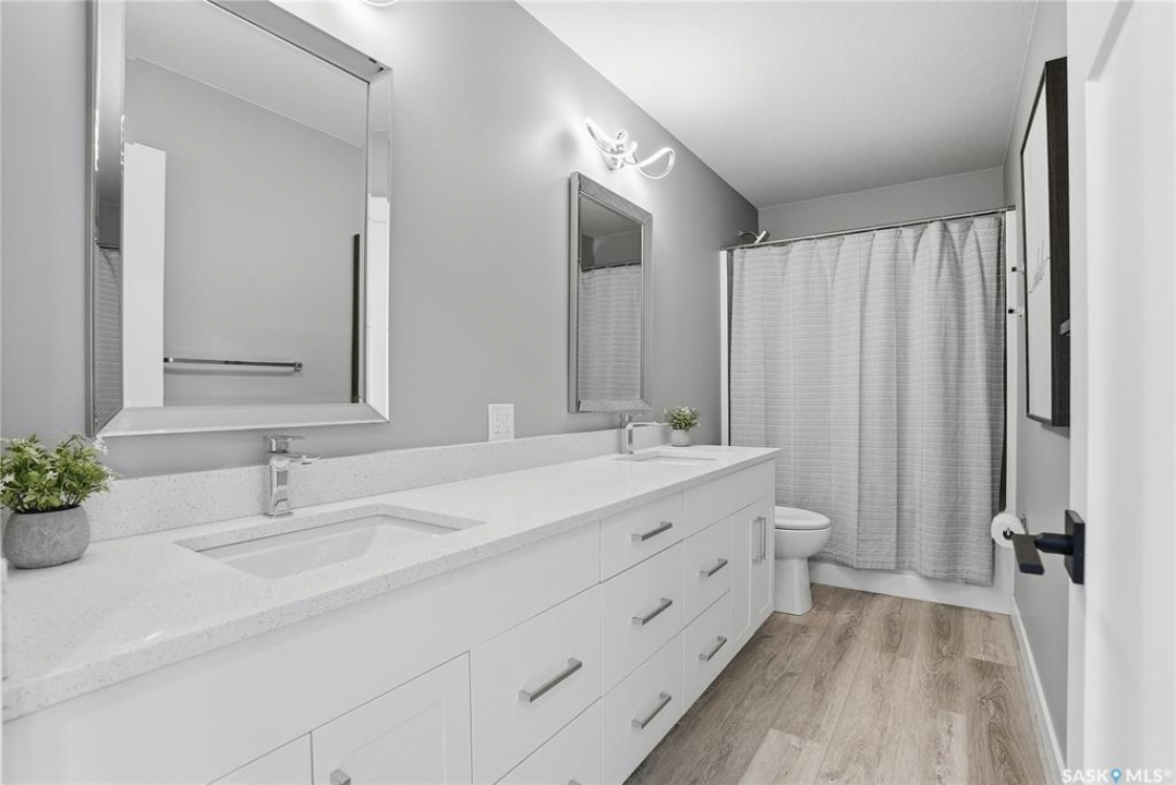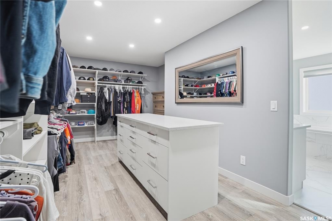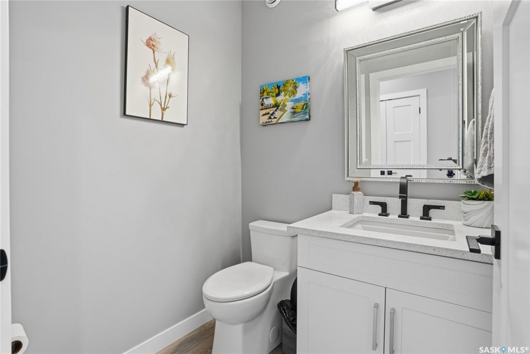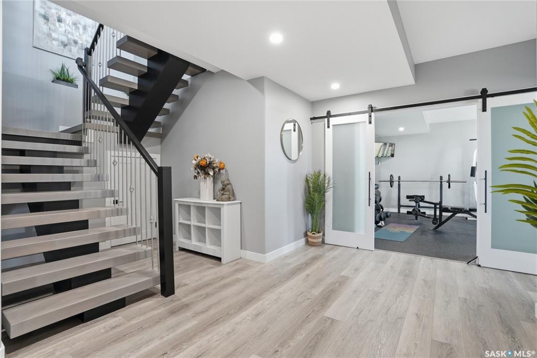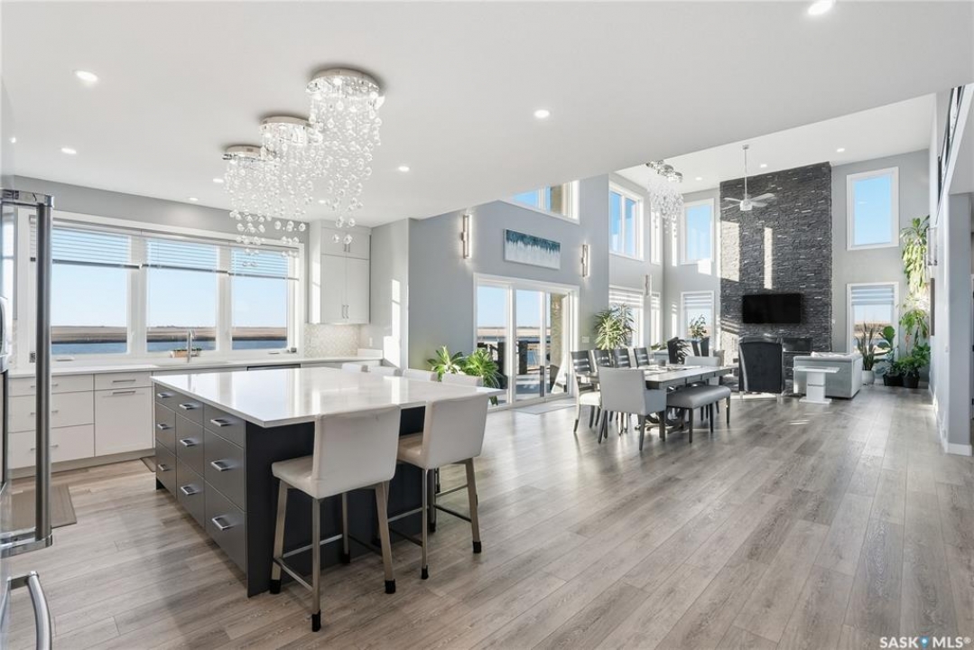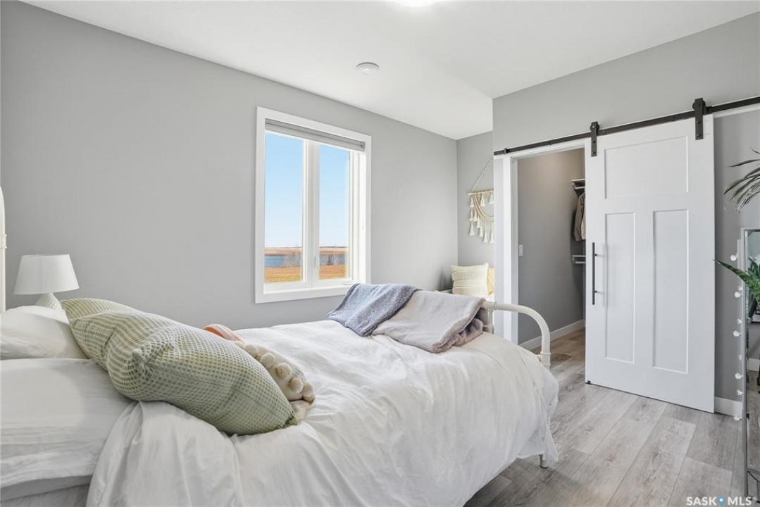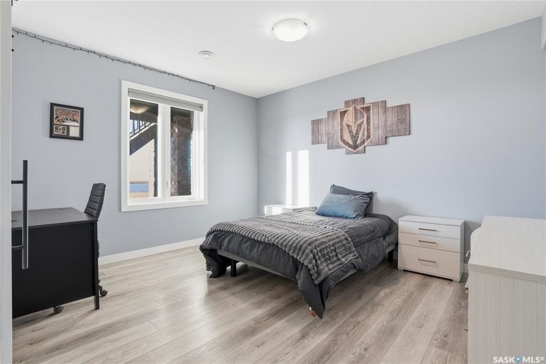 Located 30 minutes east of Saskatoon, this exceptional 2021 custom-built two-storey home spans over 3,700 sq. ft. above grade with a fully finished walkout basement, perfectly positioned to capture sweeping views of rolling hills and endless sunsets. The main floor's open-concept design showcases a chef-inspired kitchen, elegant dining area, and a grand great room with a striking gas fireplace framed by expansive windows. A spacious mudroom seamlessly connects to the heated 3-car garage, complemented by an additional single garage. The main level also features a private office, laundry, and powder room. Upstairs, discover an impressive bonus room and a luxurious primary bedroom complete with a spa-style 5-piece ensuite and a walk-in closet designed to impress, plus two additional bedrooms and a 4-piece bath. The walkout level extends the living space with two more bedrooms, a full bath, a family room with a gas fireplace and wet bar, and a fitness room. With city water, dual furnaces and A/C units, in-floor heat in the garage and basement, a mature shelterbelt, and absolute peace and privacy, this remarkable property redefines country luxury. You'll want to see this incredible property for yourself!