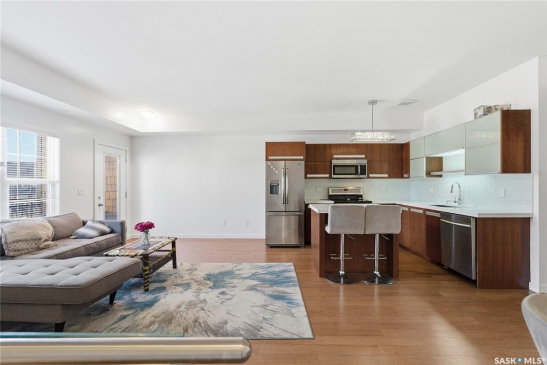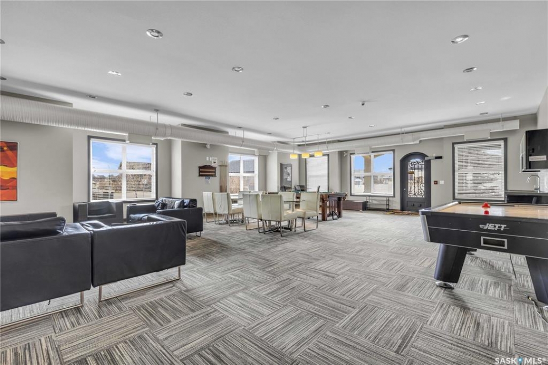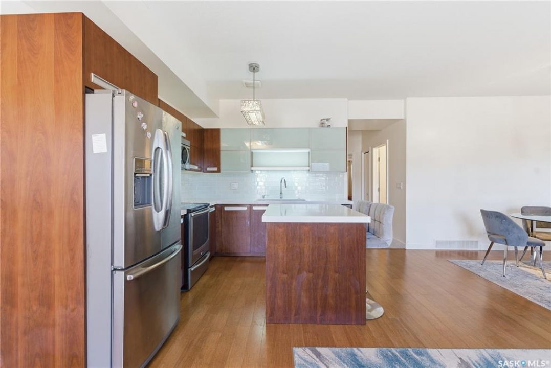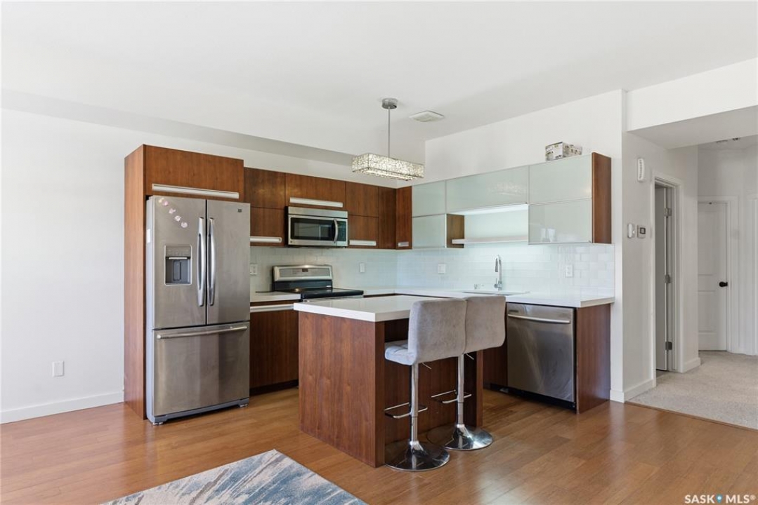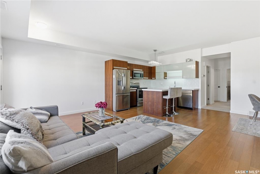 Discover the largest unit in the Ginger Lofts complex, featuring the most expansive balcony and two electrified parking stalls. This modern, open-concept second-floor condo offers a bright and functional layout, perfect for comfortable living and entertaining. The inviting living room opens onto a large east-facing balcony, ideal for enjoying your morning coffee or evening relaxation. The stylish kitchen showcases quartz countertops, stainless steel appliances, and a generous dining area — all enhanced by beautiful bamboo hardwood flooring throughout the main living spaces. This unit includes two well-sized bedrooms and a spacious four-piece bathroom featuring a quartz countertop and porcelain tile flooring. The in-suite laundry, conveniently located in the utility room, also provides additional storage space. Residents enjoy access to an impressive clubhouse equipped with an indoor saltwater pool, saltwater hot tub, fully outfitted fitness room suitable for all levels, a lounge with billiards, a furnished patio area, outdoor BBQs, and more. With low condo fees, this property presents an excellent opportunity for first-time buyers, students, or investors alike. Ideally situated close to all amenities in Brighton, with quick access to the freeway and the University of Saskatchewan. Call today to schedule your private viewing and experience all that this exceptional property has to offer.