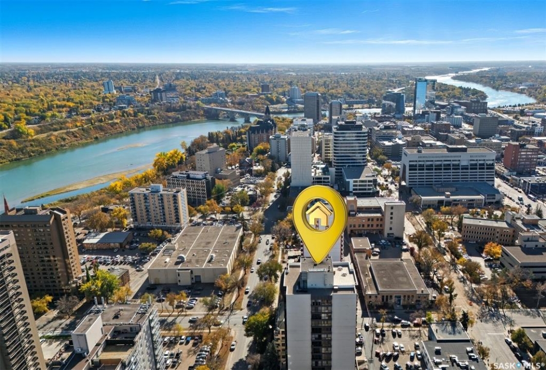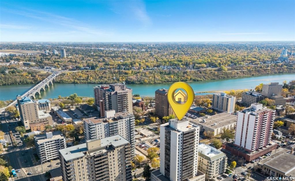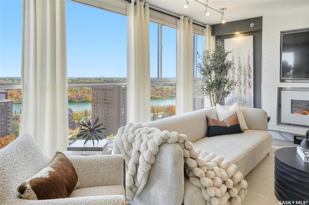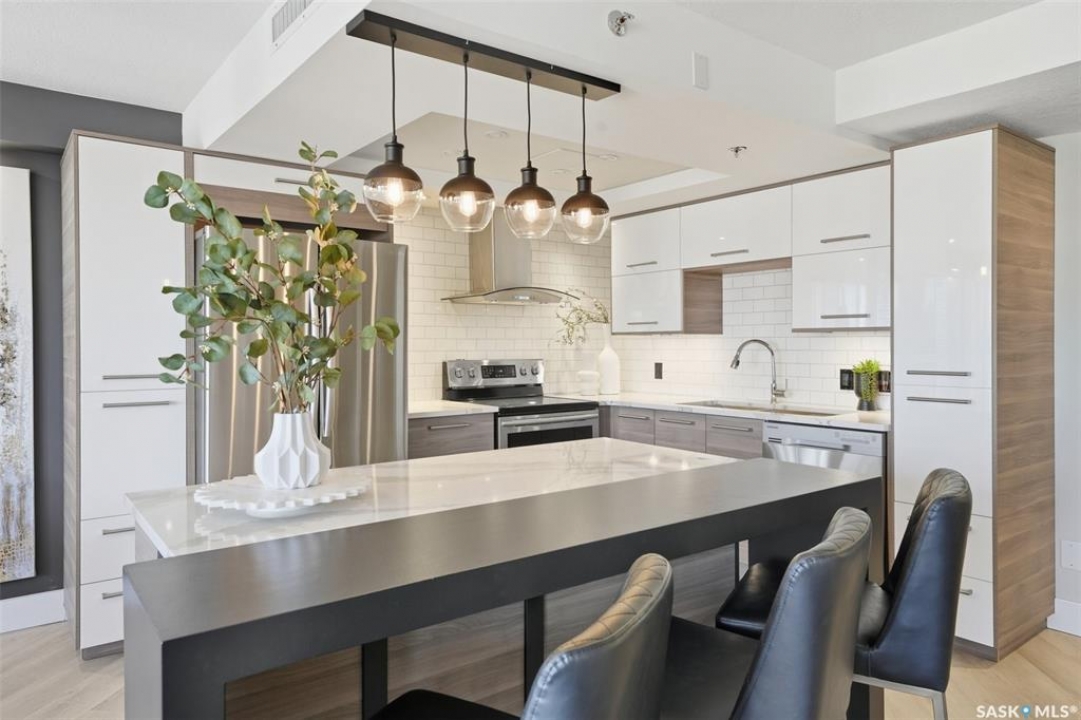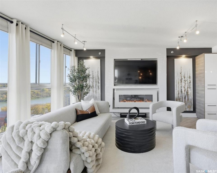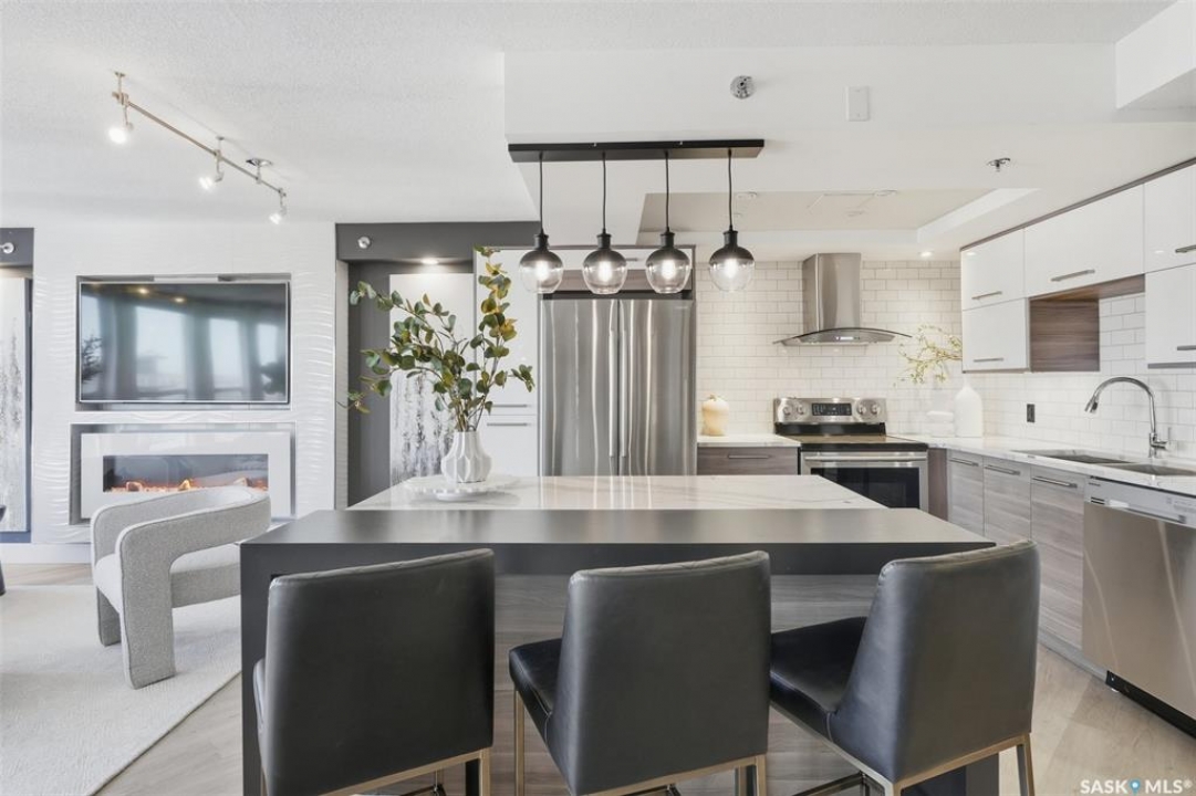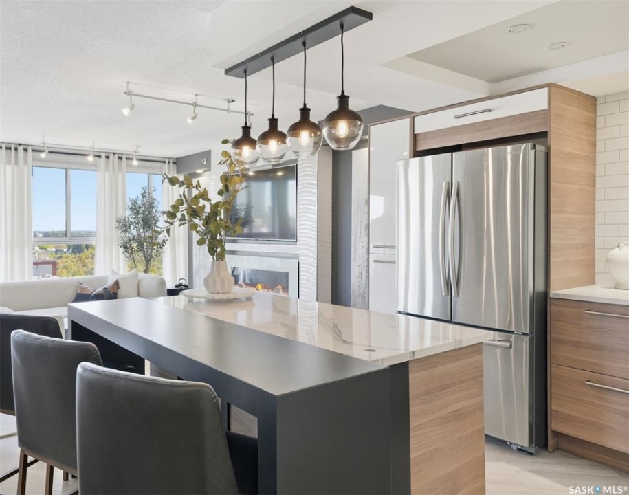 Experience Downtown Saskatoon Penthouse Living with an amazing View of the River! Indulge your desire for high-end, maintenance-free living with this breathtaking 1,528 sqft Penthouse Condominium in the vibrant core of Saskatoon. Far more than a home, this is a lifestyle defined by convenience and sophistication, boasting an enviable Walk Score of 96 and a Bike Score of 99. This professionally renovated sanctuary is a testament to modern design. The stunning kitchen is a chef's dream, featuring upgraded appliances, sleek quartz countertops, and a generous island with a sit-up bar that flows seamlessly into the main living space. The entire unit has been elevated with modern flooring, designer paint tones, and updated light fixtures, culminating in the removal & replacement of the dated ceiling for a smooth, contemporary finish. Designer touches by Fresco Interiors, including but not limited to custom drapery, add a final touch of tailored elegance. Upgraded blinds throughout give you privacy when you want it most. Step outside and immerse yourself in the city's best. You are mere steps from the 60 km of trails in the serene Meewasin Valley. Enjoy cultural gems like the Remai Modern, Persephone Theatre, and the charming seasonal Shakespeare on the Saskatchewan. Every amenity—from fine dining and popular taverns to museums and nature parks—is just a short, pleasant stroll away. The Terrace amenities redefine community living, offering a large facility with a swimming pool, hot tub, sauna, an adjacent indoor lounge, and an expansive outdoor patio with community barbecues. For an even more spectacular experience, retreat to the rooftop patio for breathtaking, panoramic city views. Your exclusive, indoor parking spot means you can safely forget about your vehicle and embrace urban life. Don't just move... move up! Call today for a private viewing of this affordable, classy, and perfectly located penthouse on Fifth Avenue.