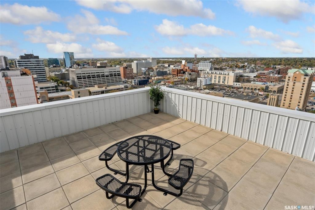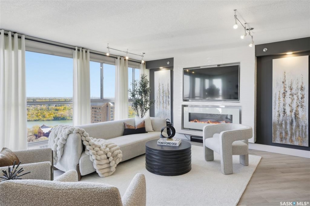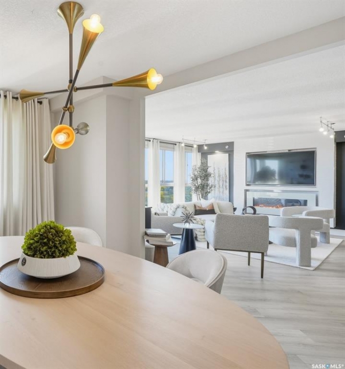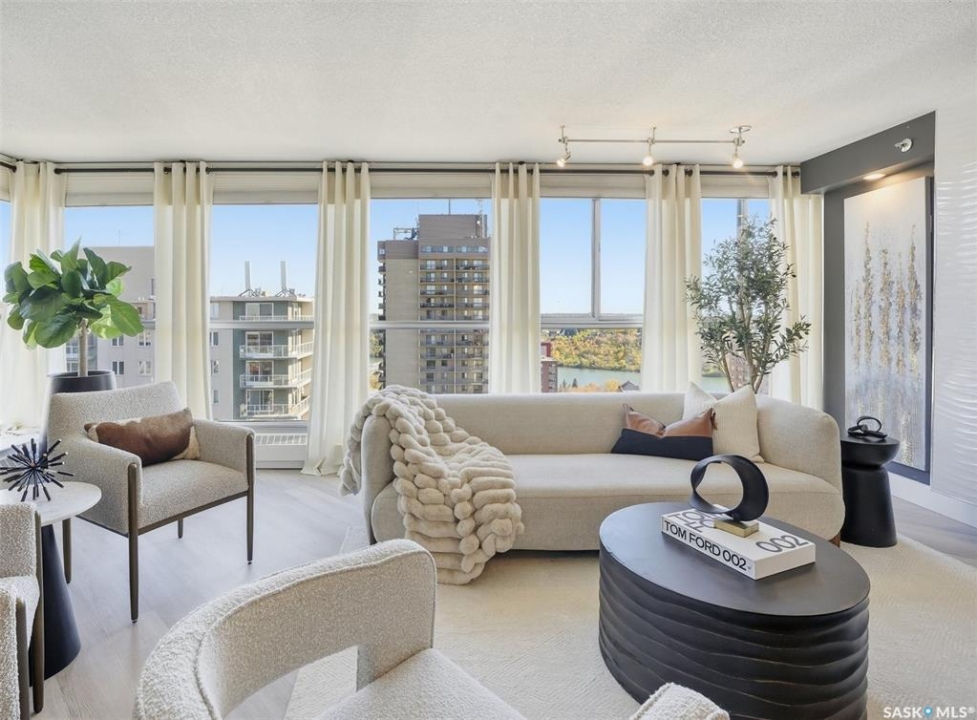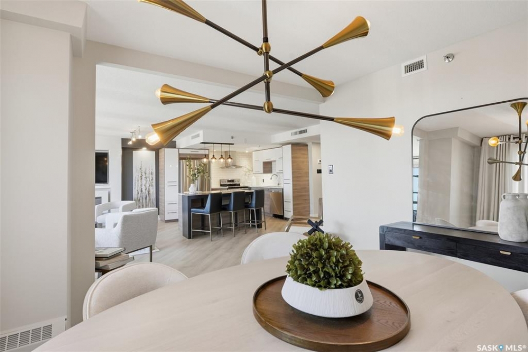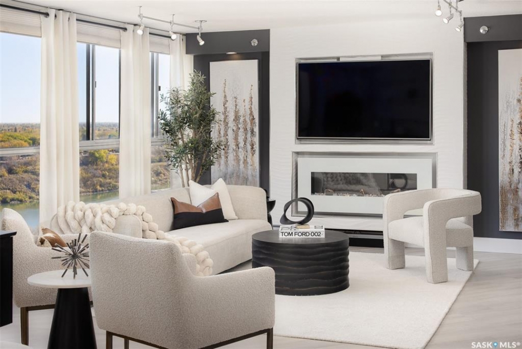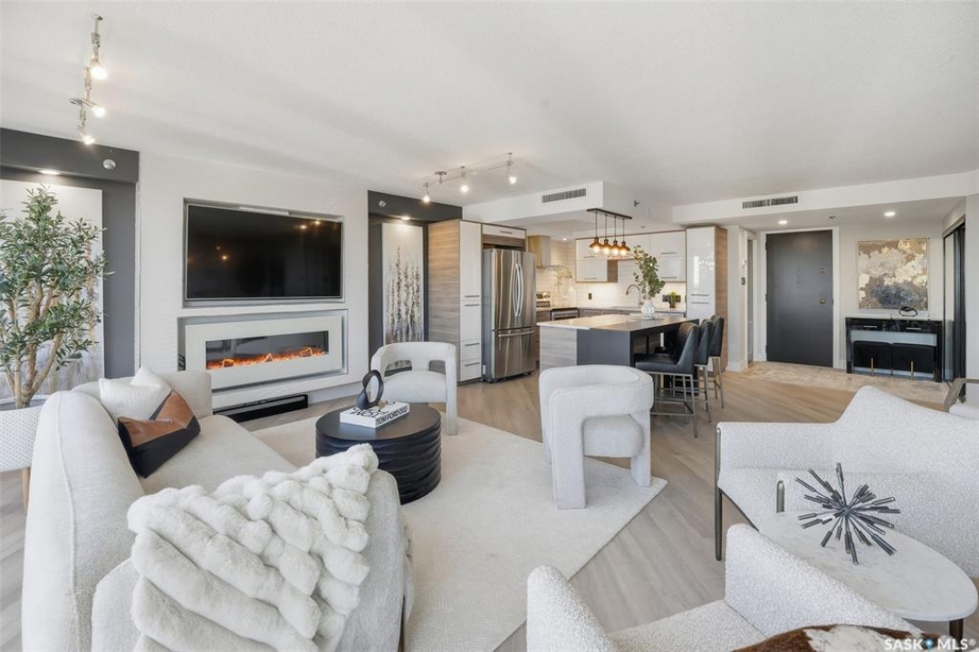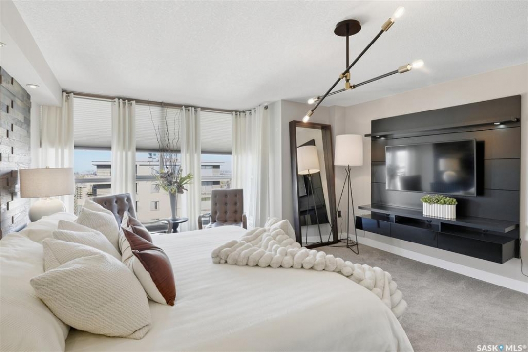 Experience Downtown Saskatoon Penthouse Living with an amazing View of the River! Indulge your desire for high-end, maintenance-free living with this breathtaking 1,528 sqft Penthouse Condominium in the vibrant core of Saskatoon. Far more than a home, this is a lifestyle defined by convenience and sophistication, boasting an enviable Walk Score of 96 and a Bike Score of 99. This professionally renovated sanctuary is a testament to modern design. The stunning kitchen is a chef's dream, featuring upgraded appliances, sleek quartz countertops, and a generous island with a sit-up bar that flows seamlessly into the main living space. The entire unit has been elevated with modern flooring, designer paint tones, and updated light fixtures, culminating in the removal & replacement of the dated ceiling for a smooth, contemporary finish. Designer touches by Fresco Interiors, including but not limited to custom drapery, add a final touch of tailored elegance. Upgraded blinds throughout give you privacy when you want it most. Step outside and immerse yourself in the city's best. You are mere steps from the 60 km of trails in the serene Meewasin Valley. Enjoy cultural gems like the Remai Modern, Persephone Theatre, and the charming seasonal Shakespeare on the Saskatchewan. Every amenity—from fine dining and popular taverns to museums and nature parks—is just a short, pleasant stroll away. The Terrace amenities redefine community living, offering a large facility with a swimming pool, hot tub, sauna, an adjacent indoor lounge, and an expansive outdoor patio with community barbecues. For an even more spectacular experience, retreat to the rooftop patio for breathtaking, panoramic city views. Your exclusive, indoor parking spot means you can safely forget about your vehicle and embrace urban life. Don't just move... move up! Call today for a private viewing of this affordable, classy, and perfectly located penthouse on Fifth Avenue.