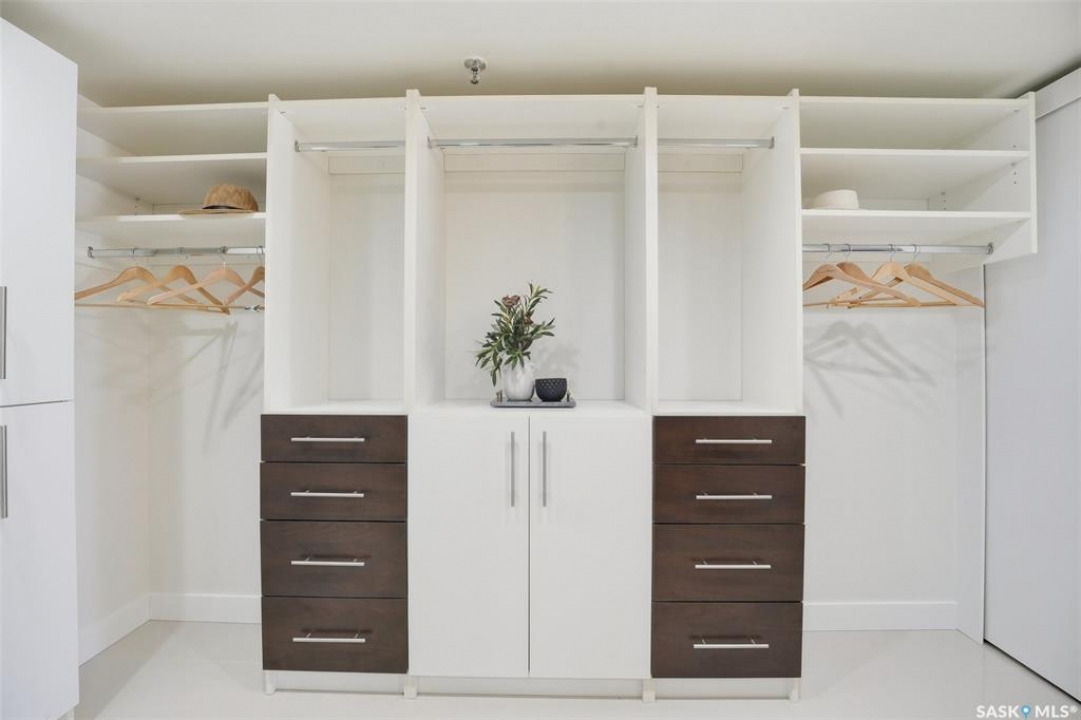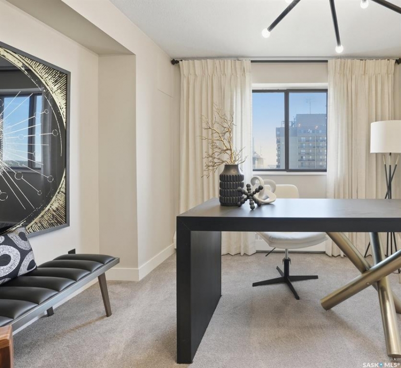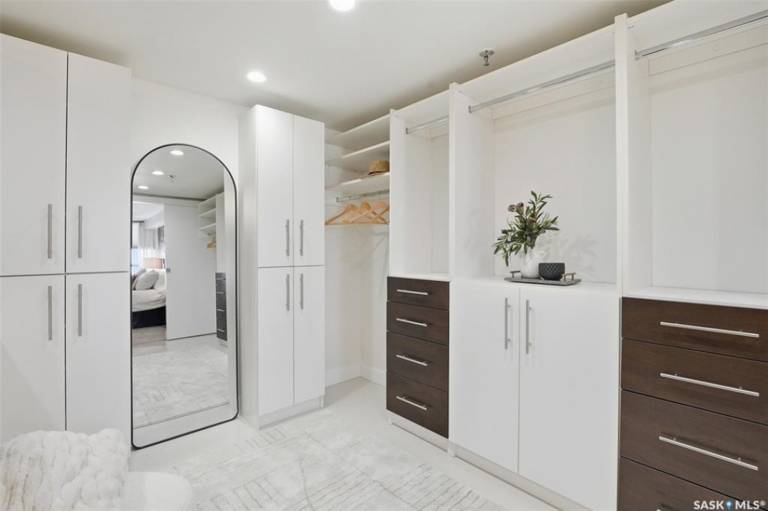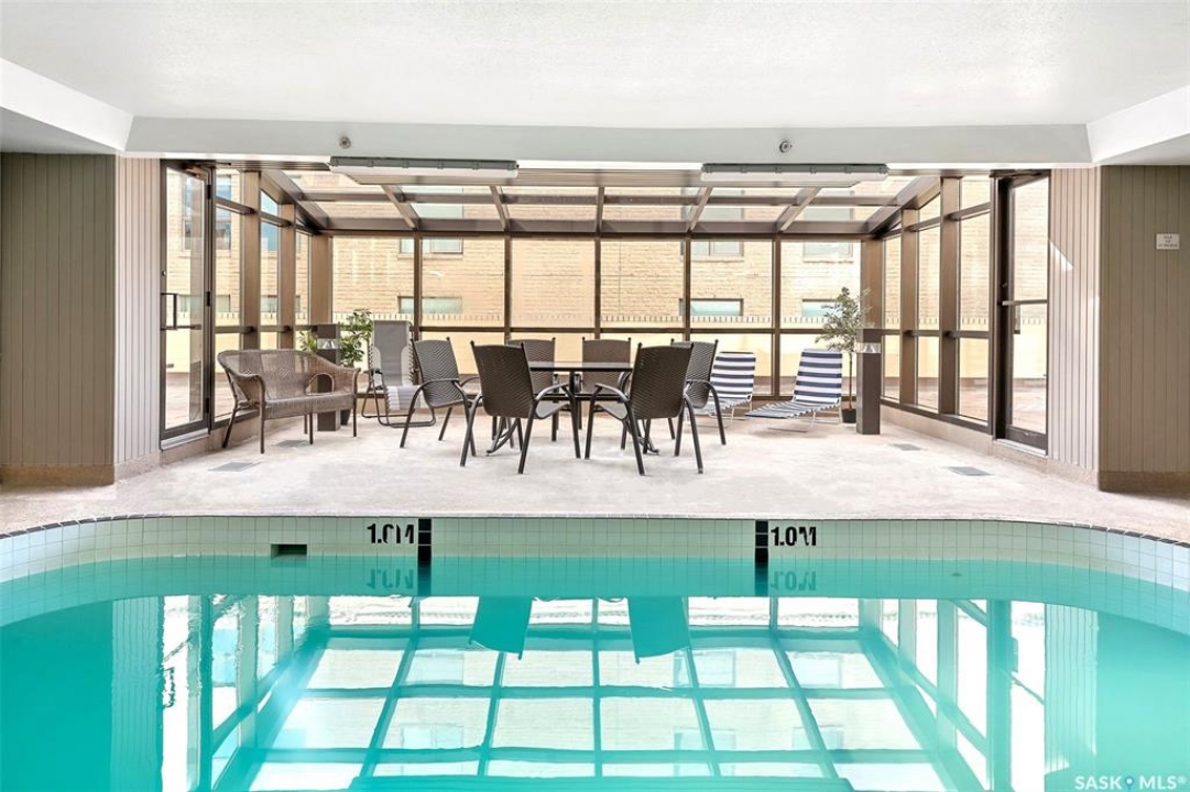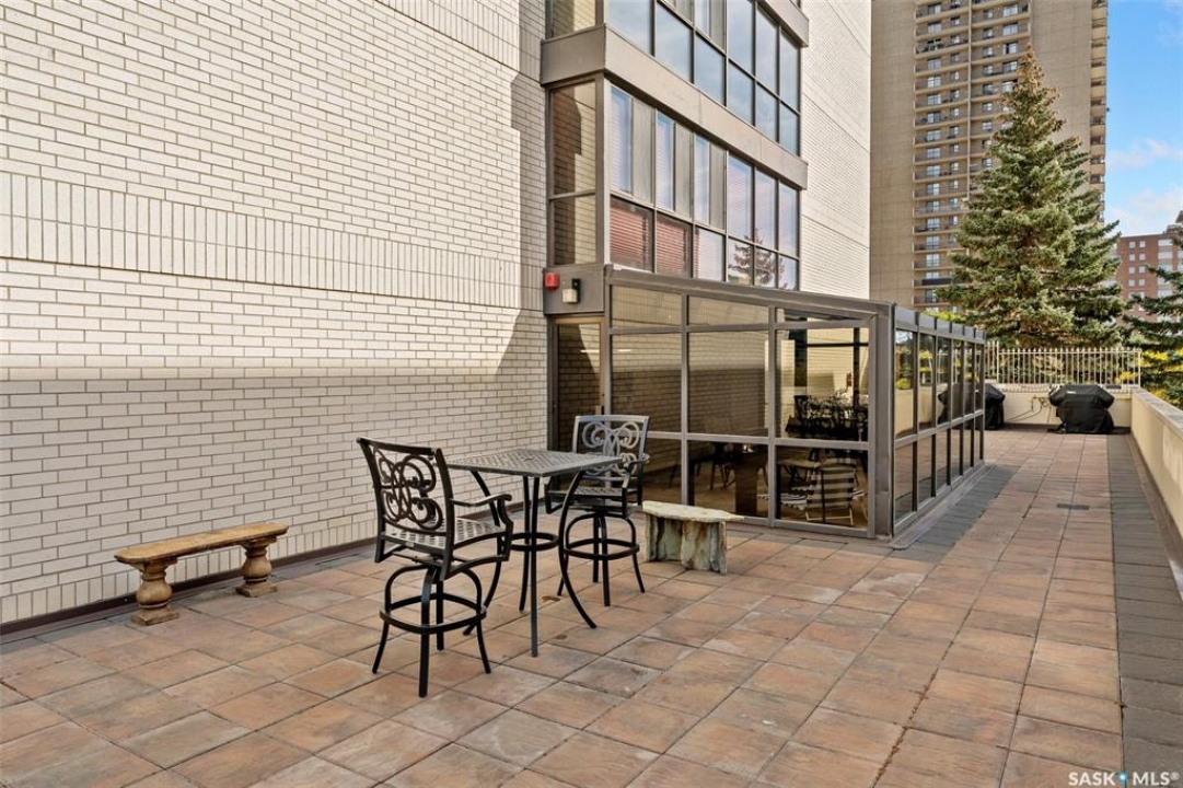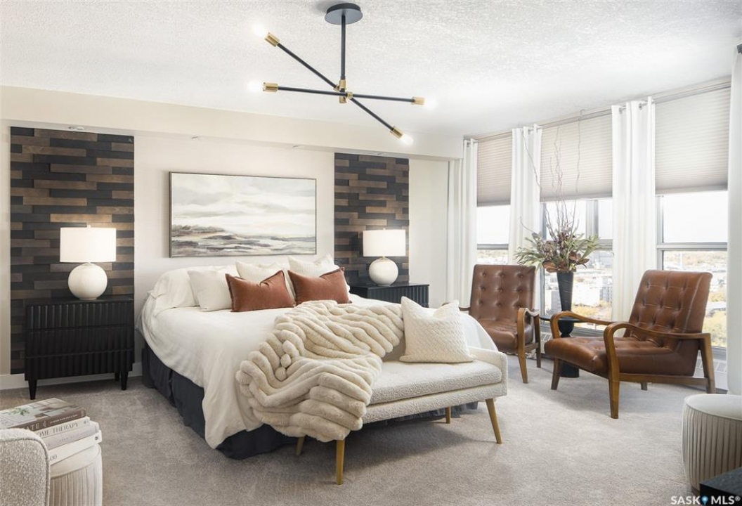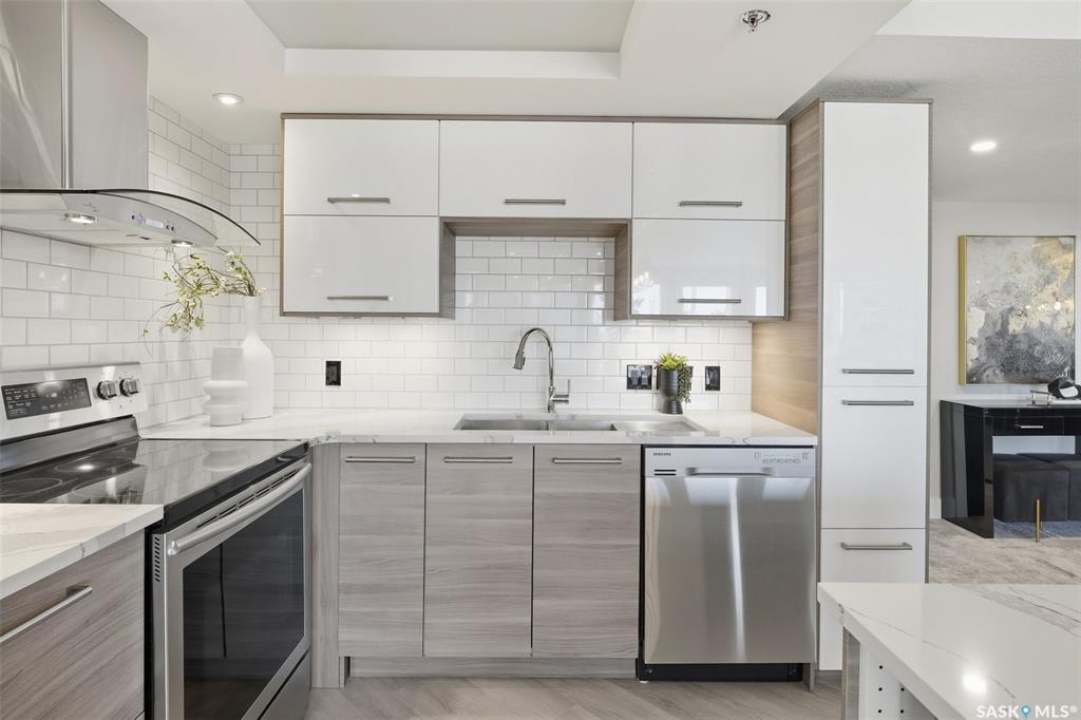 Experience Downtown Saskatoon Penthouse Living with an amazing View of the River! Indulge your desire for high-end, maintenance-free living with this breathtaking 1,528 sqft Penthouse Condominium in the vibrant core of Saskatoon. Far more than a home, this is a lifestyle defined by convenience and sophistication, boasting an enviable Walk Score of 96 and a Bike Score of 99. This professionally renovated sanctuary is a testament to modern design. The stunning kitchen is a chef's dream, featuring upgraded appliances, sleek quartz countertops, and a generous island with a sit-up bar that flows seamlessly into the main living space. The entire unit has been elevated with modern flooring, designer paint tones, and updated light fixtures, culminating in the removal & replacement of the dated ceiling for a smooth, contemporary finish. Designer touches by Fresco Interiors, including but not limited to custom drapery, add a final touch of tailored elegance. Upgraded blinds throughout give you privacy when you want it most. Step outside and immerse yourself in the city's best. You are mere steps from the 60 km of trails in the serene Meewasin Valley. Enjoy cultural gems like the Remai Modern, Persephone Theatre, and the charming seasonal Shakespeare on the Saskatchewan. Every amenity—from fine dining and popular taverns to museums and nature parks—is just a short, pleasant stroll away. The Terrace amenities redefine community living, offering a large facility with a swimming pool, hot tub, sauna, an adjacent indoor lounge, and an expansive outdoor patio with community barbecues. For an even more spectacular experience, retreat to the rooftop patio for breathtaking, panoramic city views. Your exclusive, indoor parking spot means you can safely forget about your vehicle and embrace urban life. Don't just move... move up! Call today for a private viewing of this affordable, classy, and perfectly located penthouse on Fifth Avenue.