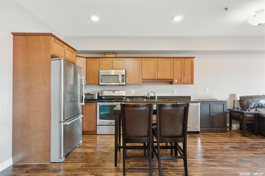 Experience top-floor living in this exceptional, west-facing, 2-bedroom, 2-bathroom condo, perfectly situated in the highly desirable neighbourhood of Willowgrove. This unit's features include a spacious and modern open concept with 9-foot ceilings that create an airy and expansive feel, granite countertops, stainless steel appliances, easy-to-care-for tile and laminate flooring, and Hunter Douglas blinds throughout. Enjoy the convenience and security of one underground parking stall, ensuring your vehicle is safe from the elements and ready to roll, saving you time and effort during the coldest of winters. The underground storage locker is perfect for storing your bikes and other gear. An abundance of visitor parking spots ensures your guests always have a place to park. For those who appreciate privacy, step outside and enjoy a 120-square-foot balcony that is afternoon and evening sunned. Relax and unwind on the largest balcony that the building offers with a tranquil view of the clock-square green space below and an unobstructed panorama of the skyline above—a perfect spot for your morning coffee or evening relaxation. The location is a true highlight. You'll find yourself within easy walking distance of a variety of grocery stores, banks, restaurants, and medical offices. With a bus stop right outside the building and a new daycare nearing completion across the street, this condo is a fantastic fit for both U of S students and small families seeking convenience and accessibility. Pets allowed with board approval. This condo truly has it all. Book your private showing today and discover your new home.