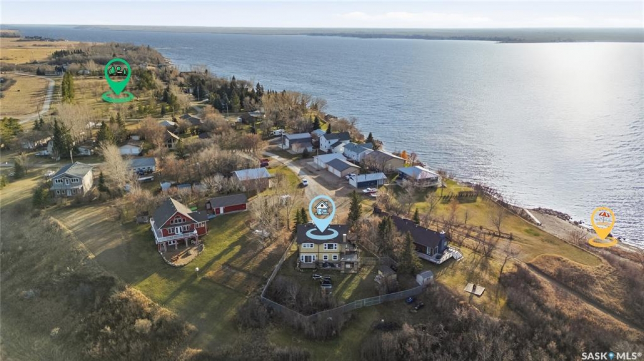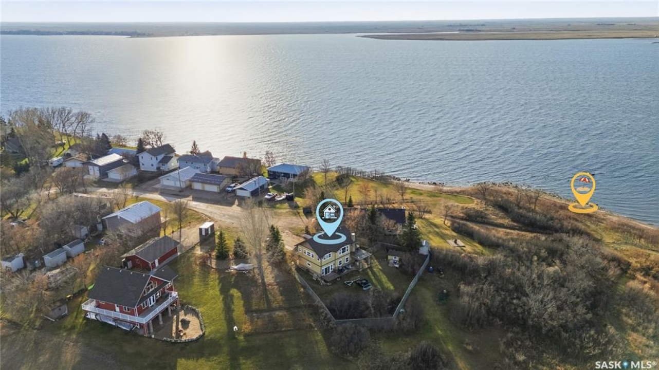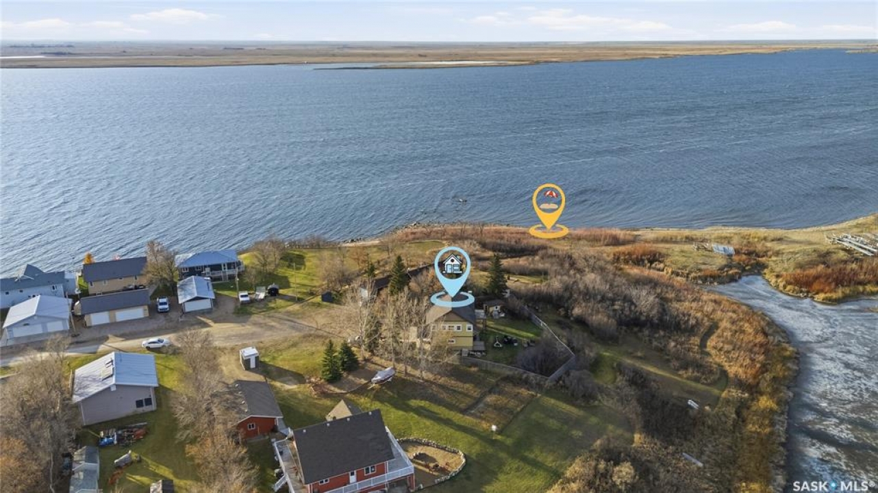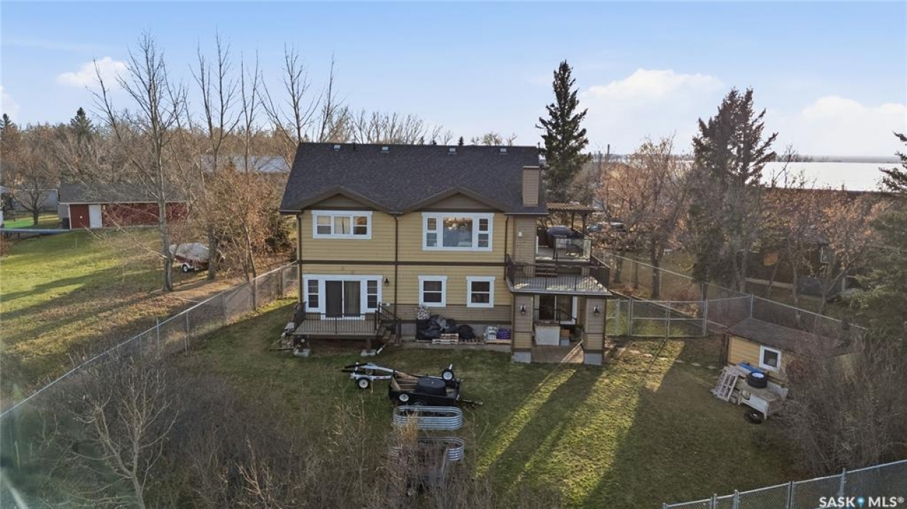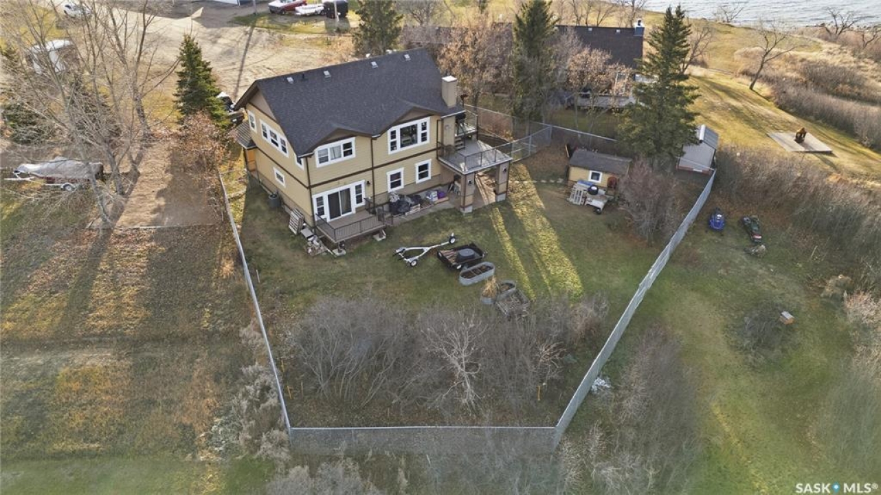 Seize your chance to claim a slice of heaven at Last Mountain Lake! Introducing this remarkable custom-built lakeside residence, offering breathtaking views from nearly every room. With impressive curb appeal, the exterior features low-maintenance composite siding, soffit, and a welcoming veranda. Upon stepping inside, you are welcomed by an open foyer that leads to a 4-piece bathroom complete with a 5-foot walk-in shower, alongside a spacious bedroom that boasts garden doors opening to its own secluded deck. The main level also provides convenient access to a 24' x 26' insulated garage, which includes a heated insulated room utilized for laundry. Additionally, the garage connects to a charming 3-season sunroom, not counted in the total square footage. An elegant open staircase ascends to the upper level, where you'll find a bright and airy layout adorned with vaulted ceilings and stunning views from nearly every corner. The chef's kitchen impresses with abundant rich cabinetry featuring soft-close doors and drawers, ample counter space, an eat-at island with a new ceramic cooktop, and all high-end stainless-steel appliances included. The living and dining areas are perfect for cozy gatherings around the natural gas stone fireplace or stepping out onto the pergola-covered deck equipped with dura decking and glass railing, offering another opportunity to soak in the picturesque surroundings. The upper level also includes a generous primary bedroom with his-and-hers closets, and another bedroom/den currently serving as a laundry/office space. The beautifully landscaped yard is a true gem, featuring a new chain link fence, with many gates for convenient access to water or yard. Noteworthy features include a year-round public water source and a 1500-gallon fiberglass septic tank. This exceptional home is built on piles, and detailed building plans are available for review. Don't miss your chance to live your best life-the lake life.