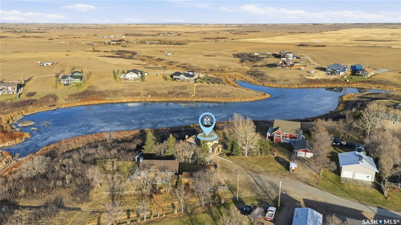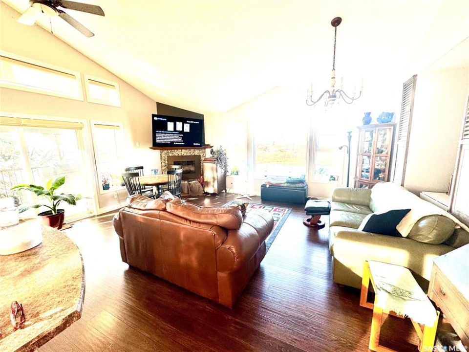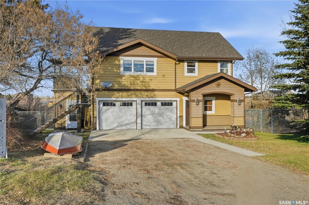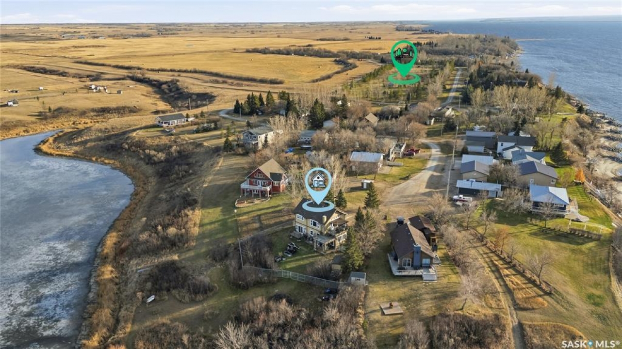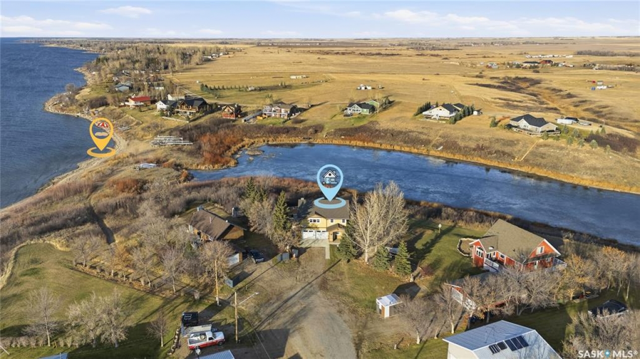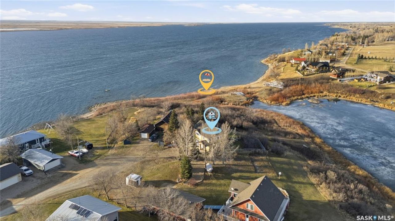 Seize your chance to claim a slice of heaven at Last Mountain Lake! Introducing this remarkable custom-built lakeside residence, offering breathtaking views from nearly every room. With impressive curb appeal, the exterior features low-maintenance composite siding, soffit, and a welcoming veranda. Upon stepping inside, you are welcomed by an open foyer that leads to a 4-piece bathroom complete with a 5-foot walk-in shower, alongside a spacious bedroom that boasts garden doors opening to its own secluded deck. The main level also provides convenient access to a 24' x 26' insulated garage, which includes a heated insulated room utilized for laundry. Additionally, the garage connects to a charming 3-season sunroom, not counted in the total square footage. An elegant open staircase ascends to the upper level, where you'll find a bright and airy layout adorned with vaulted ceilings and stunning views from nearly every corner. The chef's kitchen impresses with abundant rich cabinetry featuring soft-close doors and drawers, ample counter space, an eat-at island with a new ceramic cooktop, and all high-end stainless-steel appliances included. The living and dining areas are perfect for cozy gatherings around the natural gas stone fireplace or stepping out onto the pergola-covered deck equipped with dura decking and glass railing, offering another opportunity to soak in the picturesque surroundings. The upper level also includes a generous primary bedroom with his-and-hers closets, and another bedroom/den currently serving as a laundry/office space. The beautifully landscaped yard is a true gem, featuring a new chain link fence, with many gates for convenient access to water or yard. Noteworthy features include a year-round public water source and a 1500-gallon fiberglass septic tank. This exceptional home is built on piles, and detailed building plans are available for review. Don't miss your chance to live your best life-the lake life.