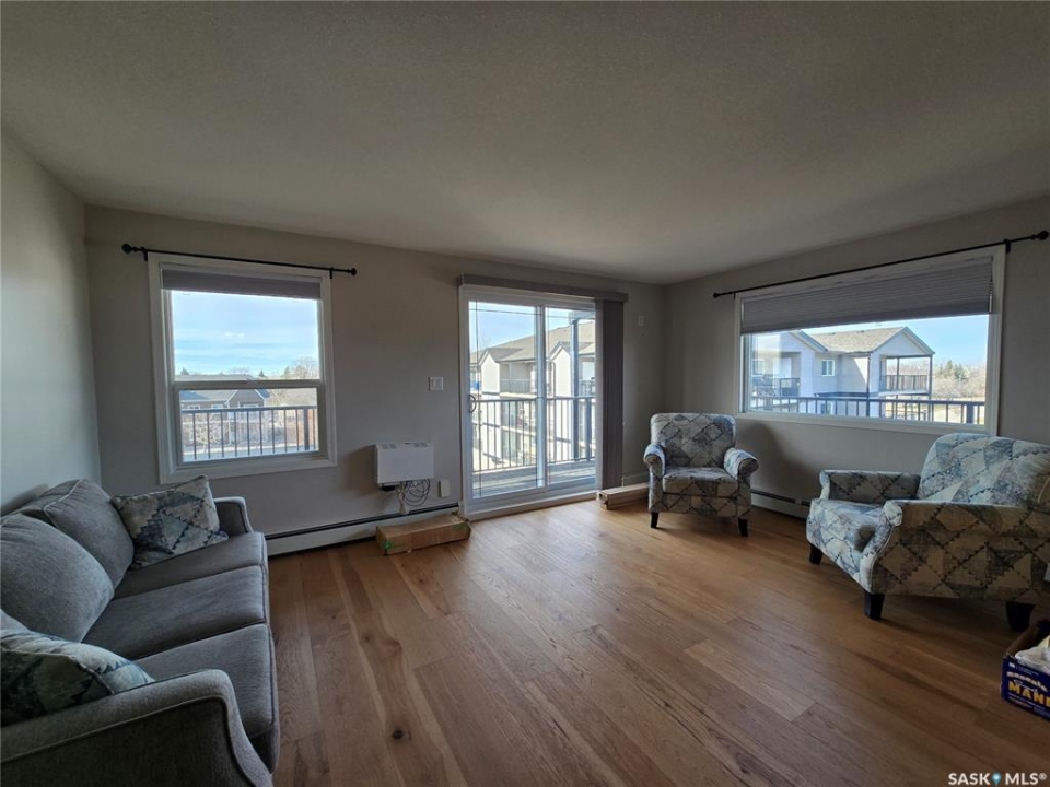 Welcome to Bannerman Park Estates, this is a corner unit on the 4th floor giving a wide expanse of views and a wrap around balcony. The main living area is an open floor plan with tons of natural light, and upgraded hardwood flooring throughout. The kitchen offers plenty of counter and cabinet space and nice appliances. The master bedroom is large, with lots of storage, and a three piece en-suite. There is a second bedroom , a full bath, and a laundry room completing the living space. Bannerman Park Estates offers a well cared for building, with heated parking , and plenty of fellowship. If you're looking for that perfect condo unit in the perfect location, this one is for you.