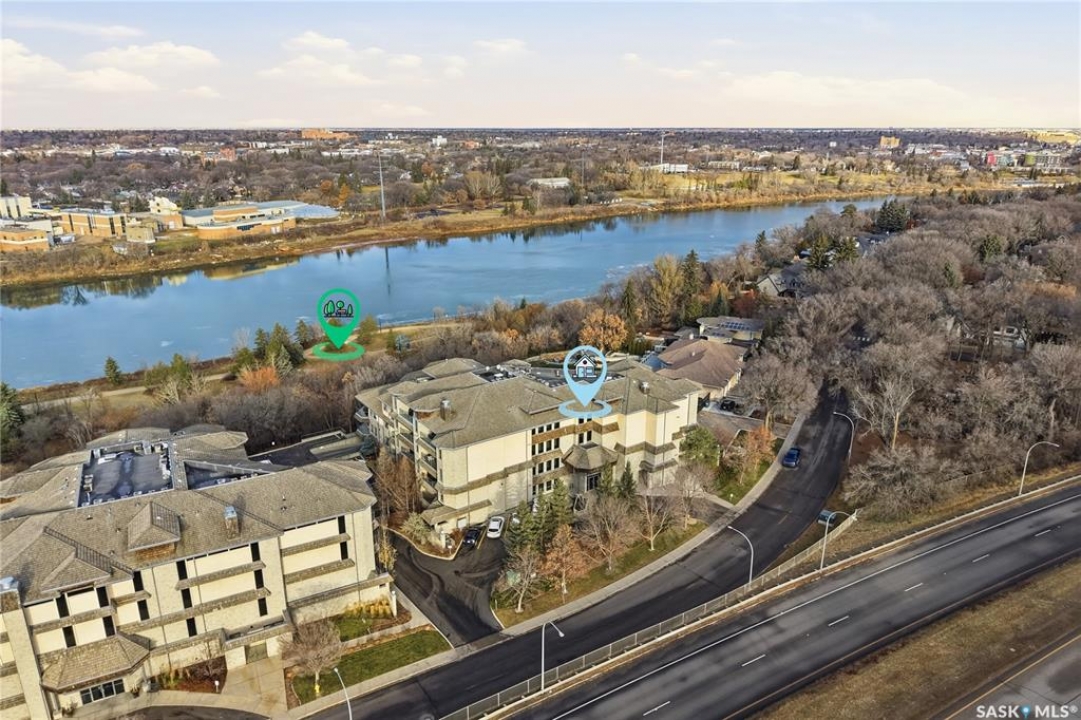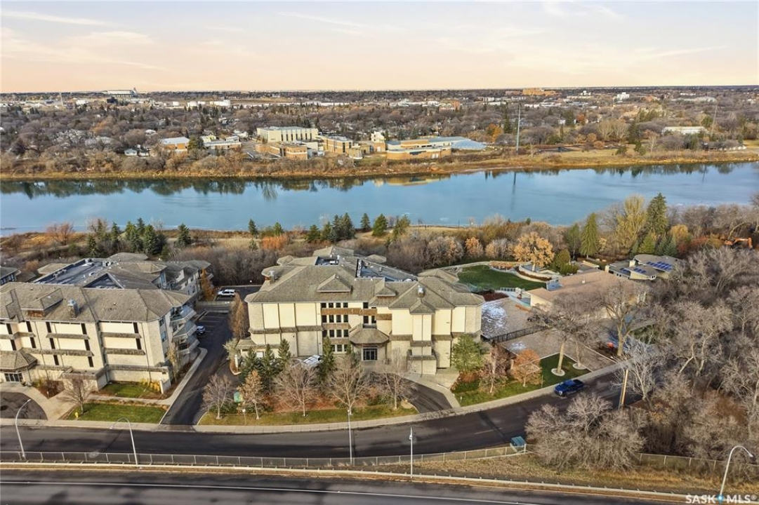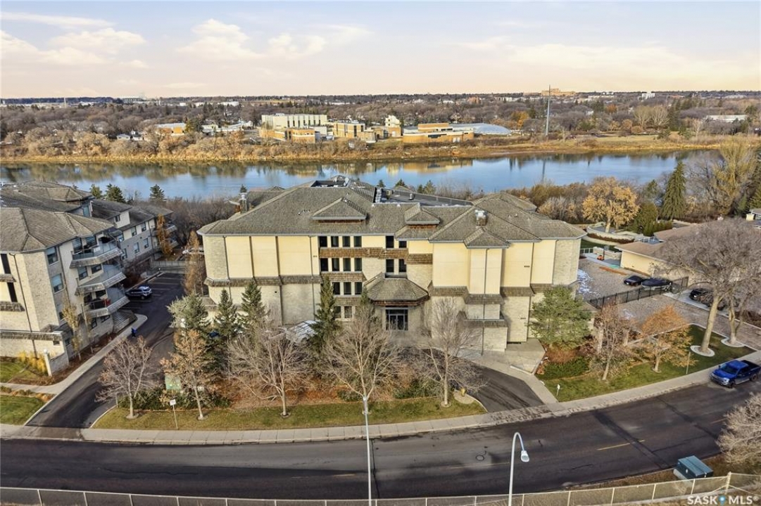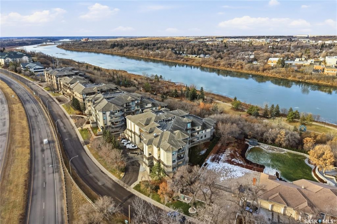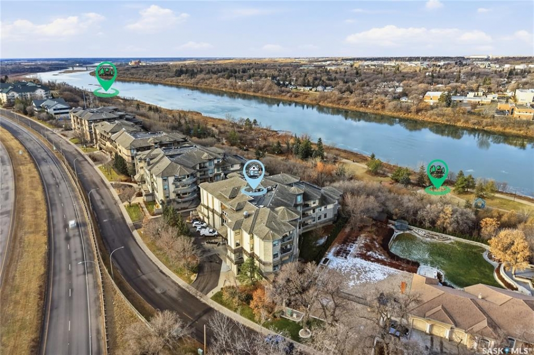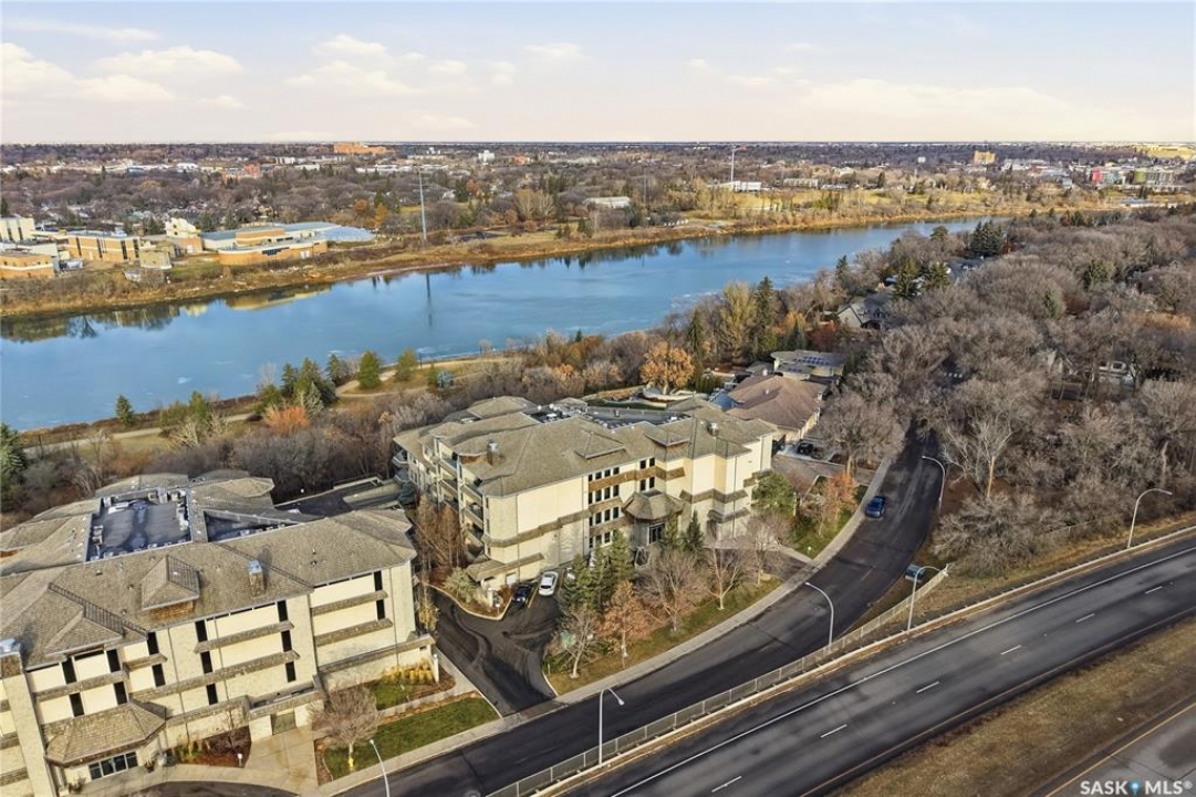 Welcome to The Landing and this well cared for, professionally managed condo, located on the river bank with a great river view, location for both quiet living and easy access to down town, shopping and freeways out of the city. The moment you walk in you are greeted by the clean and bright kitchen with white quartz countertops, light maple wood cabinets, stainless steel appliances including fridge, stove, dishwasher and microwave hood fan with direct vent to outside. It also has undercabinet accent lighting, pendant lights over the island with breakfast bar, a couple cabinet display doors and built in wine rack. Behind the kitchen is the dining area with rich hardwood floors that run into the living room and fill the condo with warmth. The off white walls in this living area add brightness and a lovely contrast to the flooring, there is plenty of space for your furniture and huge windows that fill the space with natural and healthy sunlight while giving you a fabulous view of the South Saskatchewan river side below. You can also access the back deck from here where you can relax and enjoy the suns warmth with your favorite bevy and prepare a meal on your barbeque that is connected to the natural gas outlet, and listen to the geese as they float by on the river. Down the hall you will find the spare bedroom with plush carpet across from the 4 piece bathroom. The master bedroom found at the end of the hall is huge, has cozy carpet flooring, a walkin closet and a 3 piece ensuite for your convenience. Across from the kitchen is a double wide coat closet and the laundry/storage room with stacked washer/dryer included. New to this unit is the stove, microwave, garburator, quartz countertops, sink and kitchen faucet. Enjoy the convenience of the heated underground parking and your own storage room, there is new clearcoat surface underground and new pavement outside. Close to the Meewasin Valley trail, Fred Mitchell and Gabriel dumont parks. Call today!