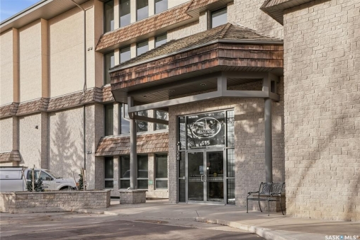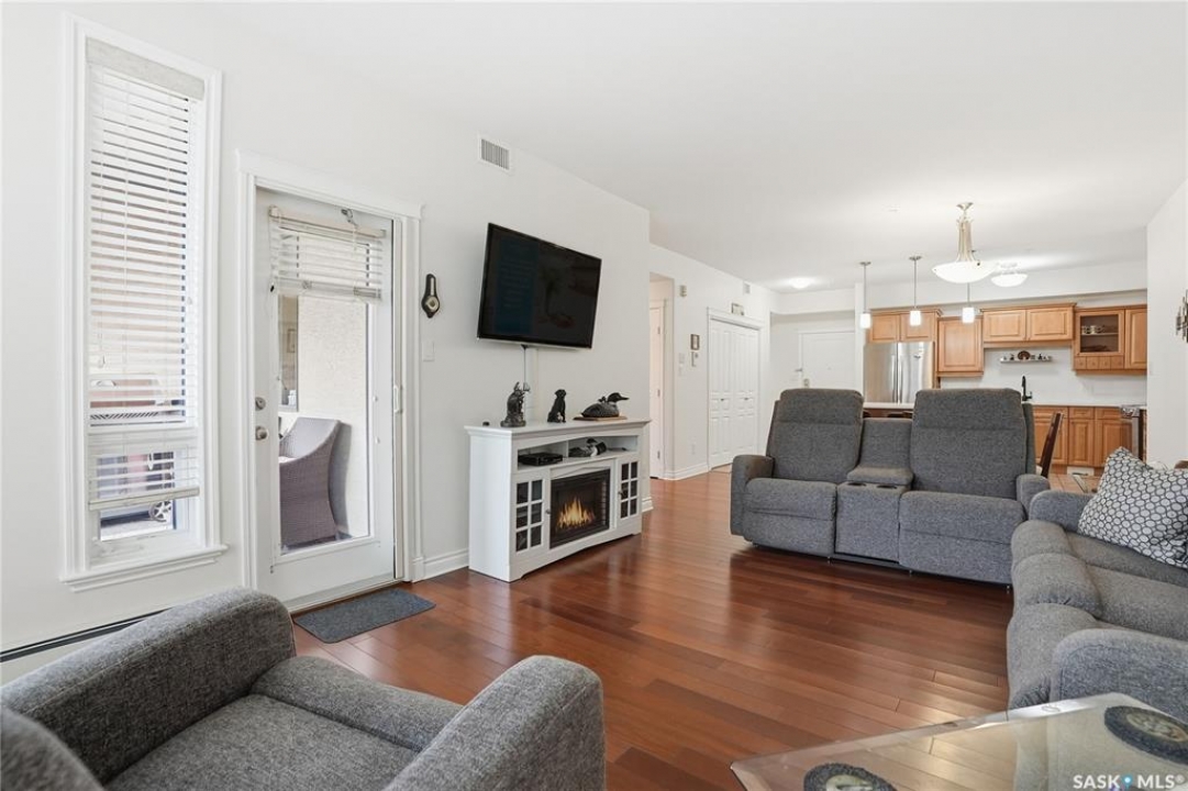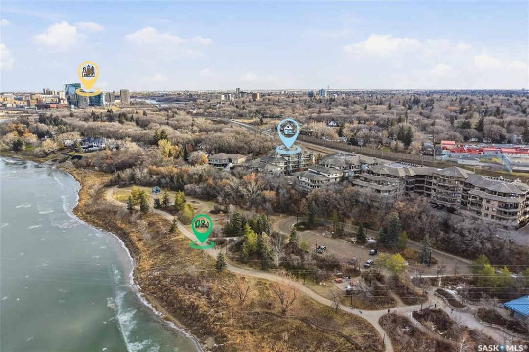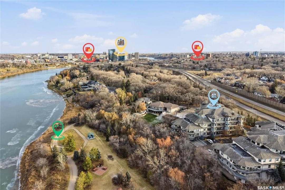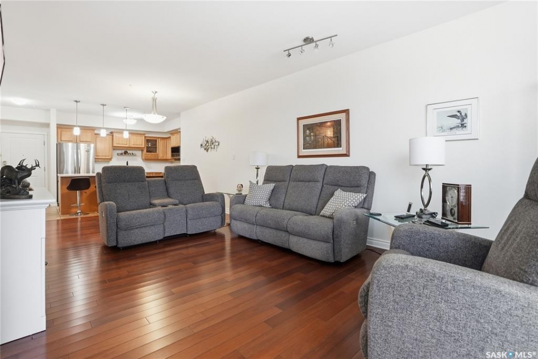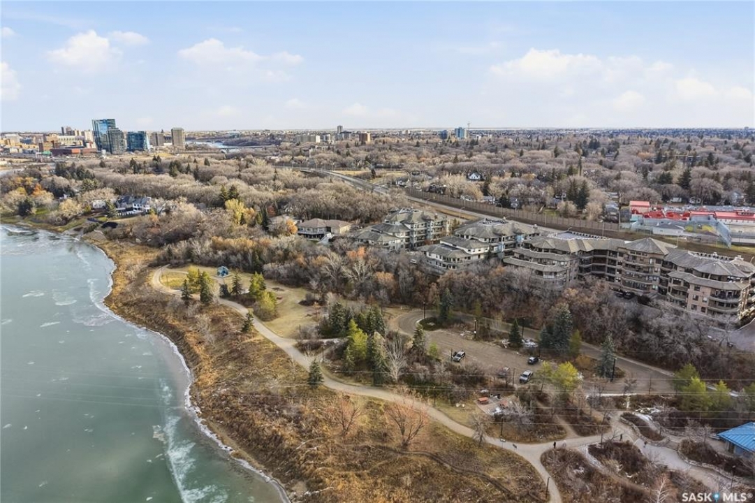 Welcome to The Landing and this well cared for, professionally managed condo, located on the river bank with a great river view, location for both quiet living and easy access to down town, shopping and freeways out of the city. The moment you walk in you are greeted by the clean and bright kitchen with white quartz countertops, light maple wood cabinets, stainless steel appliances including fridge, stove, dishwasher and microwave hood fan with direct vent to outside. It also has undercabinet accent lighting, pendant lights over the island with breakfast bar, a couple cabinet display doors and built in wine rack. Behind the kitchen is the dining area with rich hardwood floors that run into the living room and fill the condo with warmth. The off white walls in this living area add brightness and a lovely contrast to the flooring, there is plenty of space for your furniture and huge windows that fill the space with natural and healthy sunlight while giving you a fabulous view of the South Saskatchewan river side below. You can also access the back deck from here where you can relax and enjoy the suns warmth with your favorite bevy and prepare a meal on your barbeque that is connected to the natural gas outlet, and listen to the geese as they float by on the river. Down the hall you will find the spare bedroom with plush carpet across from the 4 piece bathroom. The master bedroom found at the end of the hall is huge, has cozy carpet flooring, a walkin closet and a 3 piece ensuite for your convenience. Across from the kitchen is a double wide coat closet and the laundry/storage room with stacked washer/dryer included. New to this unit is the stove, microwave, garburator, quartz countertops, sink and kitchen faucet. Enjoy the convenience of the heated underground parking and your own storage room, there is new clearcoat surface underground and new pavement outside. Close to the Meewasin Valley trail, Fred Mitchell and Gabriel dumont parks. Call today!