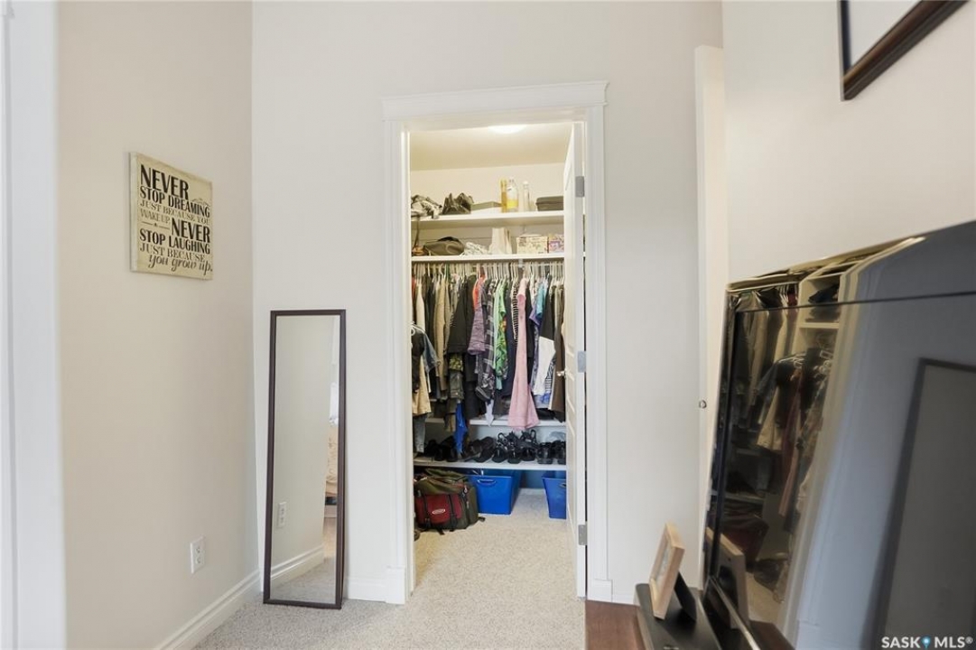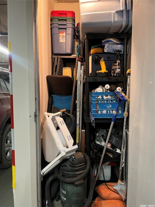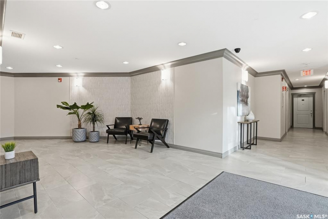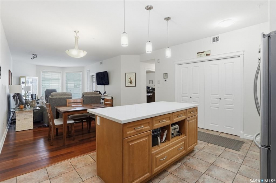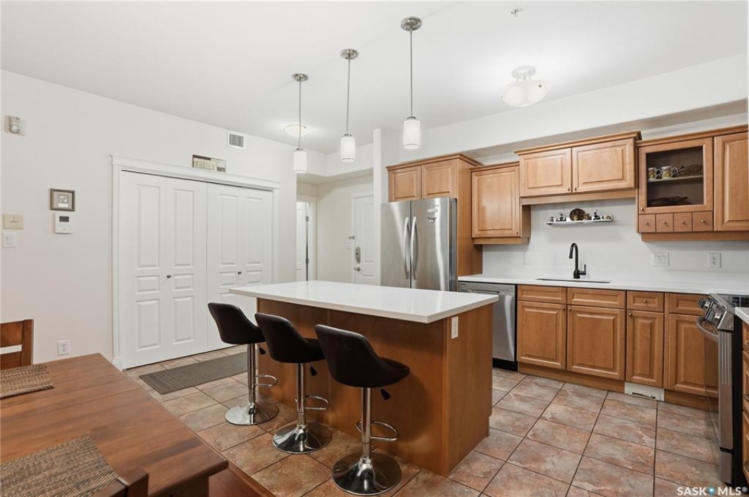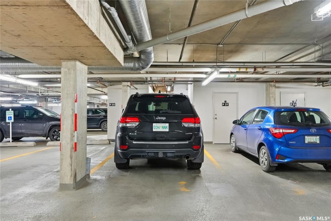 Welcome to The Landing and this well cared for, professionally managed condo, located on the river bank with a great river view, location for both quiet living and easy access to down town, shopping and freeways out of the city. The moment you walk in you are greeted by the clean and bright kitchen with white quartz countertops, light maple wood cabinets, stainless steel appliances including fridge, stove, dishwasher and microwave hood fan with direct vent to outside. It also has undercabinet accent lighting, pendant lights over the island with breakfast bar, a couple cabinet display doors and built in wine rack. Behind the kitchen is the dining area with rich hardwood floors that run into the living room and fill the condo with warmth. The off white walls in this living area add brightness and a lovely contrast to the flooring, there is plenty of space for your furniture and huge windows that fill the space with natural and healthy sunlight while giving you a fabulous view of the South Saskatchewan river side below. You can also access the back deck from here where you can relax and enjoy the suns warmth with your favorite bevy and prepare a meal on your barbeque that is connected to the natural gas outlet, and listen to the geese as they float by on the river. Down the hall you will find the spare bedroom with plush carpet across from the 4 piece bathroom. The master bedroom found at the end of the hall is huge, has cozy carpet flooring, a walkin closet and a 3 piece ensuite for your convenience. Across from the kitchen is a double wide coat closet and the laundry/storage room with stacked washer/dryer included. New to this unit is the stove, microwave, garburator, quartz countertops, sink and kitchen faucet. Enjoy the convenience of the heated underground parking and your own storage room, there is new clearcoat surface underground and new pavement outside. Close to the Meewasin Valley trail, Fred Mitchell and Gabriel dumont parks. Call today!