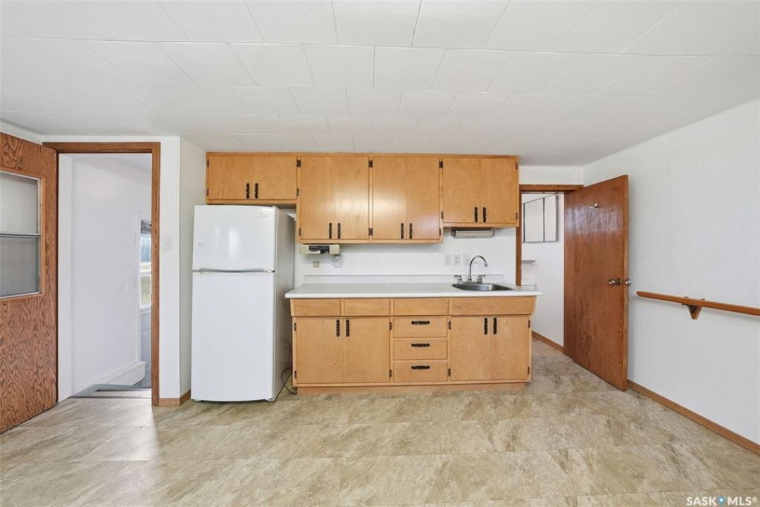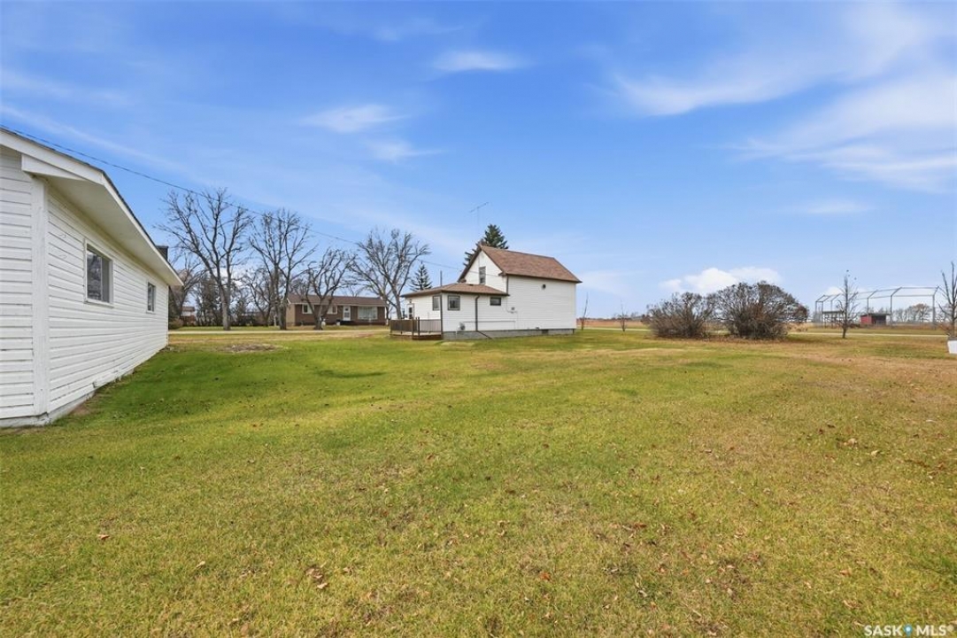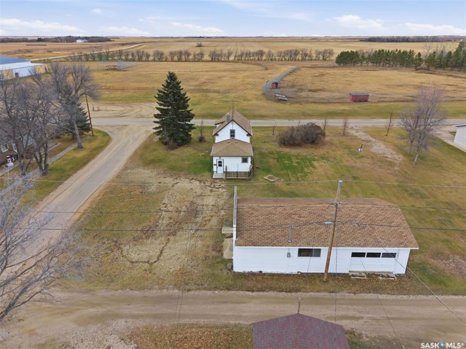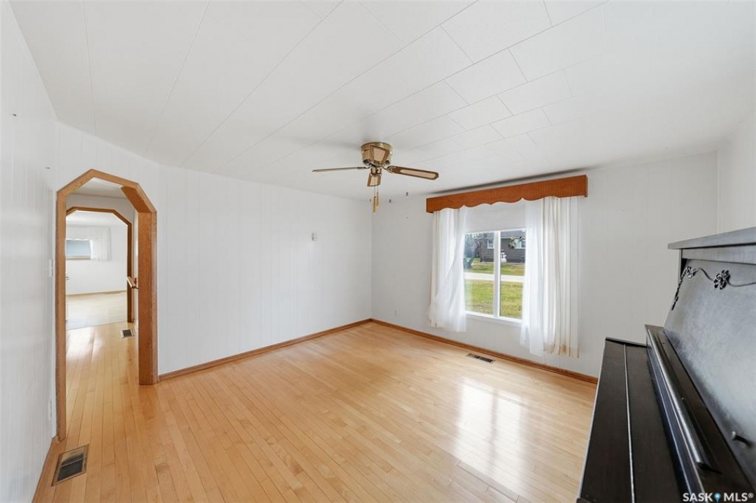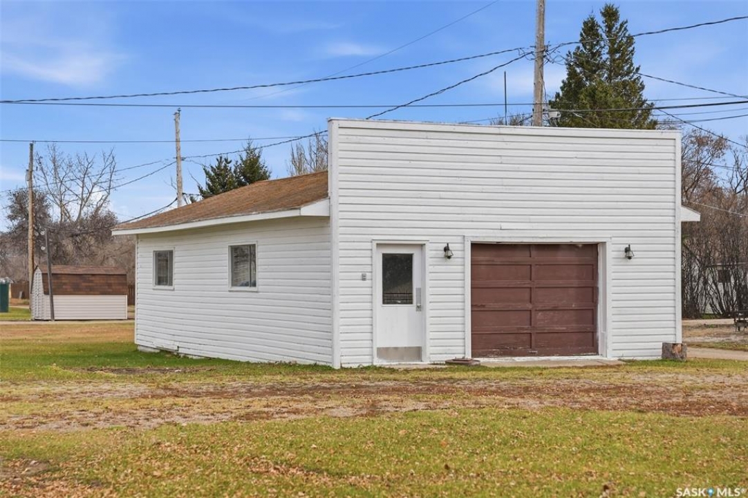 This 1 1/2 story home, situated on a 75x120ft lot, is ideally located near rink/ball diamonds and the downtown area. As you approach, the inviting front veranda sets the stage. Step into the cozy front porch and walk directly into the bright, open kitchen and dining area—an inviting space ideal for everyday living. Just off the kitchen/dining room is a convenient 4-piece bathroom. The main floor features a warm and welcoming layout complete with a comfortable living room highlighted by beautiful maple hardwood floors, as well as a main-level bedroom that offers flexible use as a guest room, office, or additional living space. Upstairs, you'll find three additional bedrooms, providing plenty of room for a growing family, hobbies, or storage. The basement includes a storage area and additional laundry hookups, as well as housing the furnace and water heater. Outside, there is a massive 22'-0" by 44'-0" garage that would be perfect for your projects, toy storage or even a home business. This home combines classic charm with some modern updates, making it ideal for families or as an investment property.