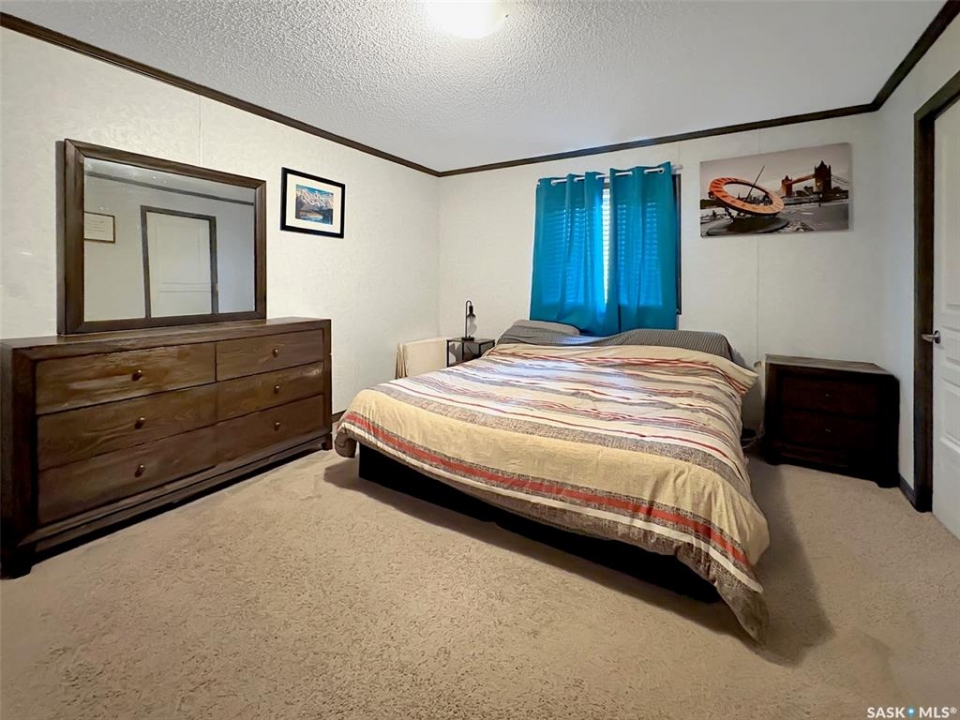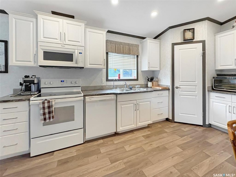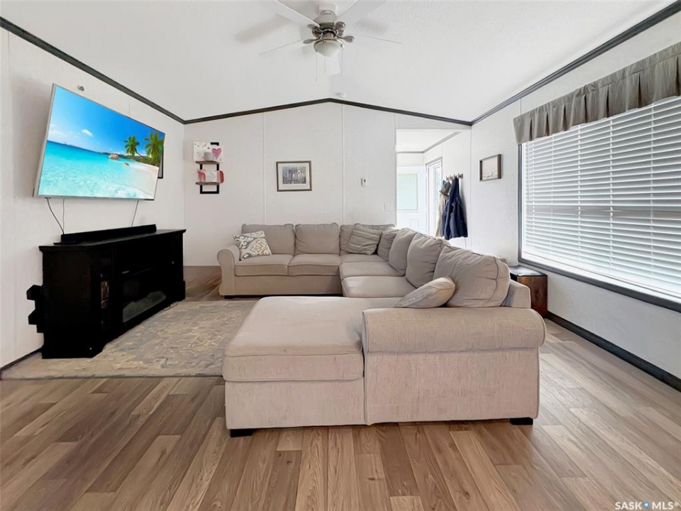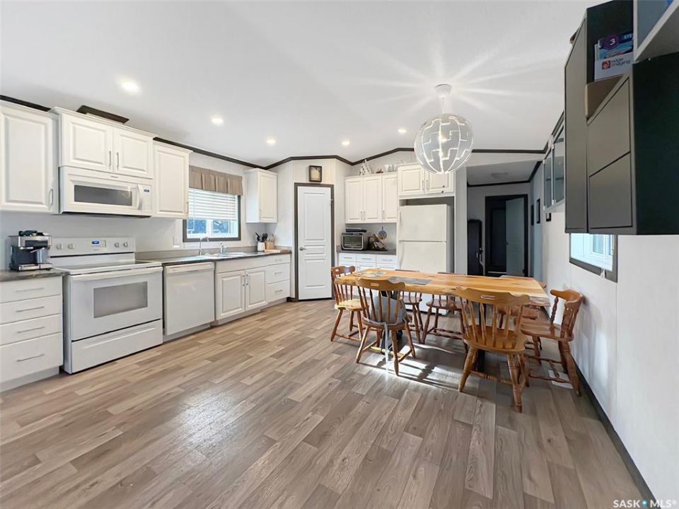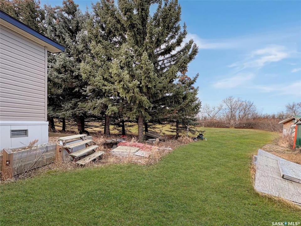 Discover the serene charm of Neville, SK, a peaceful community that offers a tranquil atmosphere, close to Swift Current and a mere 20-minute drive to the picturesque Lac Pelletier Lake, a premier destination for summer recreation. This expansive property, encompassing three town lots, features a mature shelter belt that ensures privacy, a delightful play structure for children, and ample parking space, providing the perfect setting for relaxation and outdoor activities. The residence includes a modern 2019 mobile home, showcasing insulated skirting and durable vinyl siding. It is equipped with a forced air propane furnace, which can be converted to natural gas, and has been prepped for the installation of a central air conditioning unit for added comfort. The thoughtfully designed layout is ideal for family living, featuring an open-concept kitchen, dining, and living area that promotes a sense of togetherness. In the airy kitchen, you will find elegant white cabinetry, contemporary countertops, a dishwasher, and sufficient space for a large dining table, making it perfect for entertaining. One side of the home accommodates two generously sized bedrooms and a four-piece bathroom. On the opposite side, find your laundry room/utility room with access to the exterior. Here you will also find the spacious master bedroom measuring 12.2 x 14.7 feet including a three-piece ensuite and a walk-in closet, offering a private retreat. Throughout the home, durable vinyl flooring and a modern colour palette create a cohesive aesthetic, complemented by numerous windows that flood the spaces with natural light, enhancing the airy ambiance. This property is an exceptional opportunity for those seeking a blend of comfort, space, and community in a desirable location. Call today for more information or to book your personal viewing!