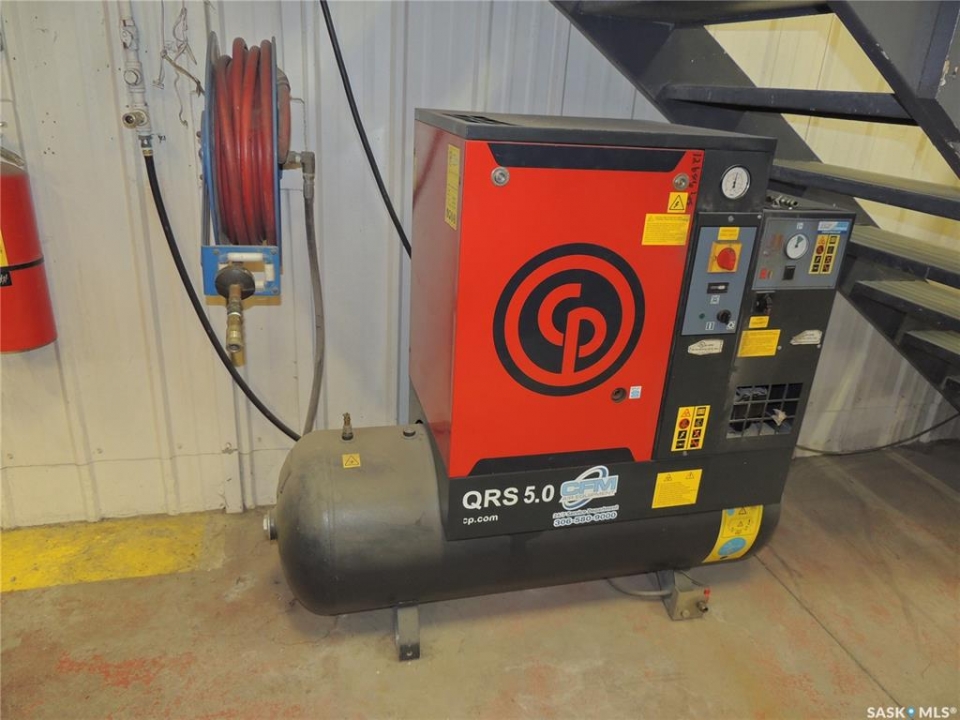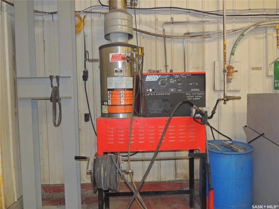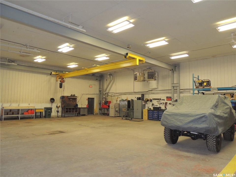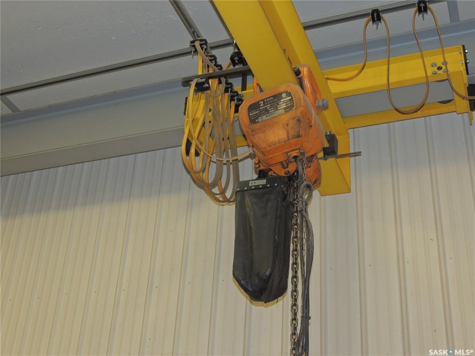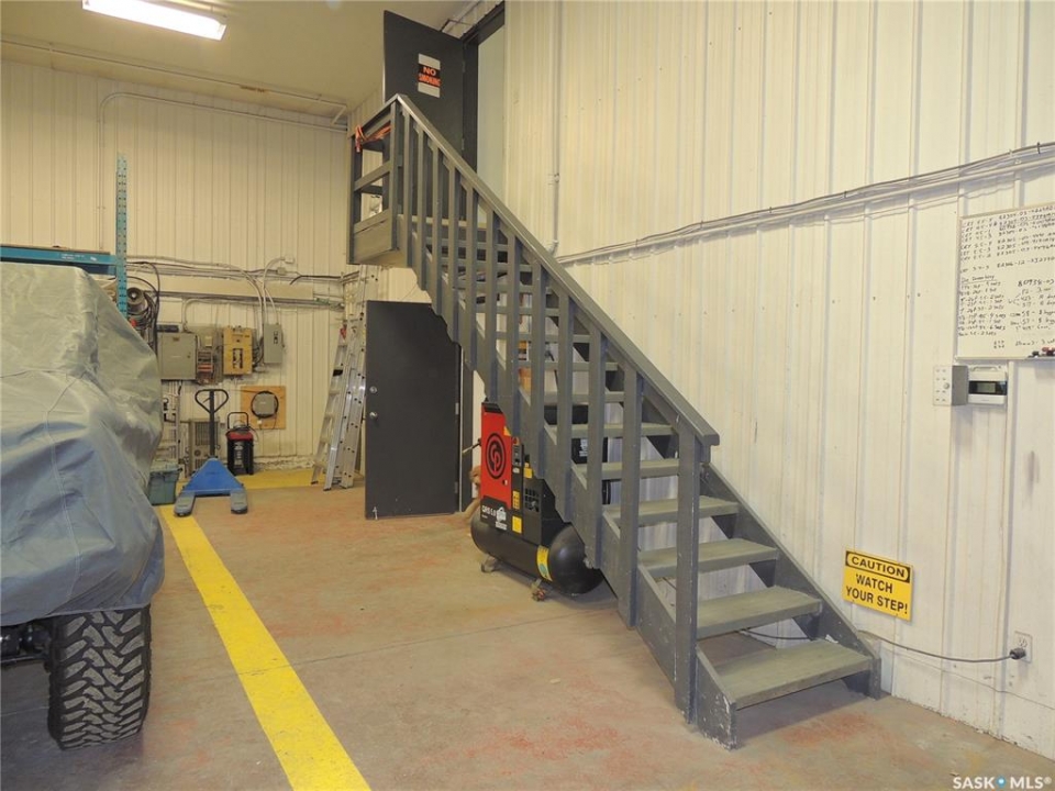 This 4040 sq ft shop is located in soo industrial subdivision. The lot size is 1.51 acres. There is an additional 1000 sq ft mezzanine on the second floor. The main floor has a front porch, reception area, 2 offices, board room and a half bathroom. There is also a back office and half bathroom on the shop side. The second floor has a board room, laundry room and 1 office. The shop has 3 doors. There is a 2 ton crane installed in 2017. There is also a natural gas hotsy pressure washer and a compressor. The yard has a tarped 2500 sq ft building with wood matting floor. There is an additional 14x24 garage with 3 pause power in the shed behind.