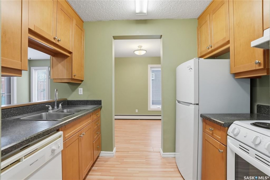 Welcome to unit 304 in the Chateau on 4th Avenue, centrally located in the mature City Park neighbourhood. Located in close proximity to the City Hospital, downtown, U of S, Starbucks, public transport, the scenic river valley and Meewasin Trail. This 2 bedroom 1 bath unit features a unique layout with a well appointed west facing balcony for some evening sun or entertaining guests. Perfect for a first time buyer or revenue property for university students. Includes many upgrades including newer maple cabinetry in the kitchen and bathroom, upgraded windows and exterior patio door, laminate flooring throughout. Includes 1 covered electrified parking stall. Don't miss out! This unit shows excellent!