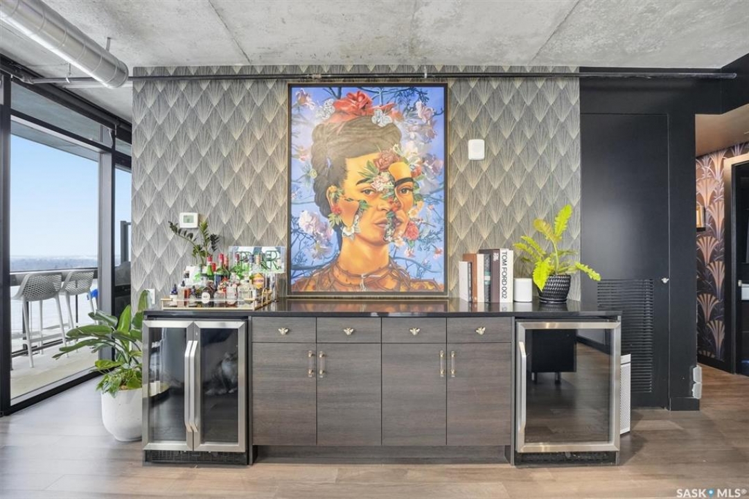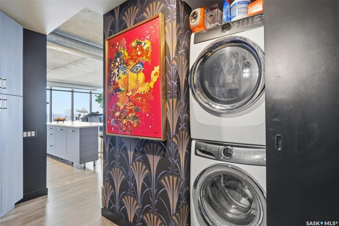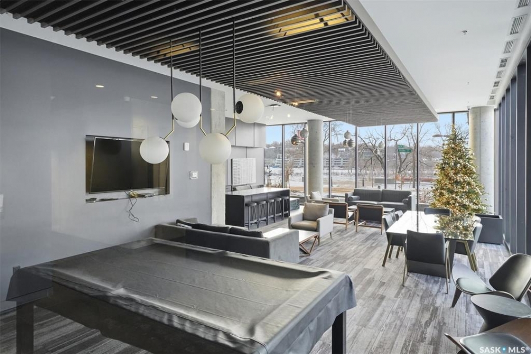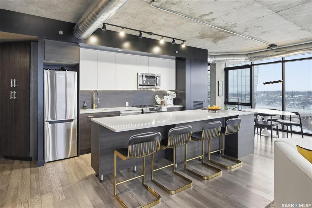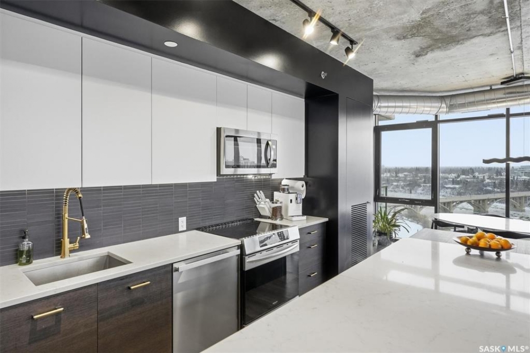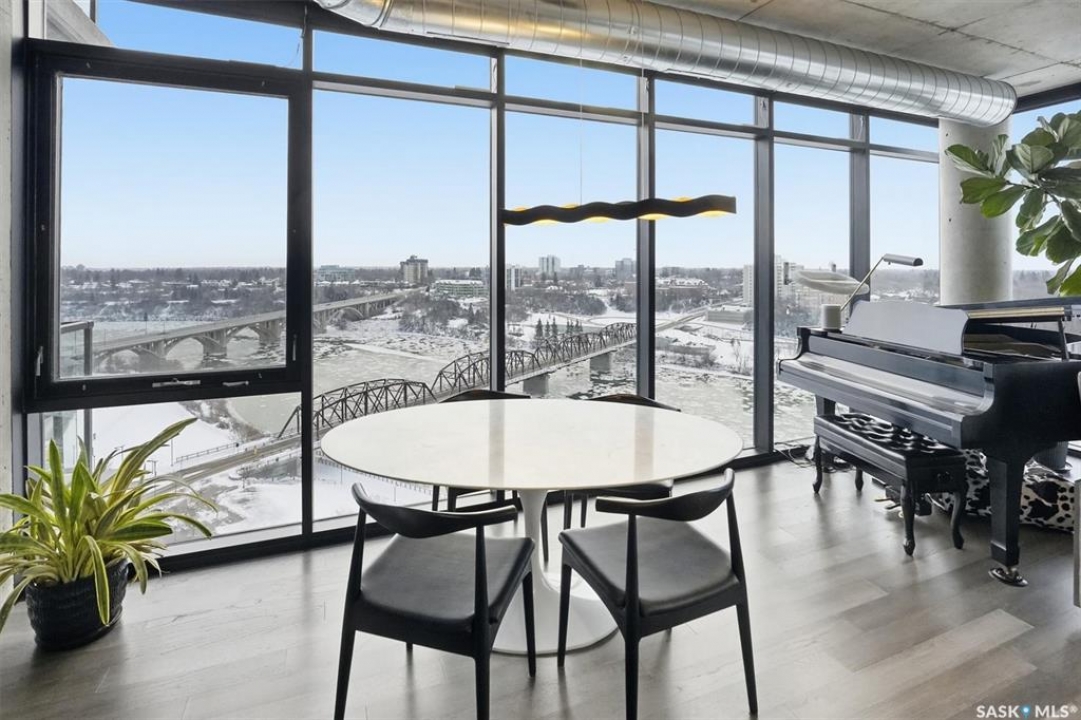 This 15th floor condo has one of the most prime panoramic views in the City. The 9' high floor to ceiling windows wrap around the entire east and south sides of the unit providing breath taking views of the ever changing river view. Two balconies, one off of the master bedroom facing east and another off of the living room facing south. Master ensuite has a large walk-in closet and walk-in shower. Over $80,000 in recent improvements including automatic blinds connected to app. Additional storage in kitchen and dining room custom built with matching cabinetry and 2 small fridges. Overhead light fixtures have been added in key areas. All stainless steel appliances in kitchen, quartz countertops, and a large island with overhang for sitting. Central air, engineered hardwood flooring throughout. Well equipped gym and lounge with pool table on main floor. Titled underground parking stall.