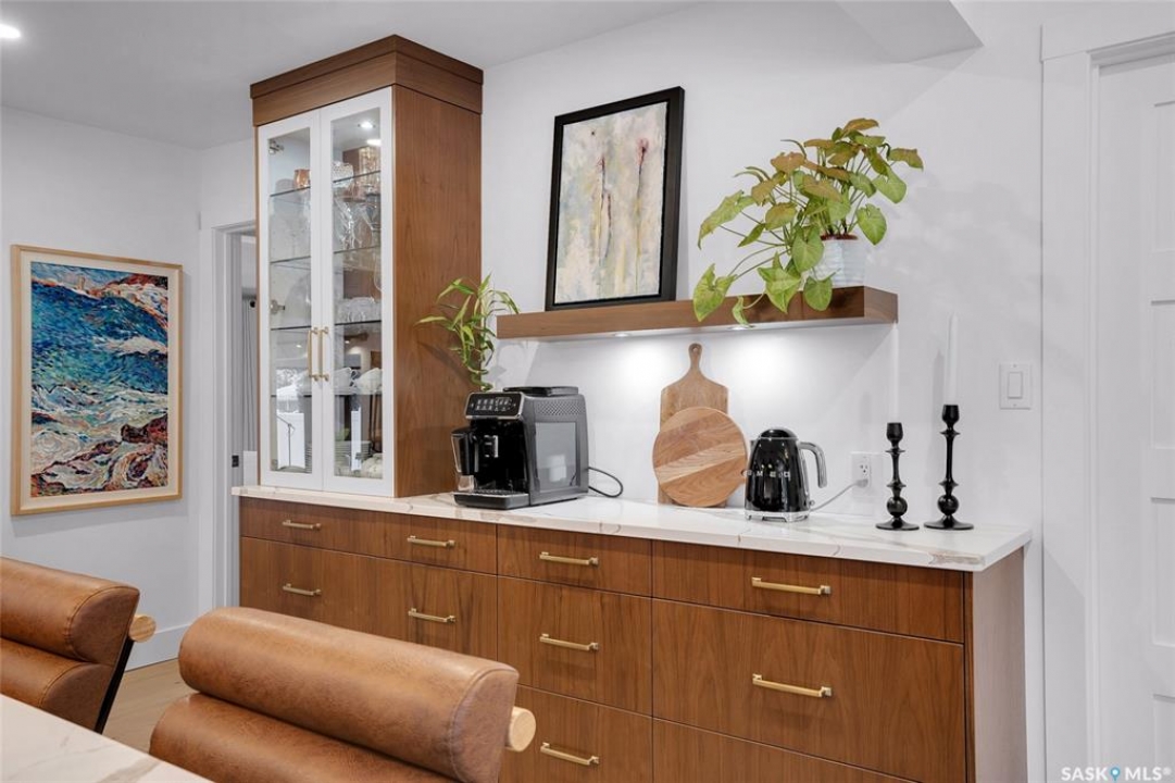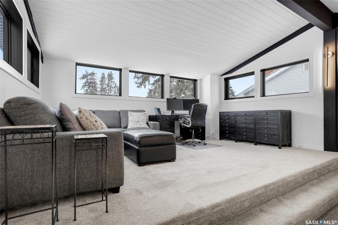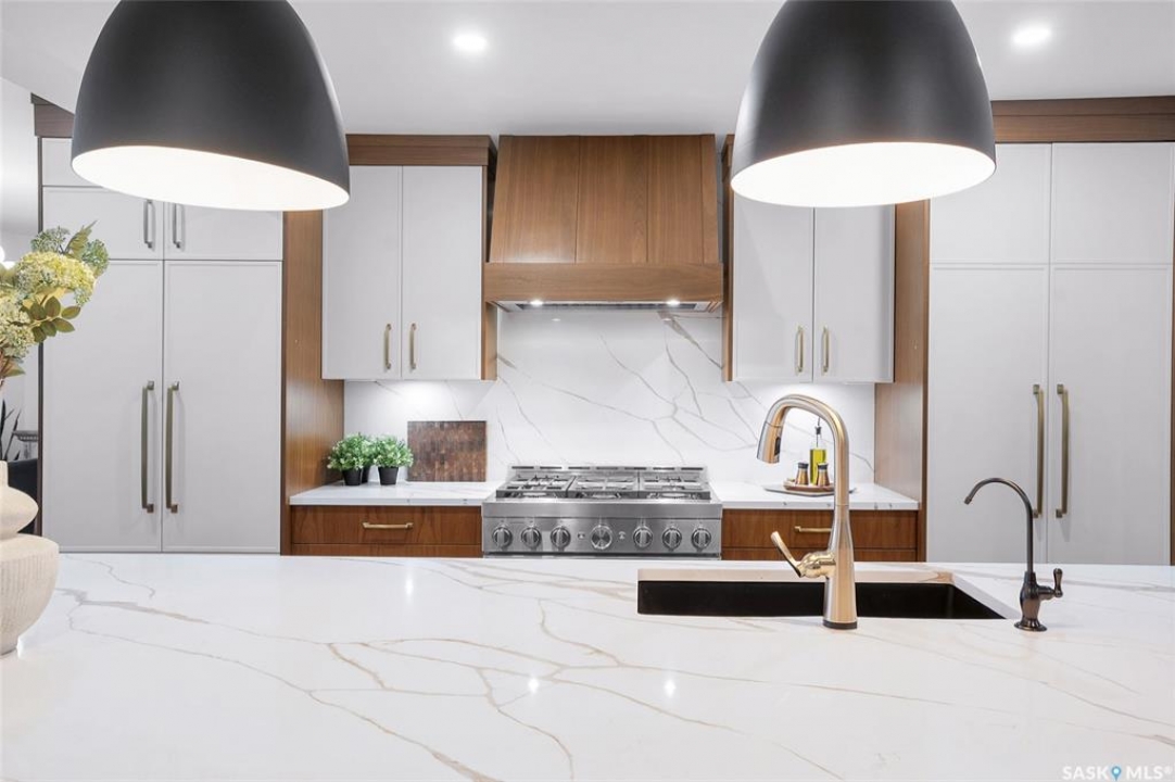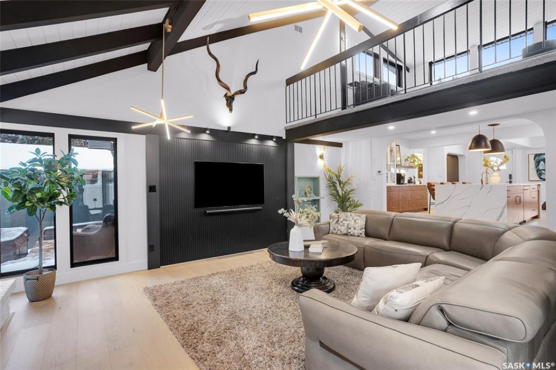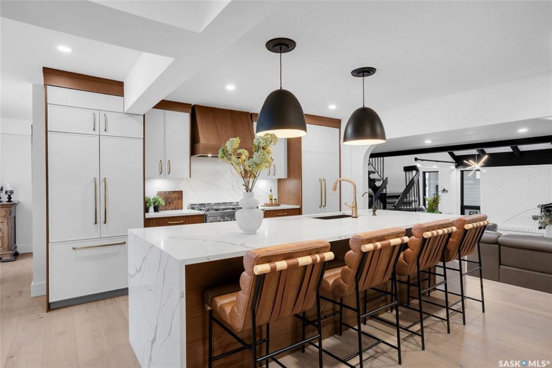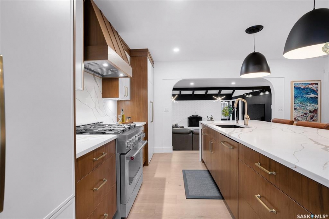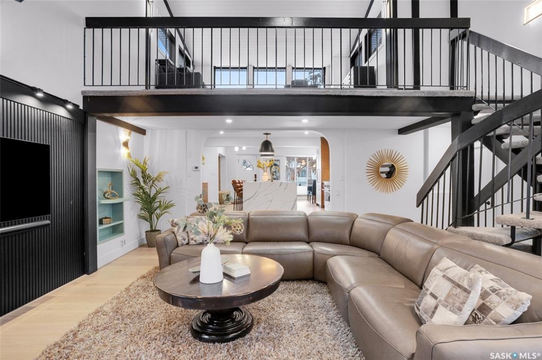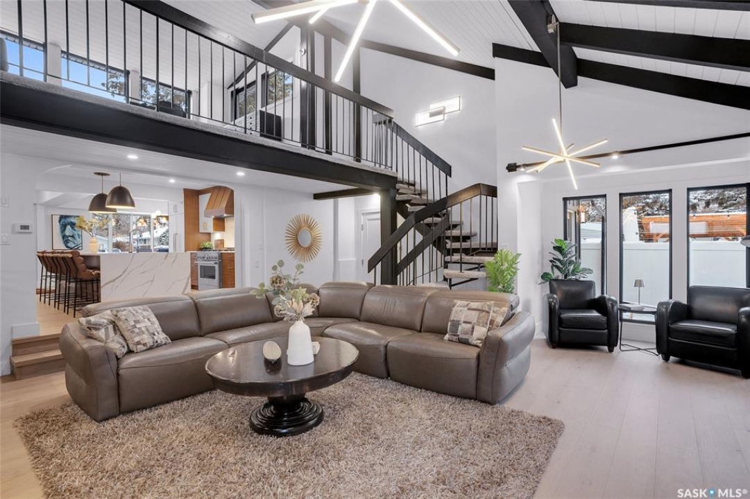 Once a whimsical 1953 Varsity View bungalow with a 1981 loft, this home is now a fully reimagined executive contemporary retreat designed for a very specific buyer. Every inch has been transformed into a sophisticated residence where craftsmanship, comfort, and luxury converge—With one executive primary bedroom on the main -ideal for empty nesters, professionals without young children, or investors seeking strong rental income in the sought after University Area. At its core is the stunning AYA kitchen featuring Cream and Manhattan Rye Walnut cabinetry, quartz surfaces, integrated lighting, LED floating shelf, custom coffee bar and hidden Butler's pantry. Warm walnut and soft creams create a timeless palette. The spacious entry flows into a dining room with floor-to-ceiling bay window. Engineered hardwood spans the main floor, with heated tile in the ensuite and basement bath. The family room impresses with vaulted ceilings, brick wood-burning fireplace and open-tread staircase leading to an open-air loft overlooking the space below. The sole above-grade primary bedroom on the main floor, offers a spa-inspired 6-piece ensuite with dual tiled showers, double sinks, soaker tub, in-floor heat and access to a private deck. A custom walk-in closet integrates laundry and office space. The fully developed basement includes a brand-new 2-bedroom legal suite plus a separate third bedroom—ideal for rental income, guests, or extended family. Exterior upgrades include concrete driveway, LP composite siding, patio, artificial turf, walkways, shed, fencing and a secluded deck. Mechanical updates include furnace, water heater, plumbing, electrical and windows in the basement and rear elevation. Set on a 54' x 140' lot, the property also features a vaulted, heated and insulated 28' x 31', 100 Amp, triple garage with forced-air heat and in-floor piping.