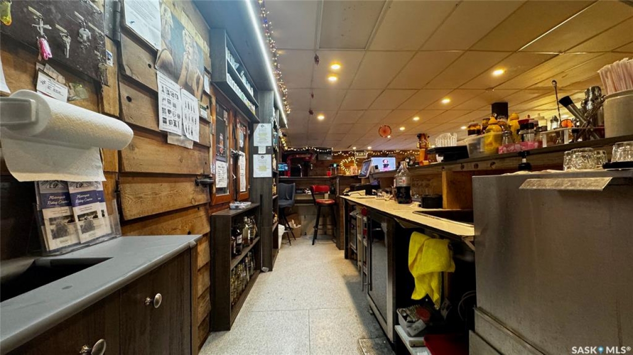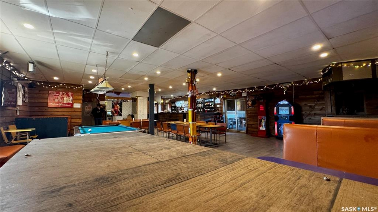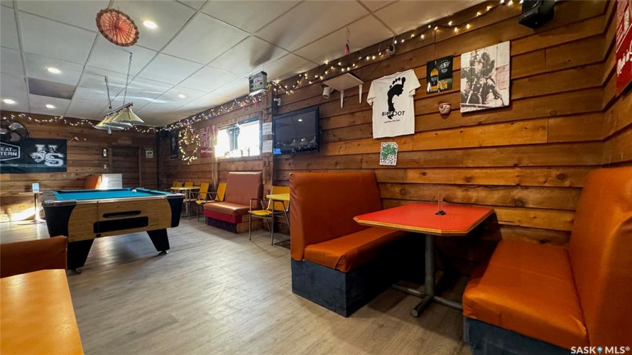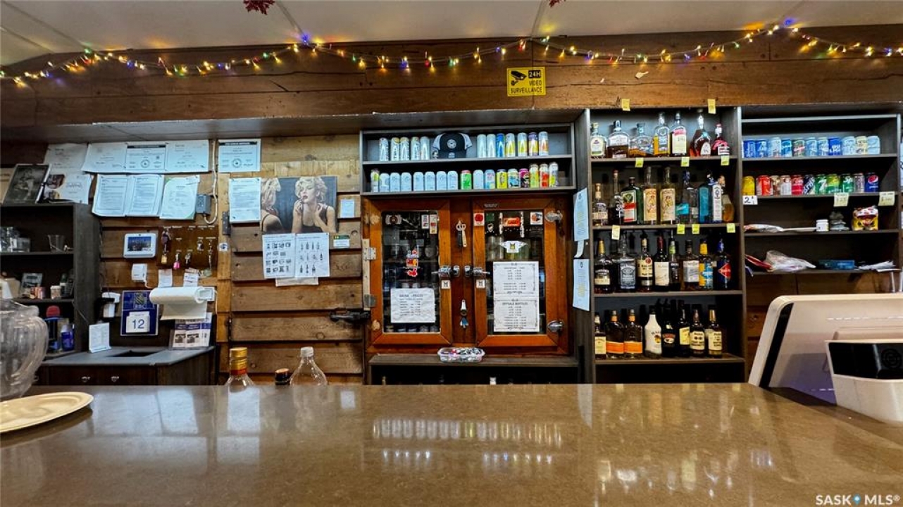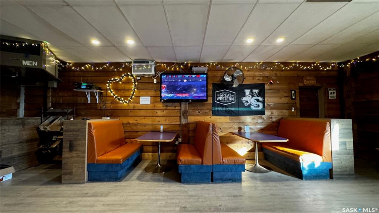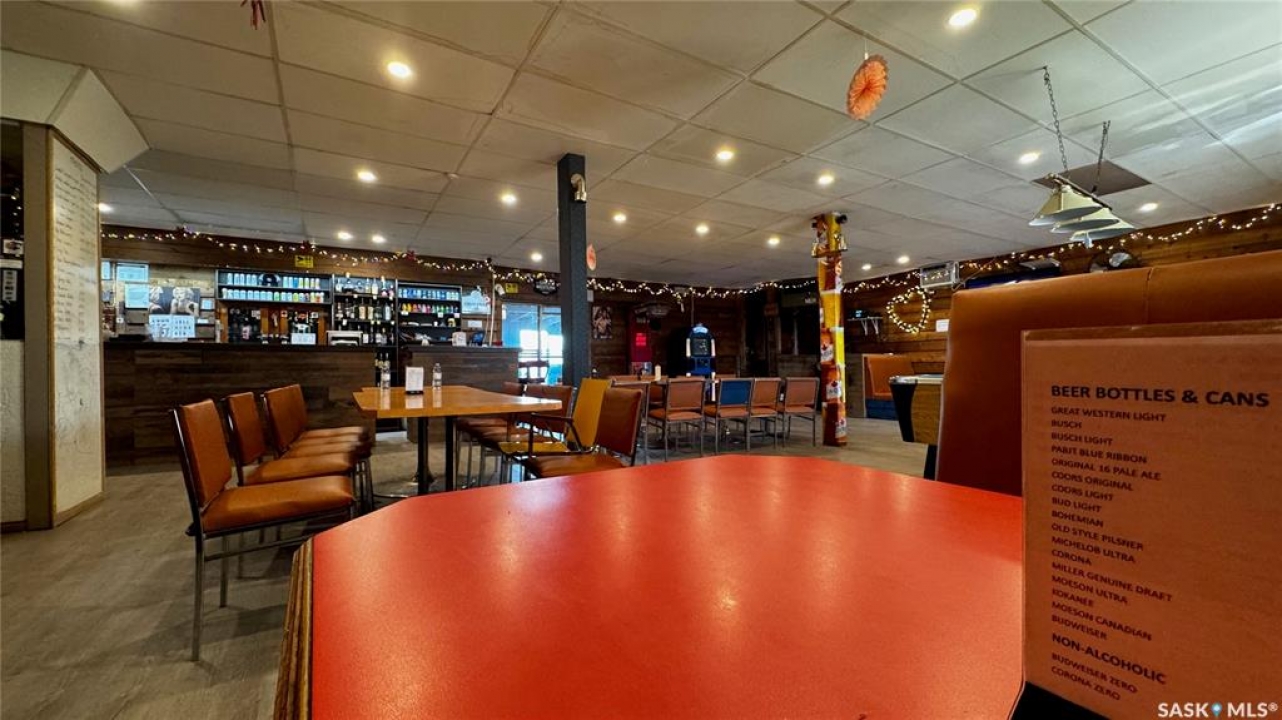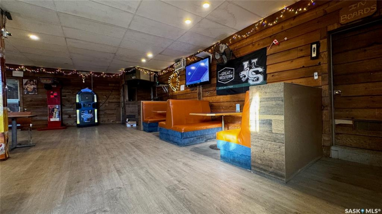 Just 45 minutes from Saskatoon, this exceptional 6000 sq ft, two-storey commercial property in the Town of Hanley offers a rare opportunity to acquire the building, land and a fully operational restaurant-bar business with diverse revenue streams and strong community roots. The main floor features the only Canadian-style restaurant bar in Hanley, equipped with a restaurant liquor permit (minors allowed 11 a.m.–10 p.m.), off-sale liquor permit, tobacco permit, 6 VLTs, 1 ATM, pool table, kickboxing machine, and jukebox, with seating capacity for 100 guests plus an inviting covered outdoor patio. A spacious 18' × 12' walk-in cooler, fully outfitted commercial kitchen, and a 20' × 24' single attached rear garage add to operational efficiency for the owner or manager. The second floor provides extensive accommodation, including one guest suite with kitchen and private bath, five guest rooms with individual sinks, two shared bathrooms with shower stalls, and a storage room. The opposite side of the upper level features an owner's suite, an office, and a versatile flex room suitable as an additional office, guest room, or manager's room. The building is heated by a natural-gas floor-model furnace with forced air and cooled by wall A/C units in select areas. Hanley draws steady traffic with amenities such as a hockey rink, golf course, nearby horse racing, and a regional high school, while the business benefits from loyal patrons, including local residents, sports fans, and families from provincial football and youth hockey leagues. The current owner actively supports local sports and is willing to stay for training, making this a smooth transition for the next operator of this thriving multifaceted establishment.