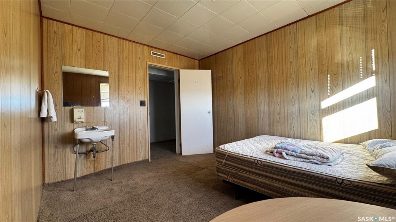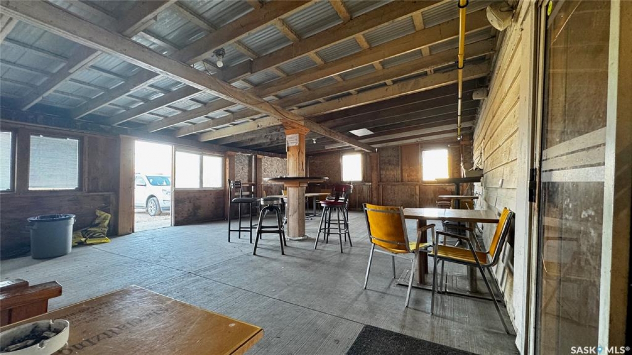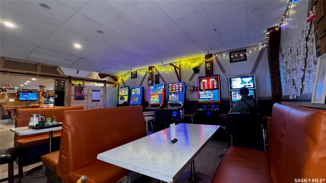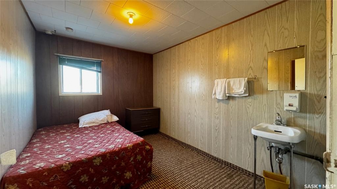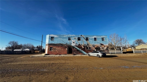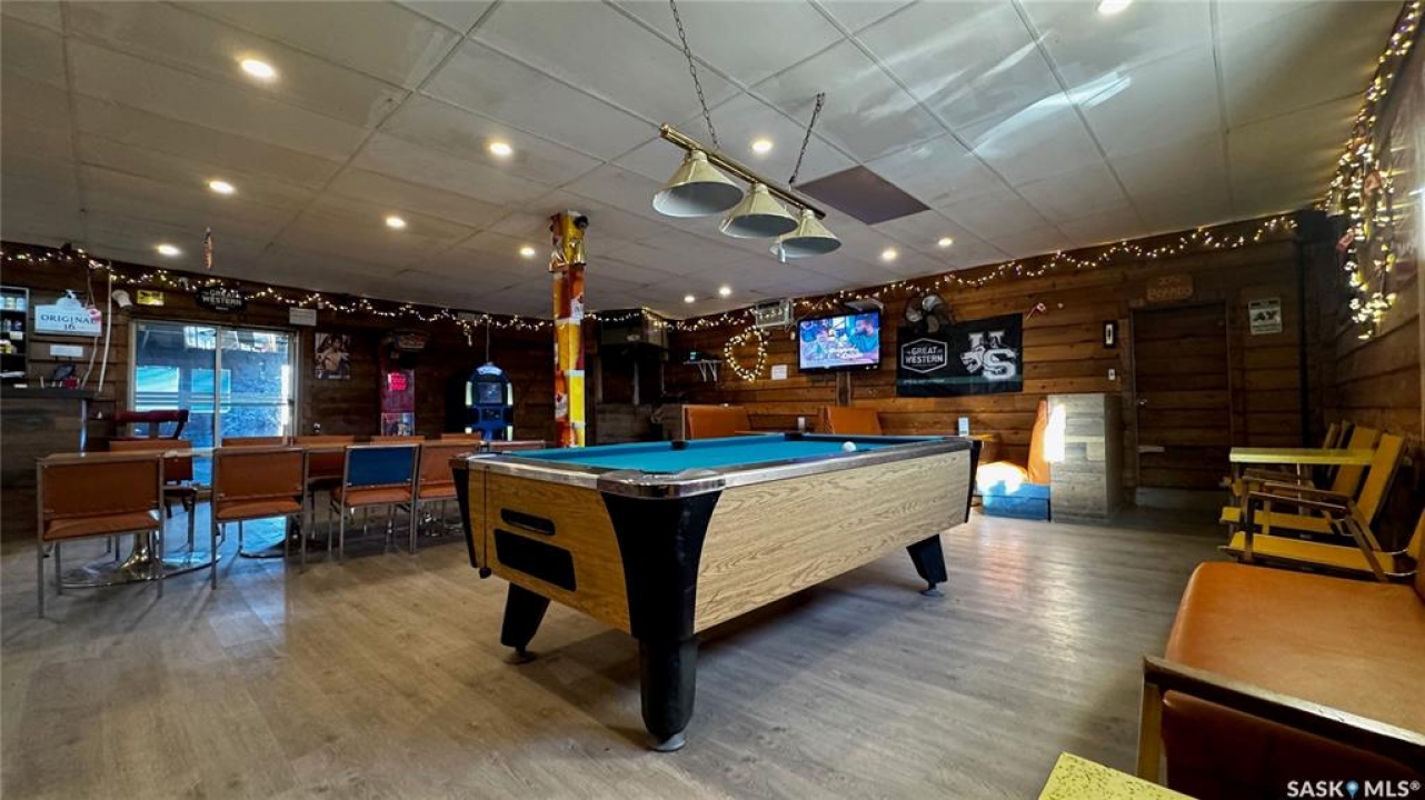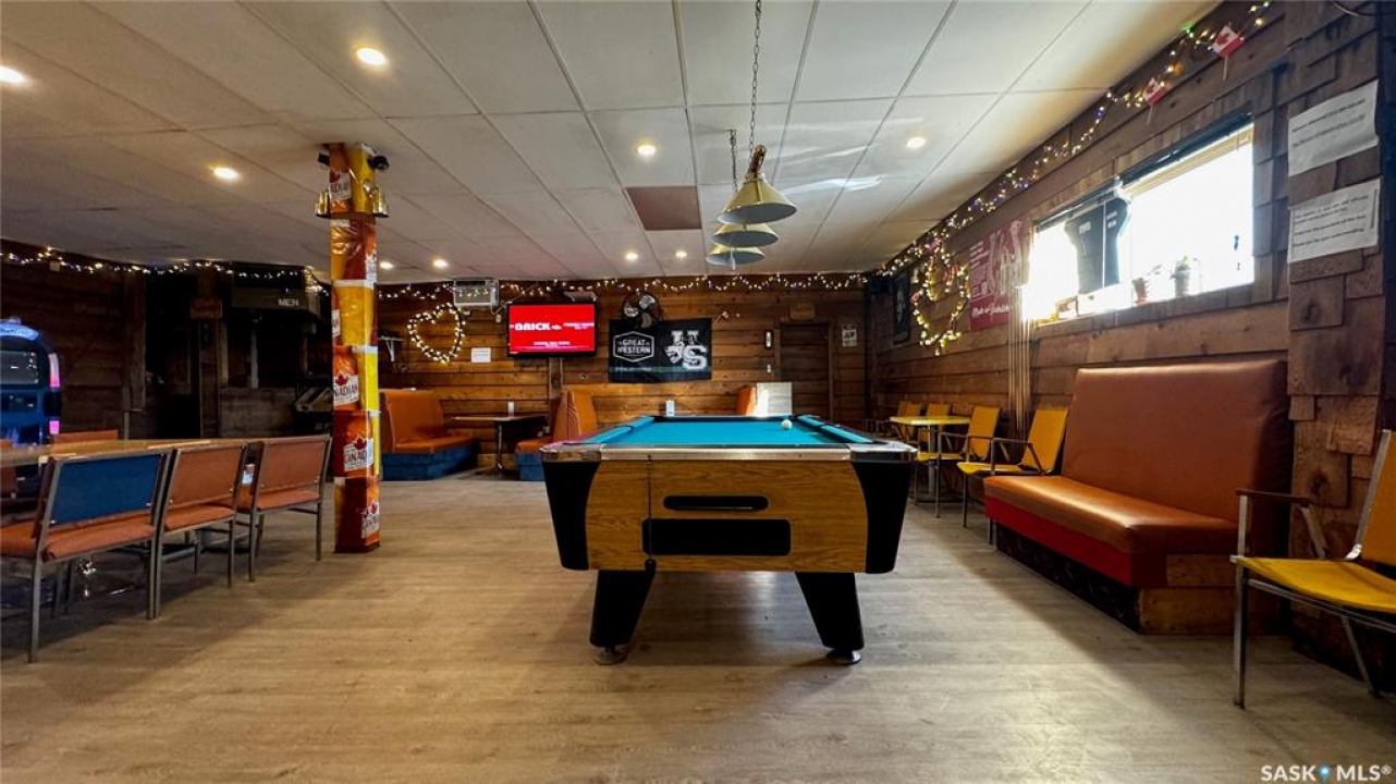 Just 45 minutes from Saskatoon, this exceptional 6000 sq ft, two-storey commercial property in the Town of Hanley offers a rare opportunity to acquire the building, land and a fully operational restaurant-bar business with diverse revenue streams and strong community roots. The main floor features the only Canadian-style restaurant bar in Hanley, equipped with a restaurant liquor permit (minors allowed 11 a.m.–10 p.m.), off-sale liquor permit, tobacco permit, 6 VLTs, 1 ATM, pool table, kickboxing machine, and jukebox, with seating capacity for 100 guests plus an inviting covered outdoor patio. A spacious 18' × 12' walk-in cooler, fully outfitted commercial kitchen, and a 20' × 24' single attached rear garage add to operational efficiency for the owner or manager. The second floor provides extensive accommodation, including one guest suite with kitchen and private bath, five guest rooms with individual sinks, two shared bathrooms with shower stalls, and a storage room. The opposite side of the upper level features an owner's suite, an office, and a versatile flex room suitable as an additional office, guest room, or manager's room. The building is heated by a natural-gas floor-model furnace with forced air and cooled by wall A/C units in select areas. Hanley draws steady traffic with amenities such as a hockey rink, golf course, nearby horse racing, and a regional high school, while the business benefits from loyal patrons, including local residents, sports fans, and families from provincial football and youth hockey leagues. The current owner actively supports local sports and is willing to stay for training, making this a smooth transition for the next operator of this thriving multifaceted establishment.