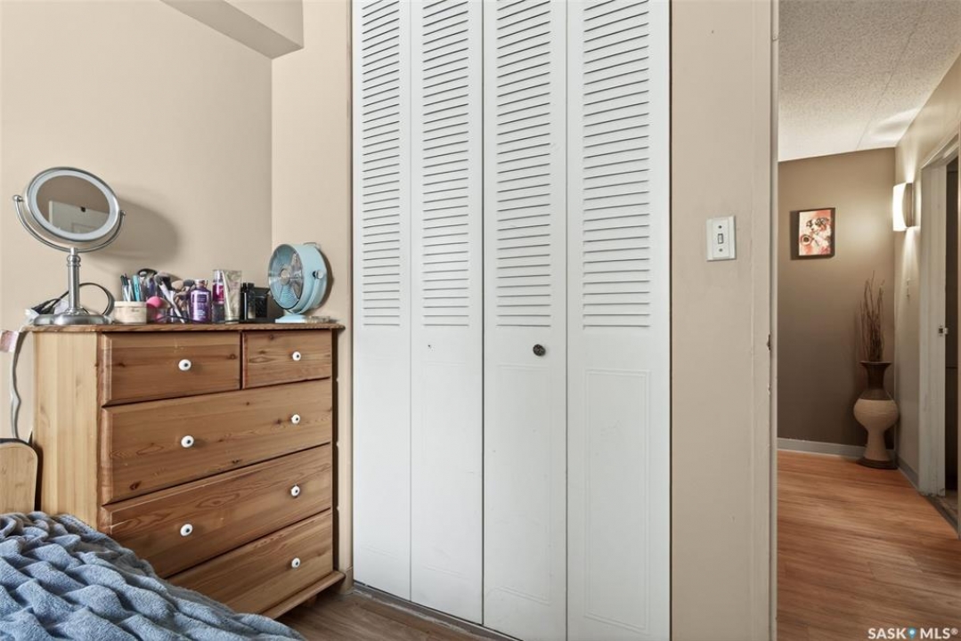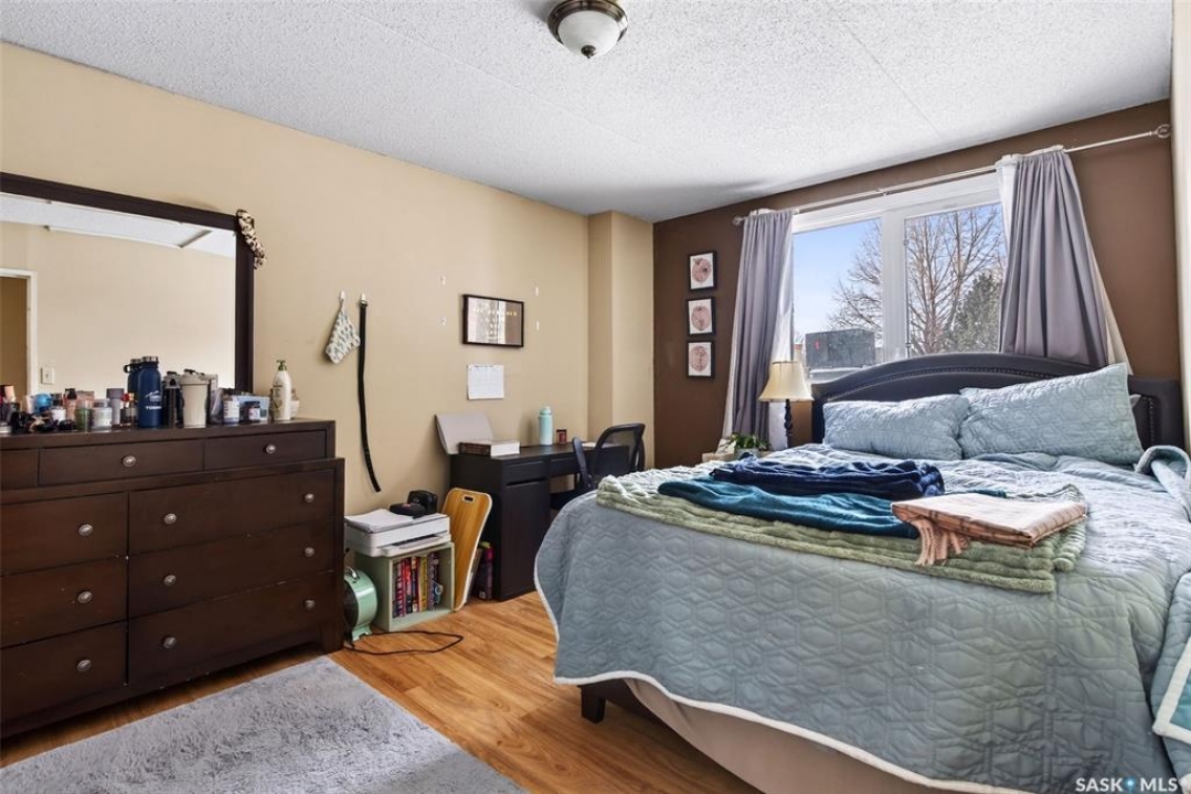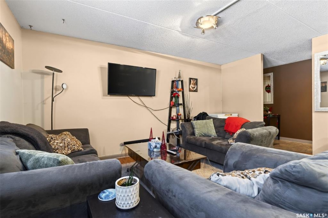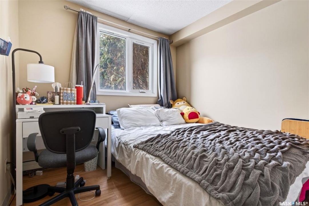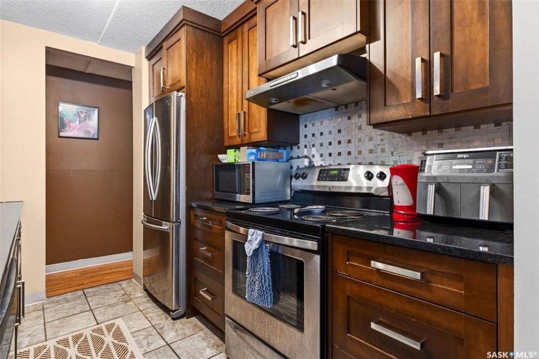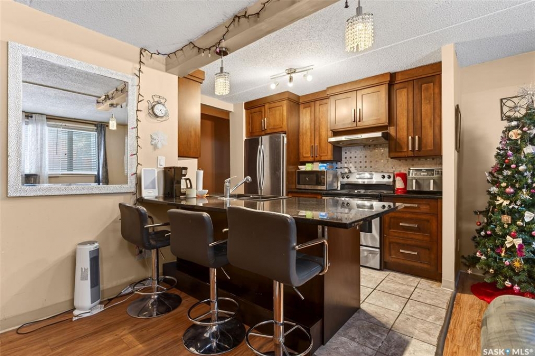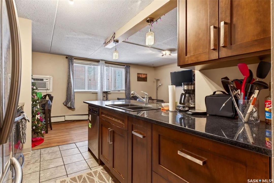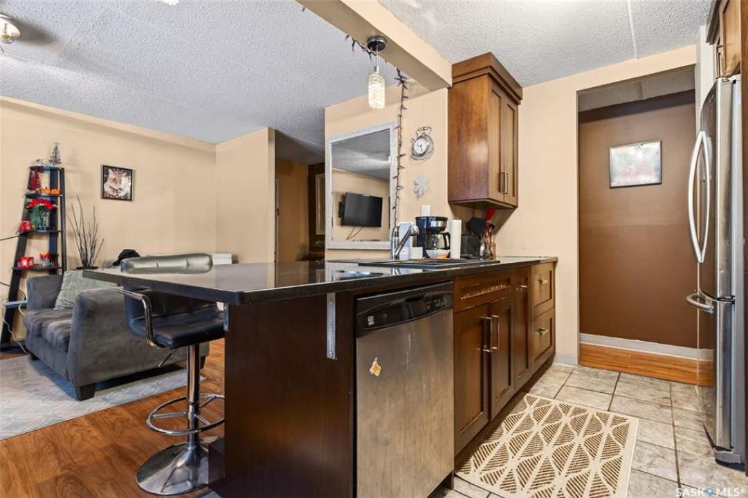 Welcome to this beautifully updated 2 bedroom, 1 bathroom condo located in the highly desirable Hillsdale neighbourhood, just steps from the University of Regina. This unit has seen extensive renovations over the years and offers a modern, open-concept layout that feels both stylish and functional, beginning with an updated entry door and triple-pane windows that enhance both comfort and energy efficiency. The kitchen features granite countertops, stainless steel appliances including a built-in dishwasher, rich brown cabinetry, and a convenient eat-up bar that flows seamlessly into the spacious living room, perfect for relaxing or entertaining. Durable ceramic tile runs through the entry, kitchen, bathroom, and laundry room, while vinyl plank flooring extends throughout the remainder of the unit for a cohesive and low-maintenance finish. Both bedrooms are generously sized, and the updated 4-piece bathroom showcases matching granite countertops and cabinetry that ties beautifully into the kitchen design. In-suite laundry adds everyday convenience and truly sets this condo apart. Whether you're a student, professional, first-time buyer, or investor, the location is hard to beat. Just a stone's throw from the University of Regina, Stone's Throw Café, parks, transit, and all south-end amenities. An excellent opportunity to own rather than rent, or to add a strong rental property to your portfolio.