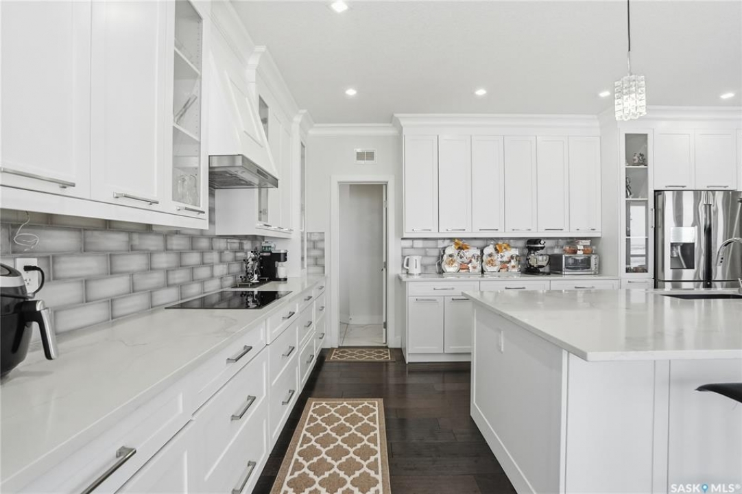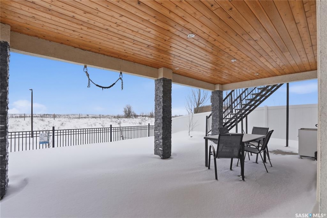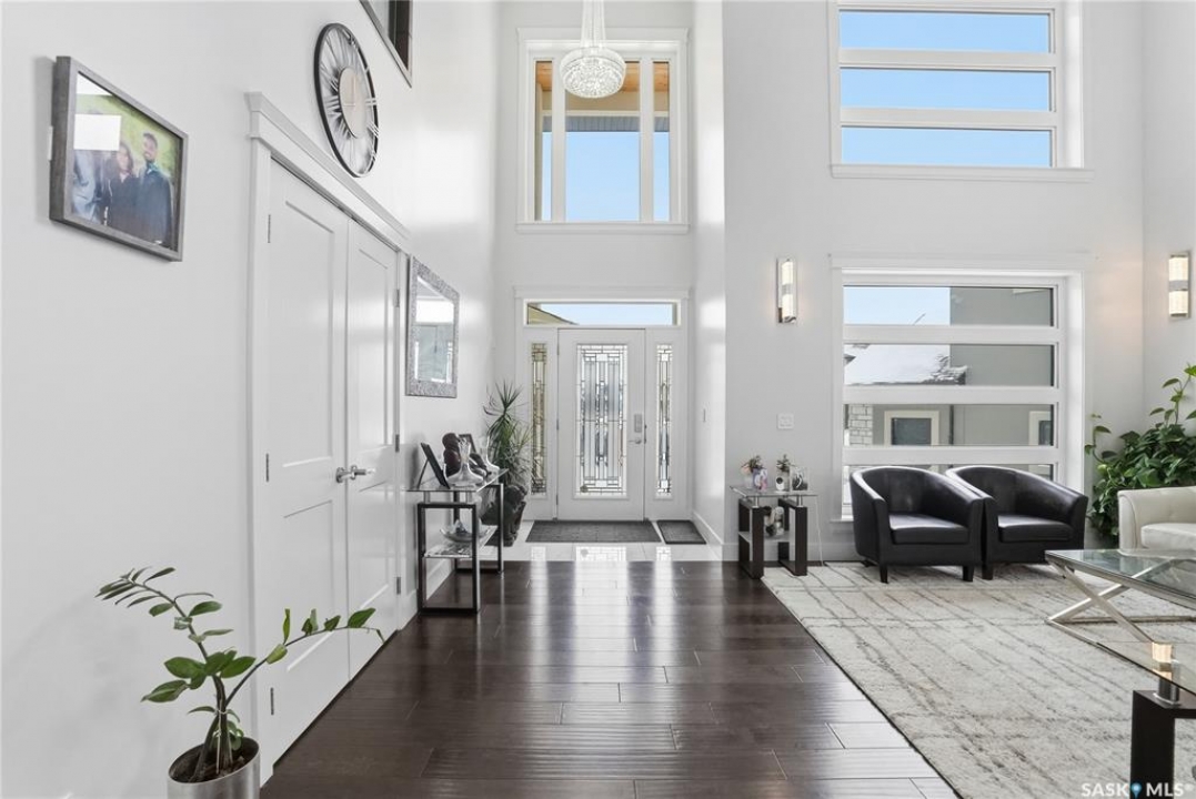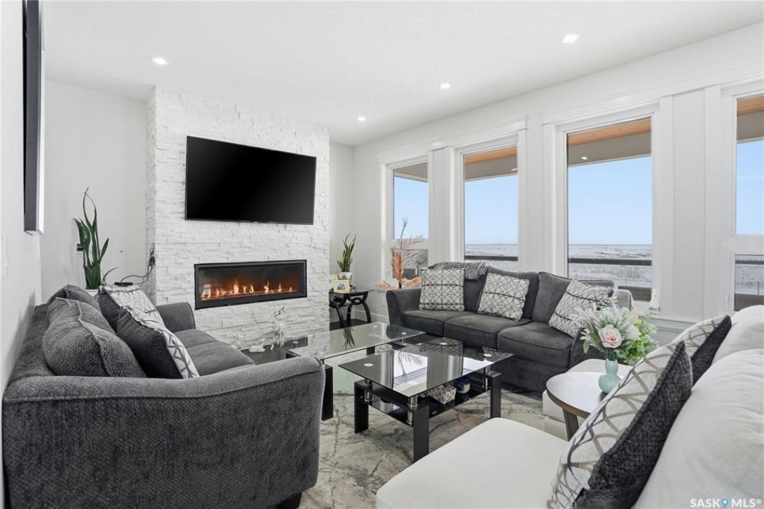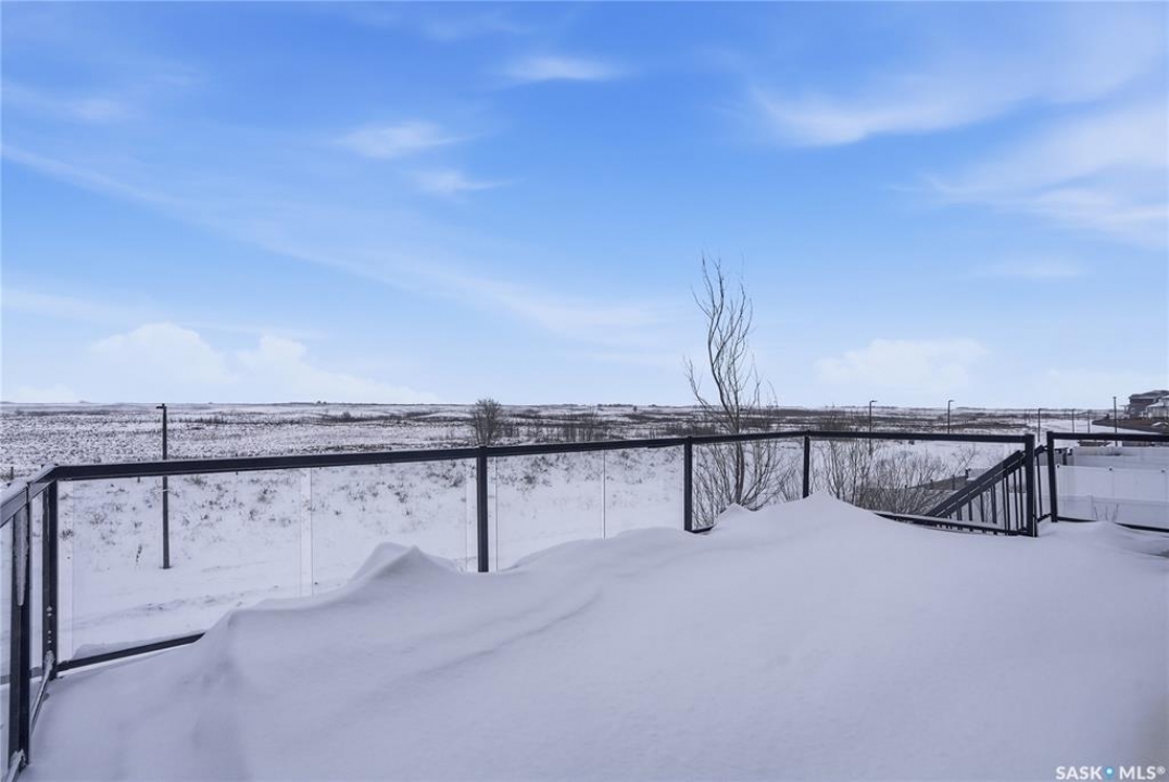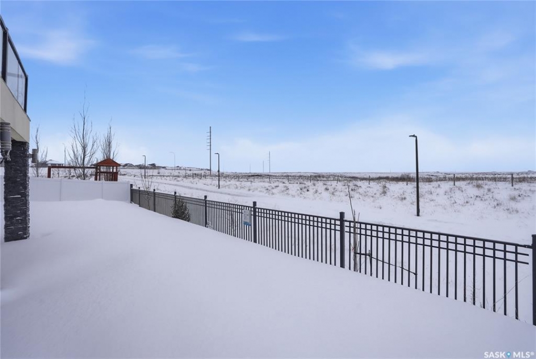 This luxury two-storey walkout home backs the protected Northeast Swale, offering rare, unobstructed prairie views that will never be compromised. Home to native grasslands, rare plant species, and wildlife, the Swale provides a peaceful setting and a natural filter for air and water, creating an exceptional backdrop for refined living. From the moment you enter, a grand open-to-below foyer with soaring ceilings and a stunning chandelier sets the tone for the refined design throughout. The main floor offers expansive, light-filled living spaces, with the living room featuring a Napoleon natural gas fireplace finished with stone as an elegant focal point. The kitchen is designed for everyday living and entertaining, showcasing an extra-large island, quartz countertops, detailed backsplashes, ceiling-height cabinetry, and premium stainless steel appliances. A highly functional butler and spice kitchen includes stainless steel appliances, a sink, ample counter space, and additional storage. A mudroom and laundry room with sink and quartz countertops offers direct garage access, complemented by a convenient 2- piece bathroom. The heated double garage and oversized driveway provide parking for up to six vehicles. The main-floor deck spans the family room and offers approximately 160 square feet of outdoor living space with a natural gas BBQ hookup and uninterrupted Swale views. Upstairs, the primary retreat features a 5-piece ensuite with jacuzzi and a private sunroom, while two additional bedrooms each include 4-piece ensuite bathrooms and large closets. The walkout basement opens to a backyard patio and includes a family room with electric fireplace, games area, wet bar with beverage fridge, a 4-piece bathroom, and two additional bedrooms, one with a 3-piece ensuite and walk-in closet, offering flexibility for guests, extended family, or future home office use. A rare opportunity to own a luxury walkout residence backing a natural reserve.