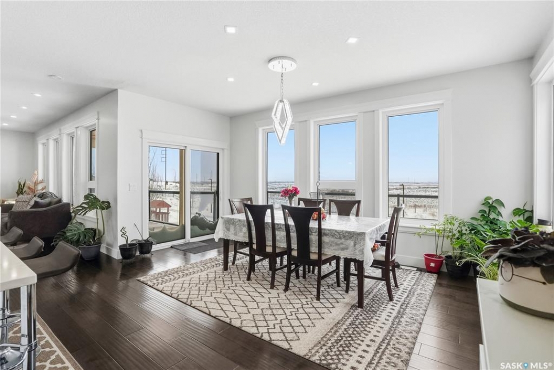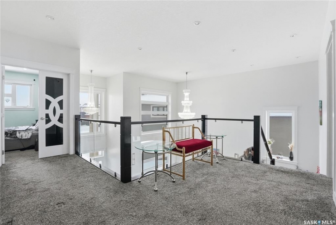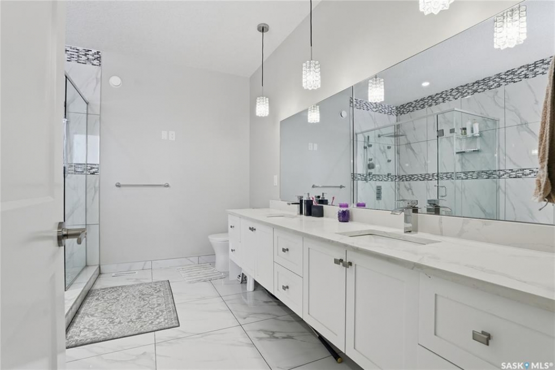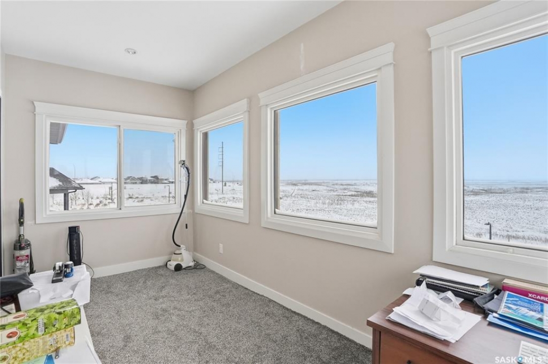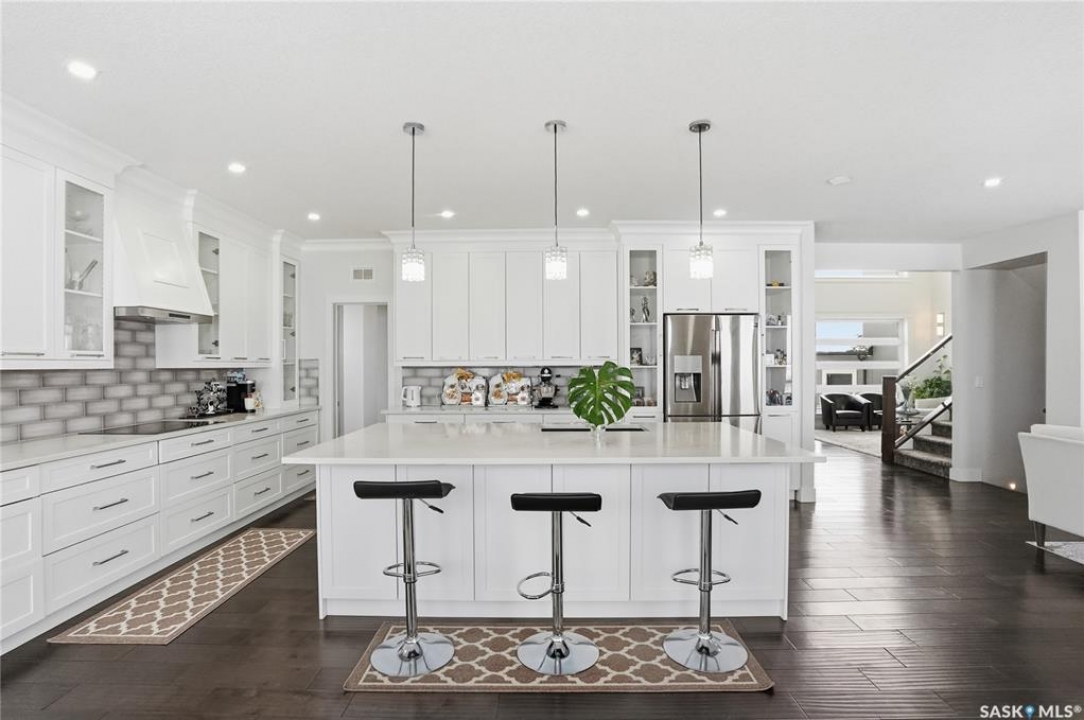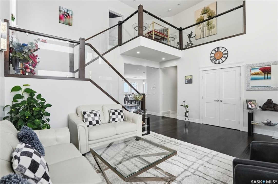 This luxury two-storey walkout home backs the protected Northeast Swale, offering rare, unobstructed prairie views that will never be compromised. Home to native grasslands, rare plant species, and wildlife, the Swale provides a peaceful setting and a natural filter for air and water, creating an exceptional backdrop for refined living. From the moment you enter, a grand open-to-below foyer with soaring ceilings and a stunning chandelier sets the tone for the refined design throughout. The main floor offers expansive, light-filled living spaces, with the living room featuring a Napoleon natural gas fireplace finished with stone as an elegant focal point. The kitchen is designed for everyday living and entertaining, showcasing an extra-large island, quartz countertops, detailed backsplashes, ceiling-height cabinetry, and premium stainless steel appliances. A highly functional butler and spice kitchen includes stainless steel appliances, a sink, ample counter space, and additional storage. A mudroom and laundry room with sink and quartz countertops offers direct garage access, complemented by a convenient 2- piece bathroom. The heated double garage and oversized driveway provide parking for up to six vehicles. The main-floor deck spans the family room and offers approximately 160 square feet of outdoor living space with a natural gas BBQ hookup and uninterrupted Swale views. Upstairs, the primary retreat features a 5-piece ensuite with jacuzzi and a private sunroom, while two additional bedrooms each include 4-piece ensuite bathrooms and large closets. The walkout basement opens to a backyard patio and includes a family room with electric fireplace, games area, wet bar with beverage fridge, a 4-piece bathroom, and two additional bedrooms, one with a 3-piece ensuite and walk-in closet, offering flexibility for guests, extended family, or future home office use. A rare opportunity to own a luxury walkout residence backing a natural reserve.