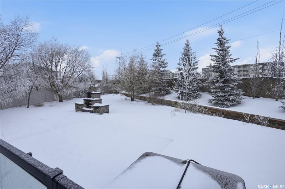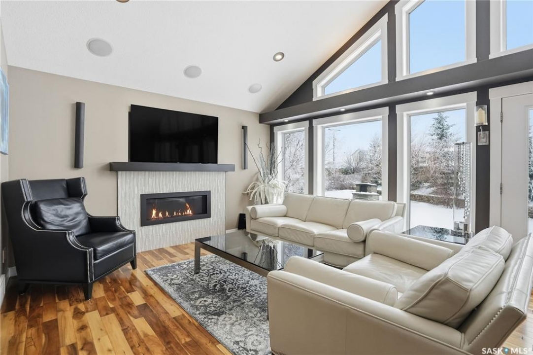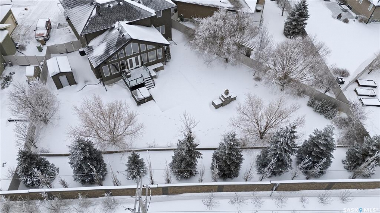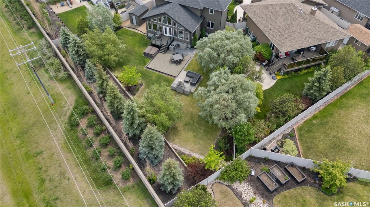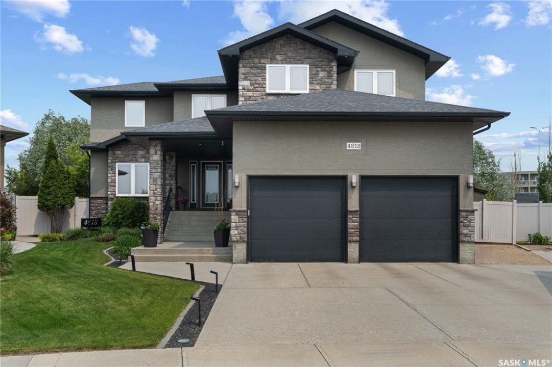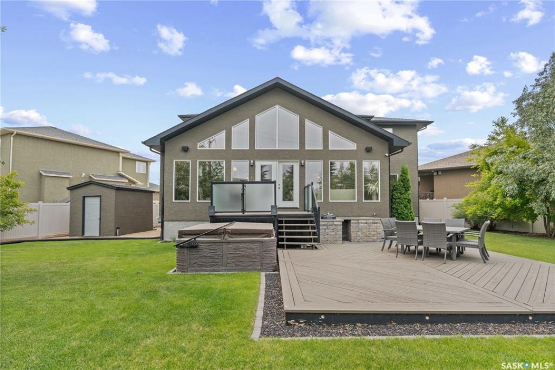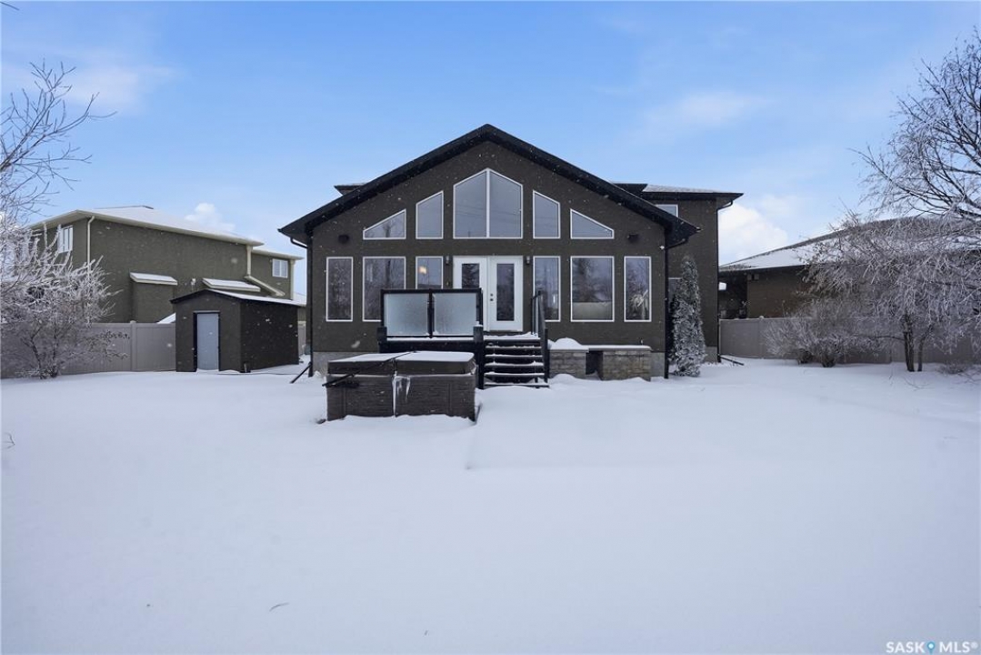 Stunning home in the desirable neighbourhood of the Creeks, proudly voted Best Custom Home under 2,400 sq. ft. by the Regina Home Builders' Association in 2012. Built by Stahmann Homes, this property showcases exceptional craftsmanship and thoughtful attention to detail throughout. The striking stone exterior offers beautiful street appeal, complemented by wide concrete steps leading to a covered front veranda. Inside, you're welcomed by a tiled entryway that opens to a bright and functional main-floor office, perfectly sized at 12' x 12' with two large windows allowing natural light to flow through. The kitchen is designed for both everyday living and entertaining, with sightlines to the living and dining areas and lovely views of the park-like backyard. It features custom stained maple cabinetry, granite countertops, a gas range, stainless steel appliances, and a convenient butler's pantry. Rich tigerwood walnut flooring adds warmth and elegance to the main living space. Spacious living room and dining room combination with soaring vaulted ceilings, built-in speakers and natural gas fireplace. Upstairs, you'll find three bedrooms, including a spacious primary retreat complete with in-ceiling speakers and a spa-inspired ensuite featuring ceramic tile flooring, a 5' tiled walk-in shower, and a jetted tub. The basement is nearly complete and offers a fourth bedroom, recreation room, and a 3-piece bathroom, just waiting for your finishing touches. Step outside and prepare to be impressed by the meticulously maintained backyard, with 27 planted trees, an outdoor kitchen, a wood-burning firepit, and hot tub is perfect for entertaining or relaxing year-round. A powered storage shed and underground sprinklers in both the front and back yards complete this exceptional property.