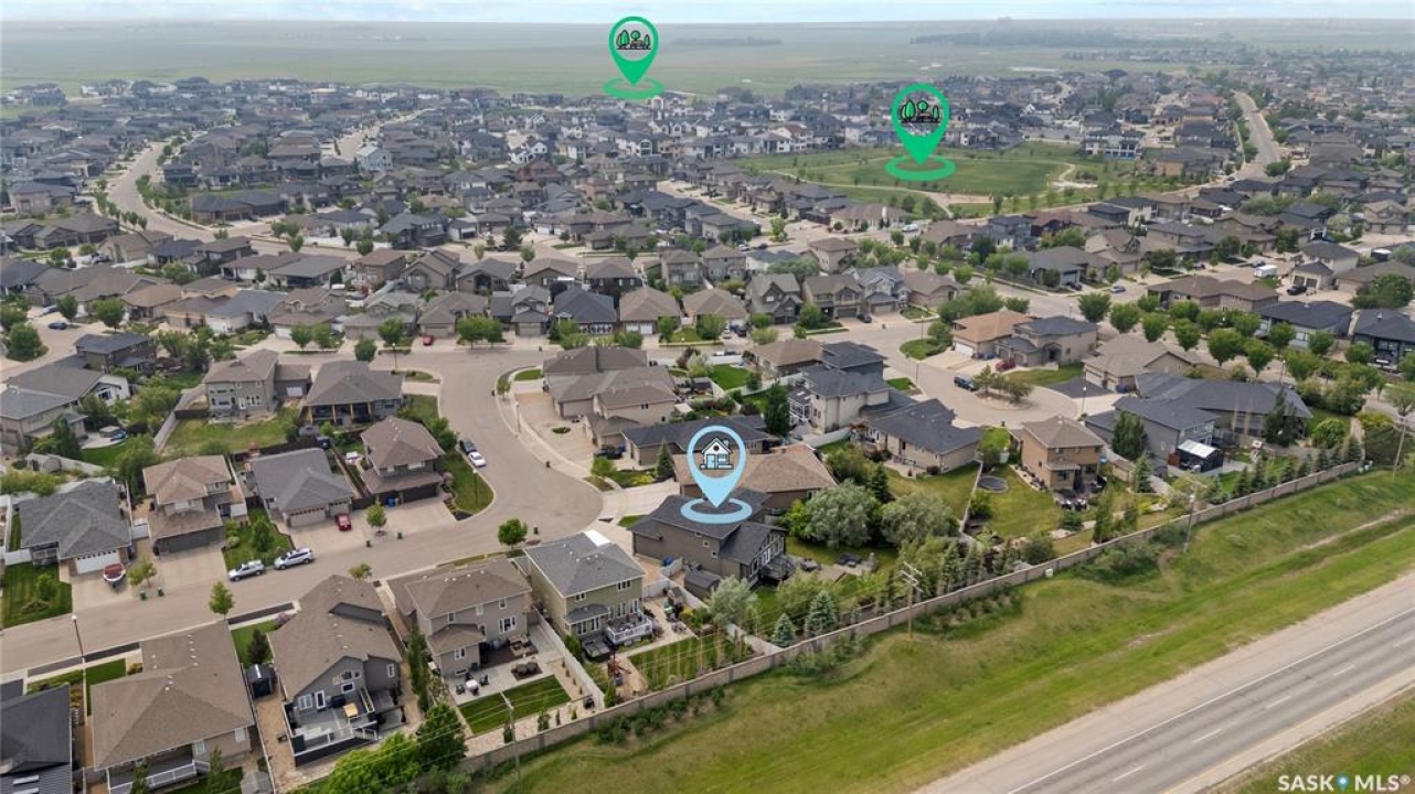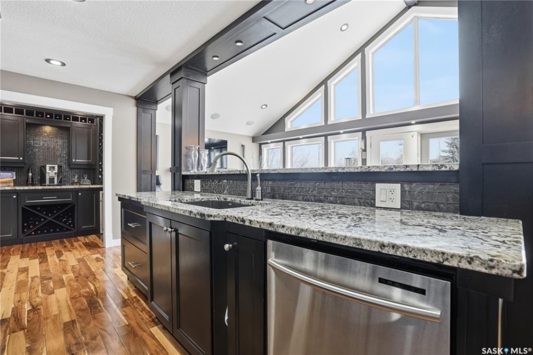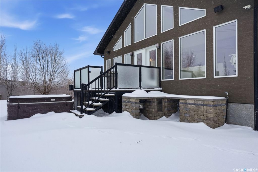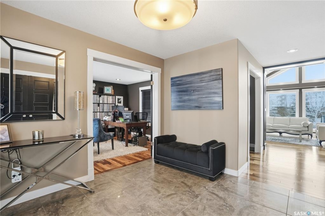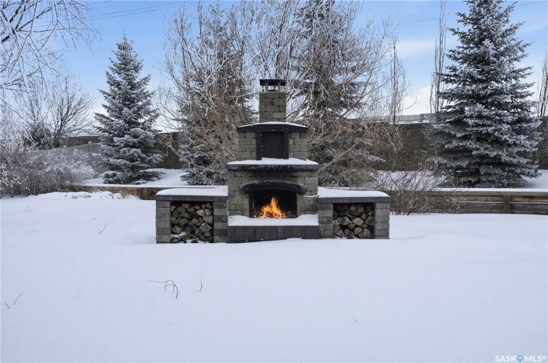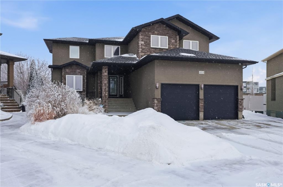 Stunning home in the desirable neighbourhood of the Creeks, proudly voted Best Custom Home under 2,400 sq. ft. by the Regina Home Builders' Association in 2012. Built by Stahmann Homes, this property showcases exceptional craftsmanship and thoughtful attention to detail throughout. The striking stone exterior offers beautiful street appeal, complemented by wide concrete steps leading to a covered front veranda. Inside, you're welcomed by a tiled entryway that opens to a bright and functional main-floor office, perfectly sized at 12' x 12' with two large windows allowing natural light to flow through. The kitchen is designed for both everyday living and entertaining, with sightlines to the living and dining areas and lovely views of the park-like backyard. It features custom stained maple cabinetry, granite countertops, a gas range, stainless steel appliances, and a convenient butler's pantry. Rich tigerwood walnut flooring adds warmth and elegance to the main living space. Spacious living room and dining room combination with soaring vaulted ceilings, built-in speakers and natural gas fireplace. Upstairs, you'll find three bedrooms, including a spacious primary retreat complete with in-ceiling speakers and a spa-inspired ensuite featuring ceramic tile flooring, a 5' tiled walk-in shower, and a jetted tub. The basement is nearly complete and offers a fourth bedroom, recreation room, and a 3-piece bathroom, just waiting for your finishing touches. Step outside and prepare to be impressed by the meticulously maintained backyard, with 27 planted trees, an outdoor kitchen, a wood-burning firepit, and hot tub is perfect for entertaining or relaxing year-round. A powered storage shed and underground sprinklers in both the front and back yards complete this exceptional property.