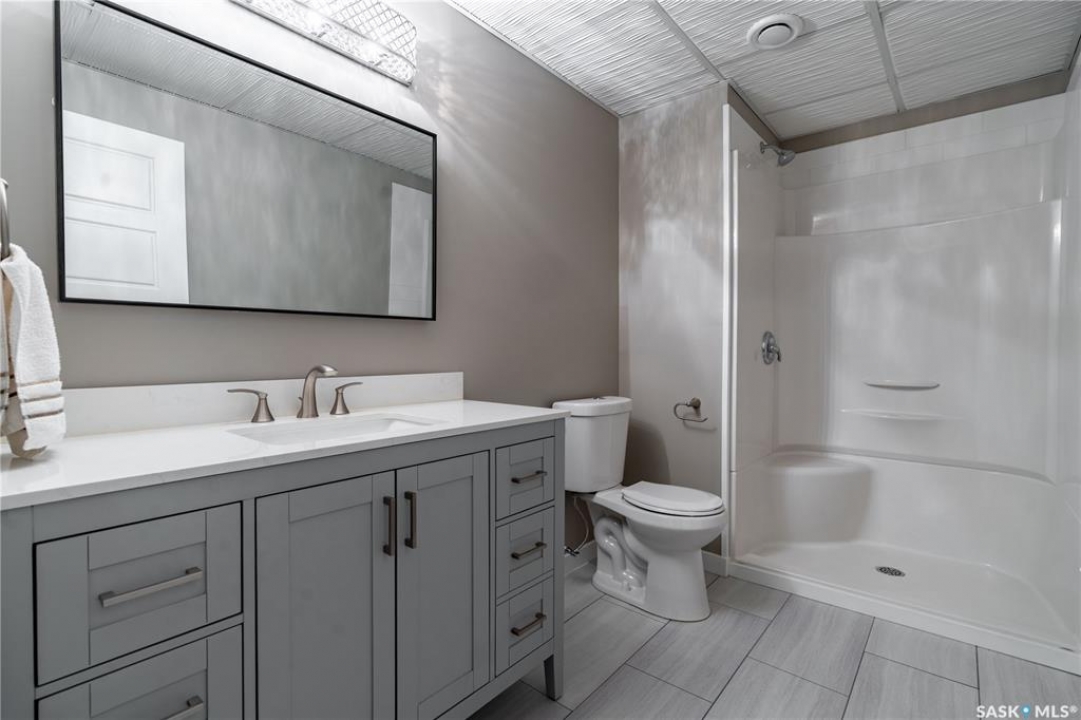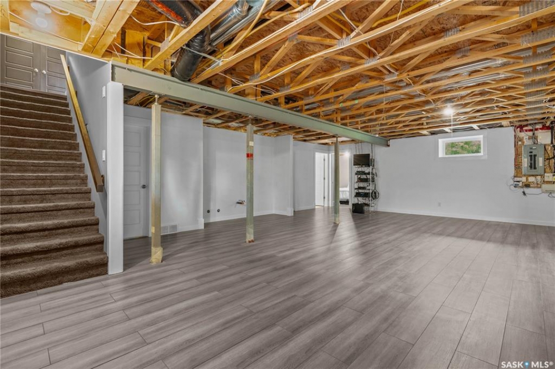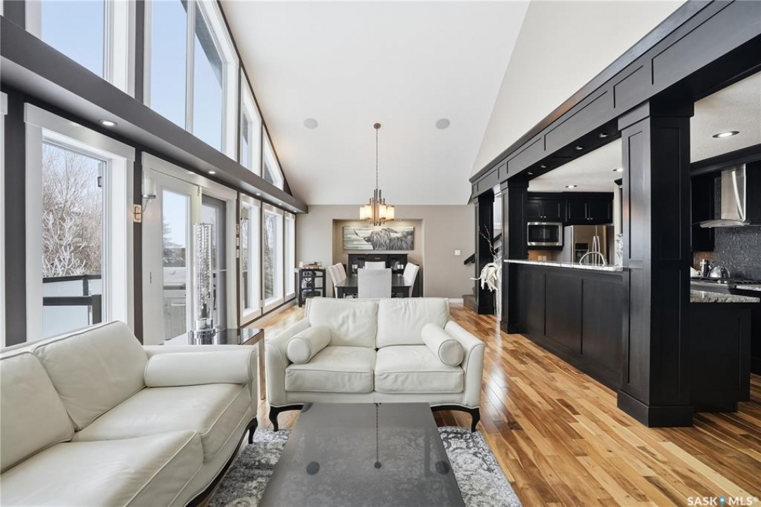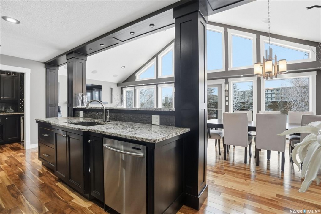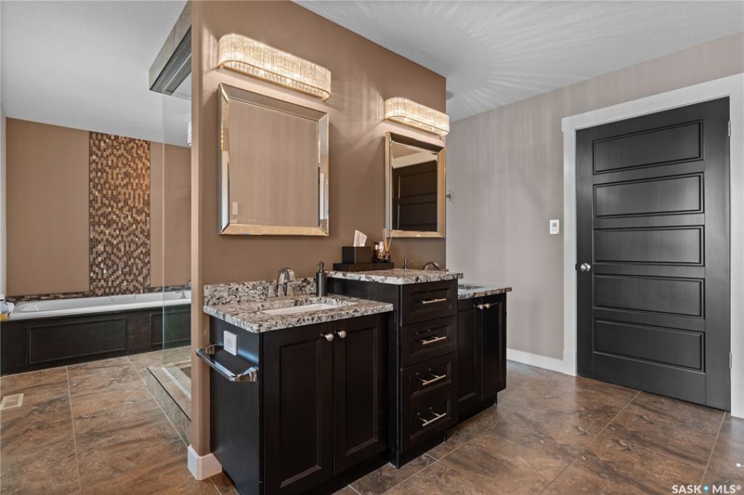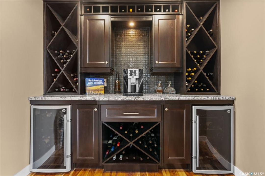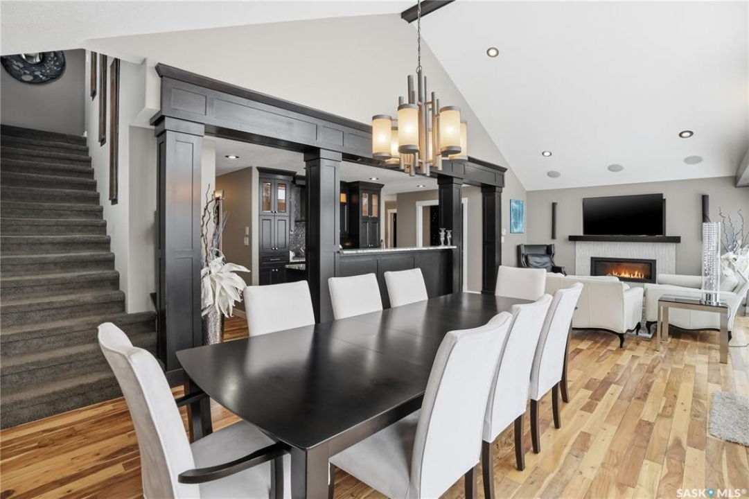 Stunning home in the desirable neighbourhood of the Creeks, proudly voted Best Custom Home under 2,400 sq. ft. by the Regina Home Builders' Association in 2012. Built by Stahmann Homes, this property showcases exceptional craftsmanship and thoughtful attention to detail throughout. The striking stone exterior offers beautiful street appeal, complemented by wide concrete steps leading to a covered front veranda. Inside, you're welcomed by a tiled entryway that opens to a bright and functional main-floor office, perfectly sized at 12' x 12' with two large windows allowing natural light to flow through. The kitchen is designed for both everyday living and entertaining, with sightlines to the living and dining areas and lovely views of the park-like backyard. It features custom stained maple cabinetry, granite countertops, a gas range, stainless steel appliances, and a convenient butler's pantry. Rich tigerwood walnut flooring adds warmth and elegance to the main living space. Spacious living room and dining room combination with soaring vaulted ceilings, built-in speakers and natural gas fireplace. Upstairs, you'll find three bedrooms, including a spacious primary retreat complete with in-ceiling speakers and a spa-inspired ensuite featuring ceramic tile flooring, a 5' tiled walk-in shower, and a jetted tub. The basement is nearly complete and offers a fourth bedroom, recreation room, and a 3-piece bathroom, just waiting for your finishing touches. Step outside and prepare to be impressed by the meticulously maintained backyard, with 27 planted trees, an outdoor kitchen, a wood-burning firepit, and hot tub is perfect for entertaining or relaxing year-round. A powered storage shed and underground sprinklers in both the front and back yards complete this exceptional property.