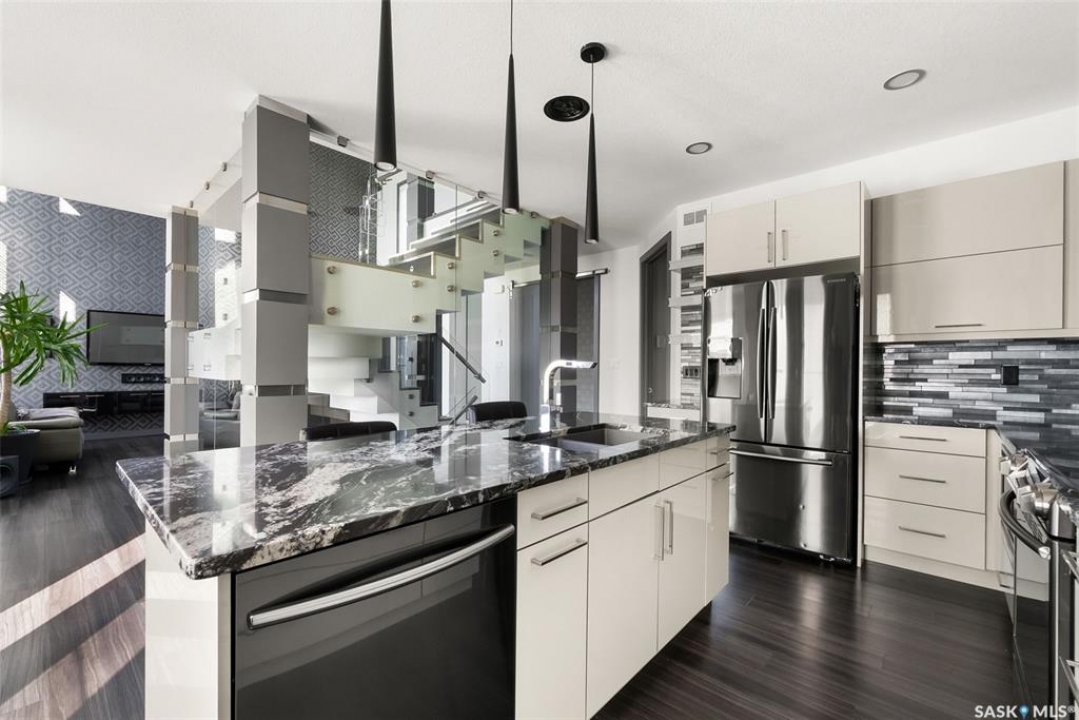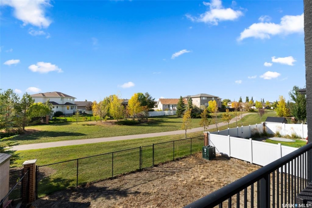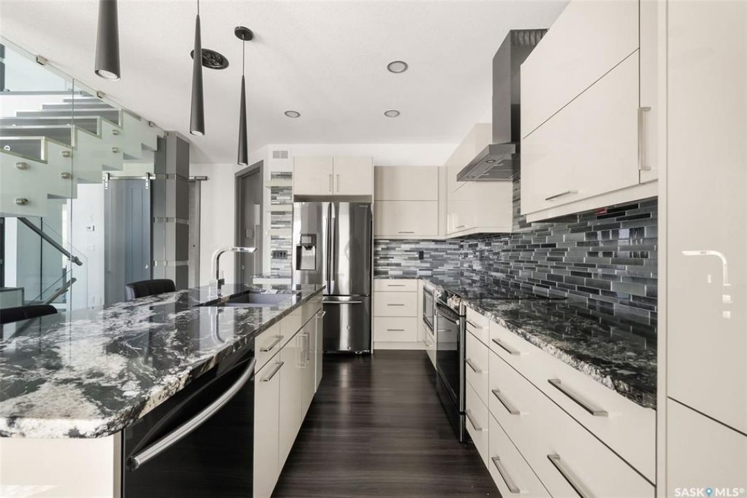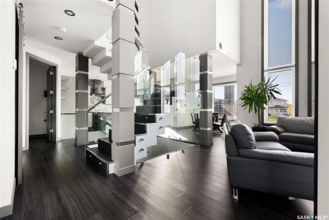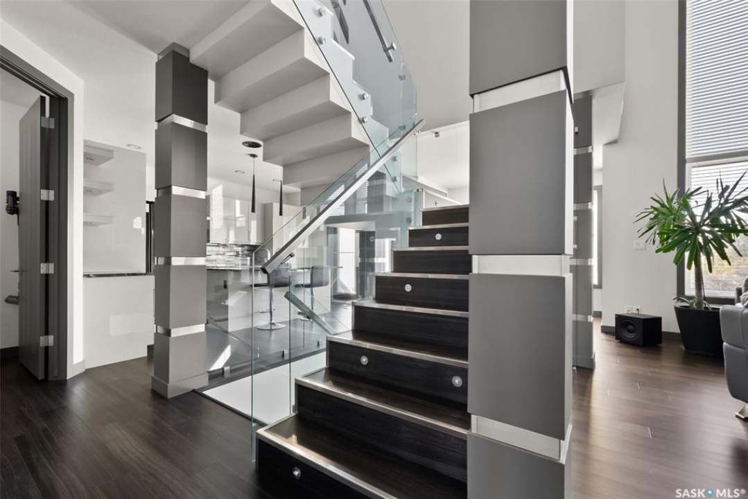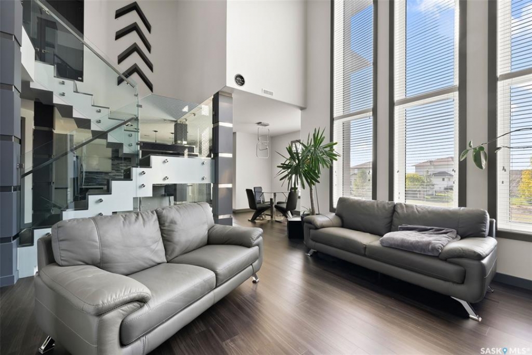 Welcome to this stunning custom-built walkout in Fairways West! This home is in a prime location and backs the beautiful green space and walking path leading to the Goulet Golf Course. The moment you step inside, 19-foot ceilings and floor-to-ceiling windows create a dramatic sense of space and light. A striking glass-and-stainless steel staircase, accented with subtle stair lighting, introduces the home's modern, refined style. The kitchen is both beautiful and practical, featuring custom white cabinetry, a generous sit-up island, granite countertops and premium stainless-steel appliances. There is garden door access from the kitchen which opens onto a private west-facing deck—ideal for morning coffee or evening entertaining while taking in the peaceful green space. Upstairs you'll find the primary retreat, complete with a walk-in closet and a luxurious five-piece ensuite featuring dual vanities, a stand-alone soaker tub and a custom-tiled shower. Two additional bedrooms, a four-piece bath, and a convenient laundry room complete this level. The fully developed walkout basement is built for entertaining or unwinding after a long day. The rec room is set up as a perfect home theatre complete with a projector screen and built-in sound system! A sleek wet bar adds style and convenience, while the fourth bedroom doubles as a guest room, office, or home gym. Expansive windows keep the space bright and welcoming. The oversized double attached garage is a standout—heated, drywalled and equipped with 12-foot ceilings, a floor drain, and water taps. There are built-in speakers throughout the house and receivers are all included. Every detail in this home combines contemporary design with practical luxury. Discover a residence where craftsmanship and lifestyle meet in one exceptional property. This Fairways West show piece is one you do not want to miss out on!