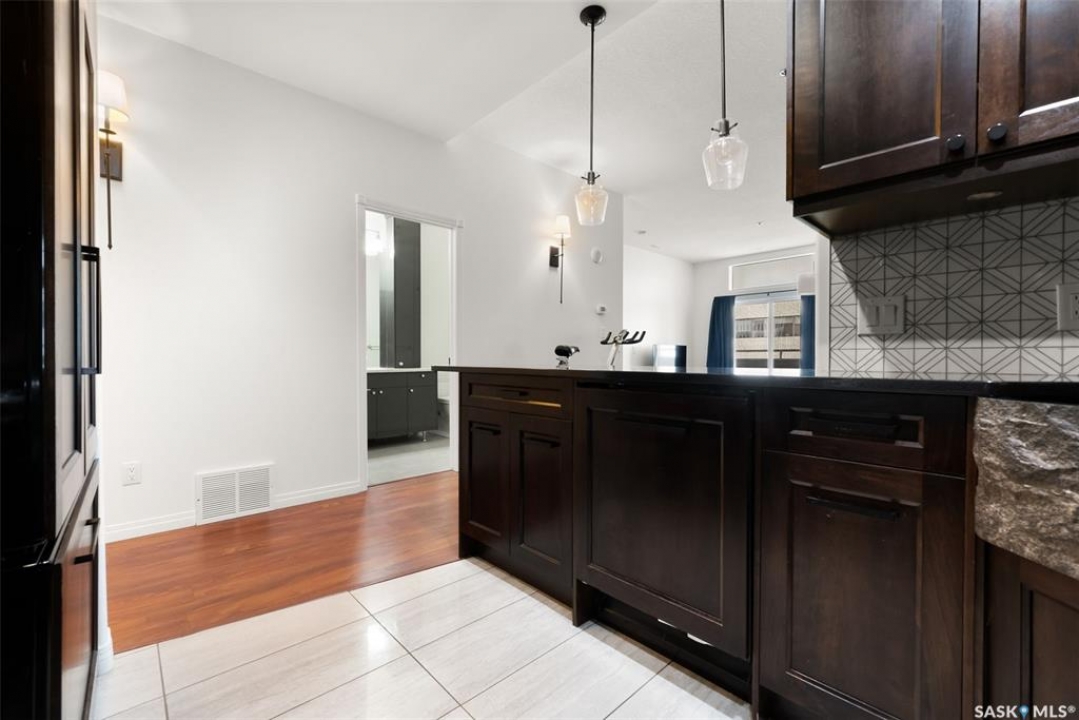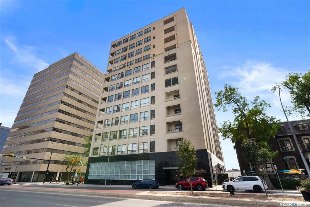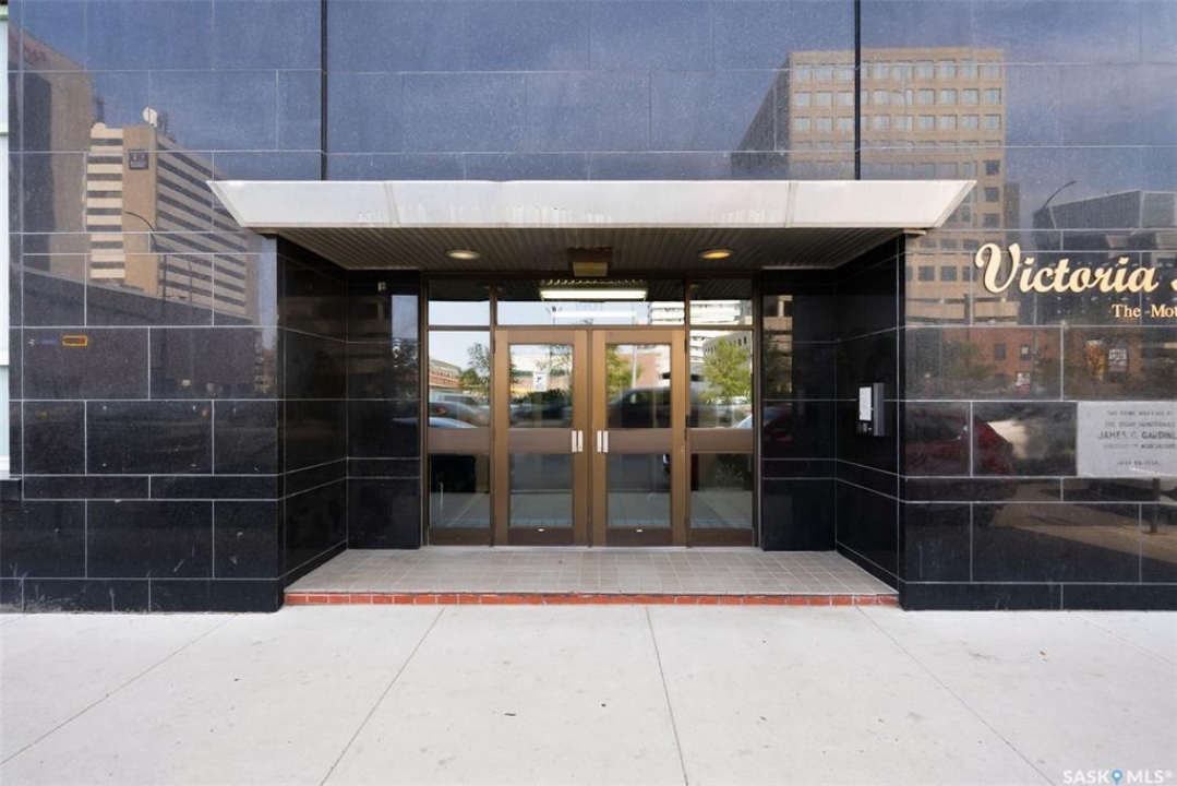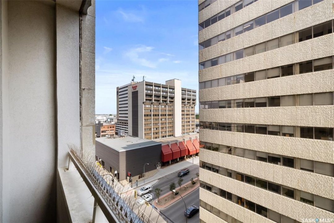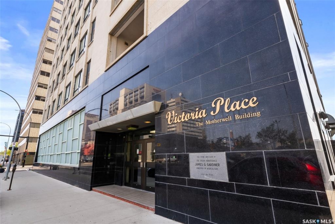 Welcome to the 7th floor of Victoria Place; where refined luxury meets the convenience of downtown Regina. This impeccably designed residence offers the ultimate urban lifestyle, just steps from some of the city's finest dining, shopping, and entertainment options. From the moment you enter, you'll be captivated by the high-end finishes and thoughtfully curated details throughout. Soaring 10-foot ceilings and a fresh, modern palette set the tone, complemented by elegant tile and laminate flooring that seamlessly unify the space. The show stopping kitchen, featuring quartz countertops, full-height custom cabinetry, integrated appliances, under cabinet lighting and a distinctive raw-edge sink combines form and function with striking visual appeal. The spacious open-concept living and dining area is bathed in natural light from the east-facing balcony doors, creating a warm and inviting ambiance. Step outside to enjoy your private balcony, the perfect spot for a morning espresso or an evening escape. Retreat to the beautifully appointed bedroom, featuring an artistic accent wall that adds personality and charm to the serene space. The den provides office space, or whatever your needs require, for flexible versatility. The stylish 4-piece bathroom offers bright, modern tiling and ample storage, while in-suite laundry and a private balcony storage room enhance daily convenience. Constructed with solid concrete, the building ensures exceptional soundproofing and long-lasting quality; providing peace, privacy, and a true sense of sanctuary in the heart of the city. Don't miss this rare opportunity to own a piece of luxury in one of Regina's most iconic downtown addresses. Urban sophistication awaits.