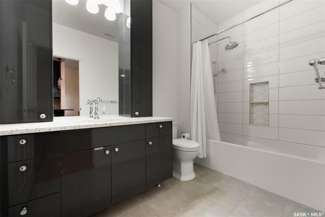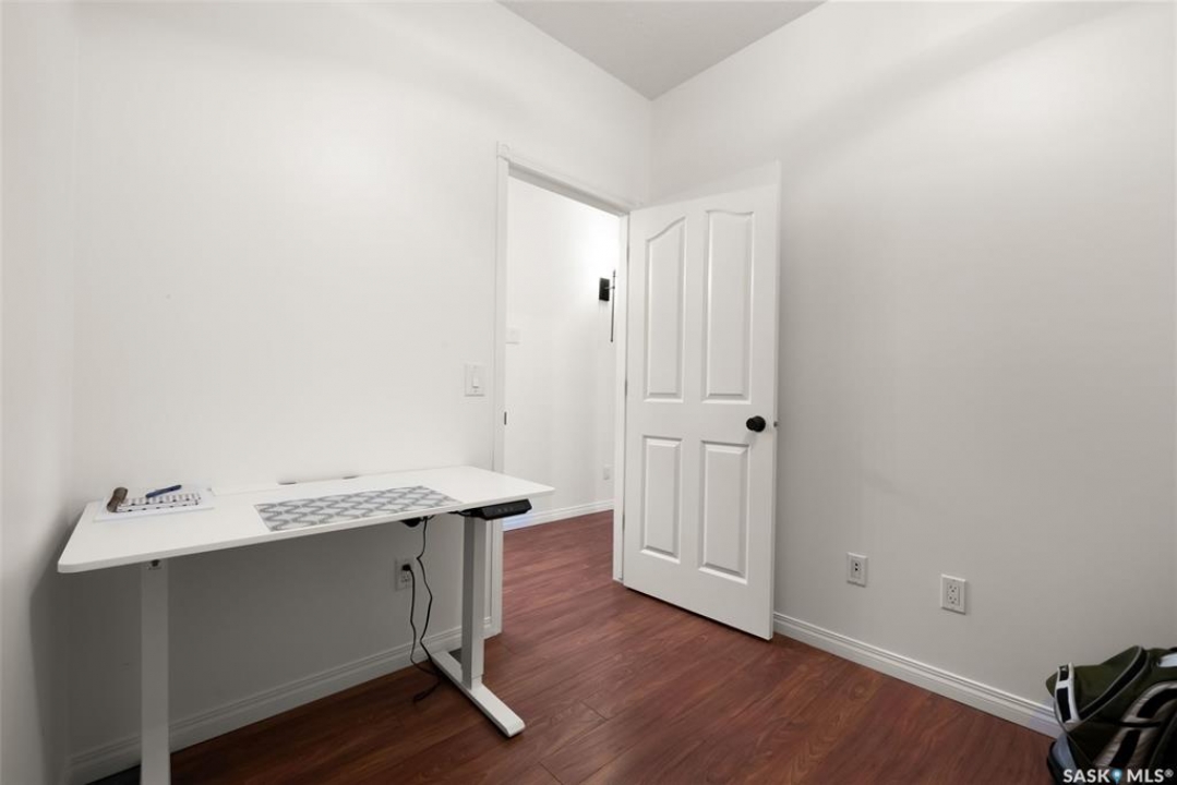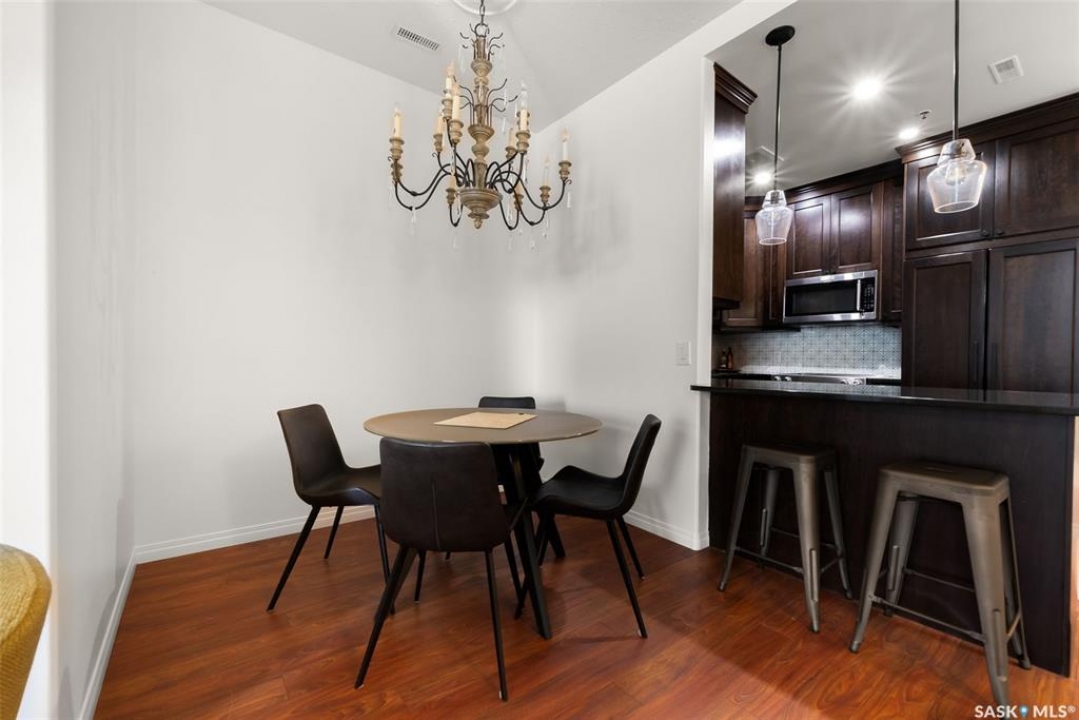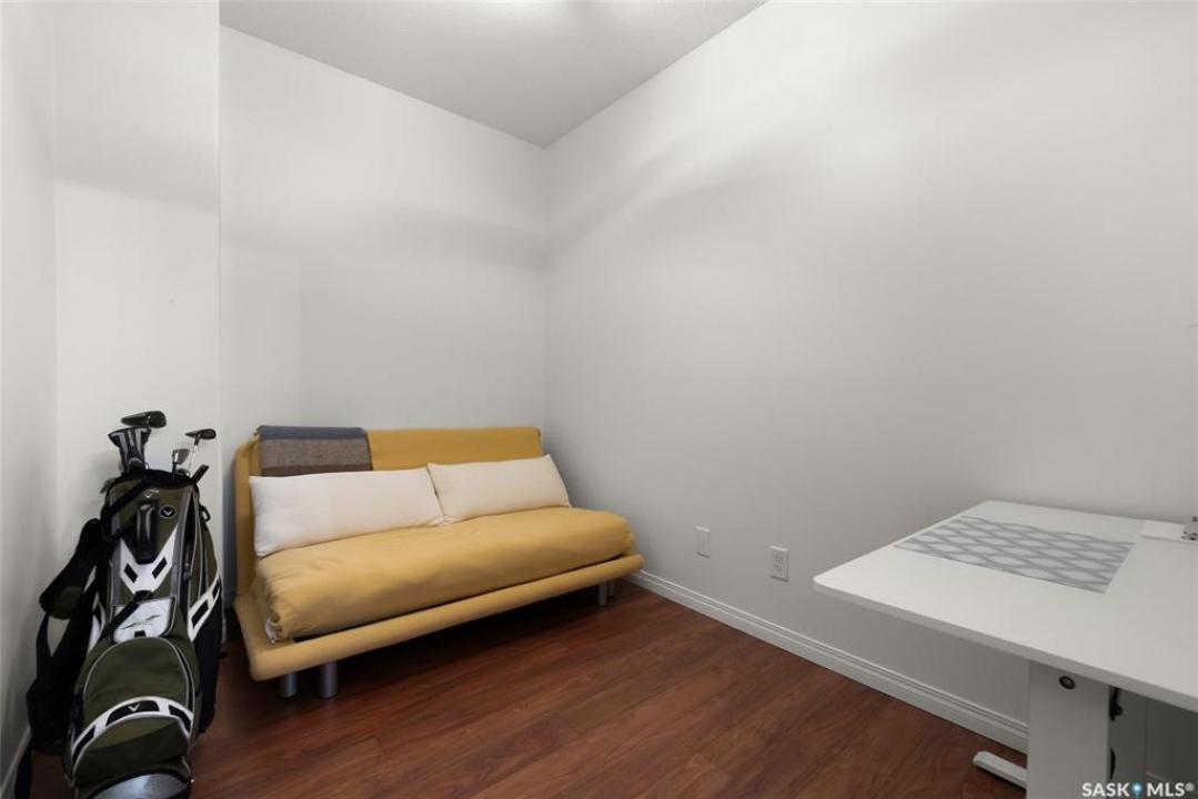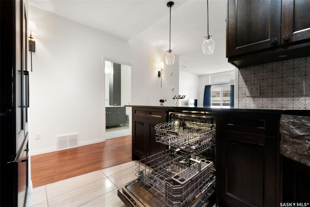 Welcome to the 7th floor of Victoria Place; where refined luxury meets the convenience of downtown Regina. This impeccably designed residence offers the ultimate urban lifestyle, just steps from some of the city's finest dining, shopping, and entertainment options. From the moment you enter, you'll be captivated by the high-end finishes and thoughtfully curated details throughout. Soaring 10-foot ceilings and a fresh, modern palette set the tone, complemented by elegant tile and laminate flooring that seamlessly unify the space. The show stopping kitchen, featuring quartz countertops, full-height custom cabinetry, integrated appliances, under cabinet lighting and a distinctive raw-edge sink combines form and function with striking visual appeal. The spacious open-concept living and dining area is bathed in natural light from the east-facing balcony doors, creating a warm and inviting ambiance. Step outside to enjoy your private balcony, the perfect spot for a morning espresso or an evening escape. Retreat to the beautifully appointed bedroom, featuring an artistic accent wall that adds personality and charm to the serene space. The den provides office space, or whatever your needs require, for flexible versatility. The stylish 4-piece bathroom offers bright, modern tiling and ample storage, while in-suite laundry and a private balcony storage room enhance daily convenience. Constructed with solid concrete, the building ensures exceptional soundproofing and long-lasting quality; providing peace, privacy, and a true sense of sanctuary in the heart of the city. Don't miss this rare opportunity to own a piece of luxury in one of Regina's most iconic downtown addresses. Urban sophistication awaits.