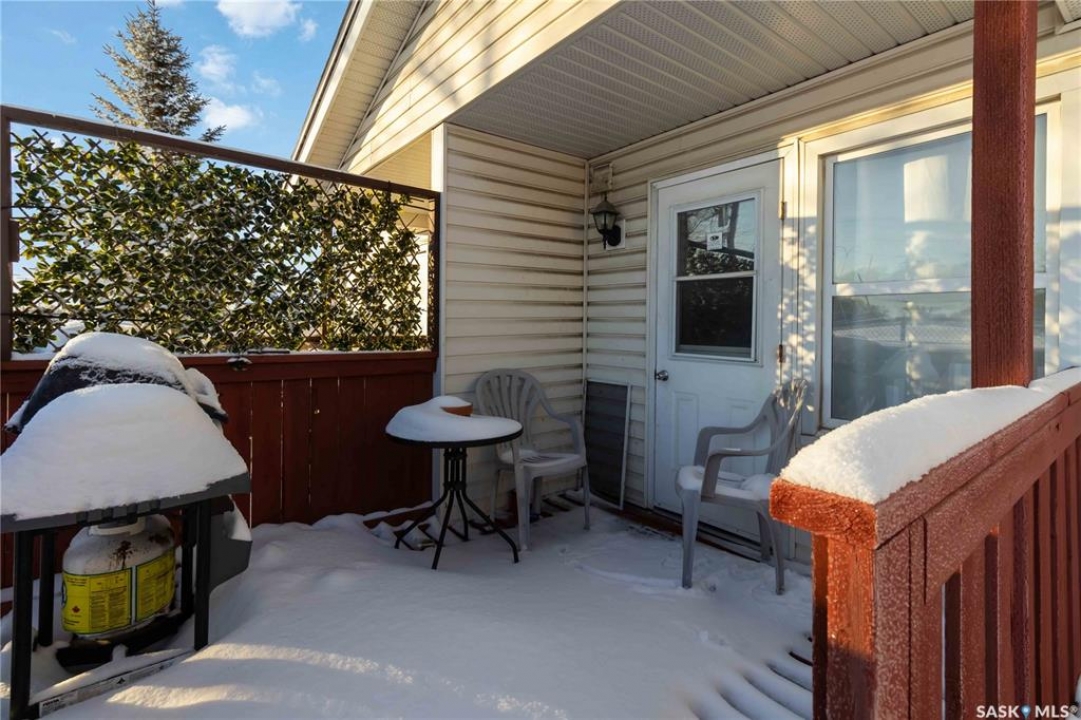 Welcome to 209 Camponi Place! This bright and affordable two-story townhouse offers the perfect blend of comfort and convenience. As you arrive, you'll appreciate the visitor parking and your own exclusive electrified stall. A charming covered front step protects you from the elements as you enter a spacious living room bathed in natural light from large windows. The open-concept kitchen and dining area features a functional pantry and garden door access to a private, east-facing deck—ideal for morning coffee or hosting summer gatherings. Upstairs, a classic wide staircase leads to a massive primary bedroom, a generous second bedroom, and a clean 4-piece bathroom, all featuring beautiful wood flooring. The unfinished basement is a blank canvas, roughed-in for a second bathroom and large enough for two additional bedrooms. One of the best perks? The condo fees cover almost everything, including heat, water, sewer, and even the power for your parking stall. With no furnace or water heater to maintain and a pet-friendly policy, this is worry-free living at its finest!